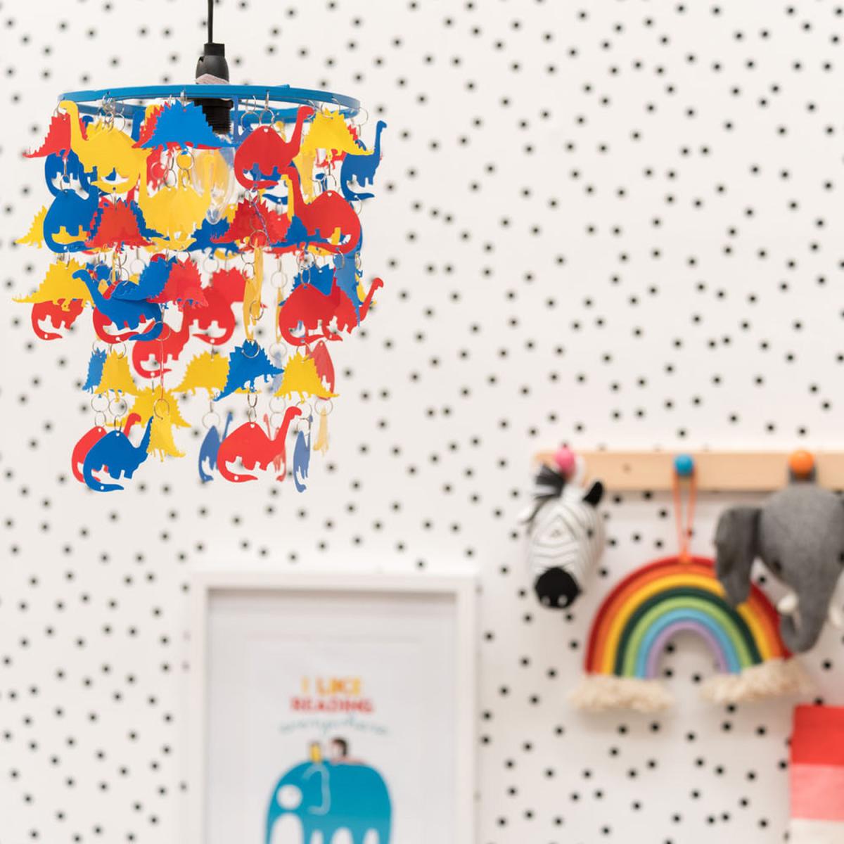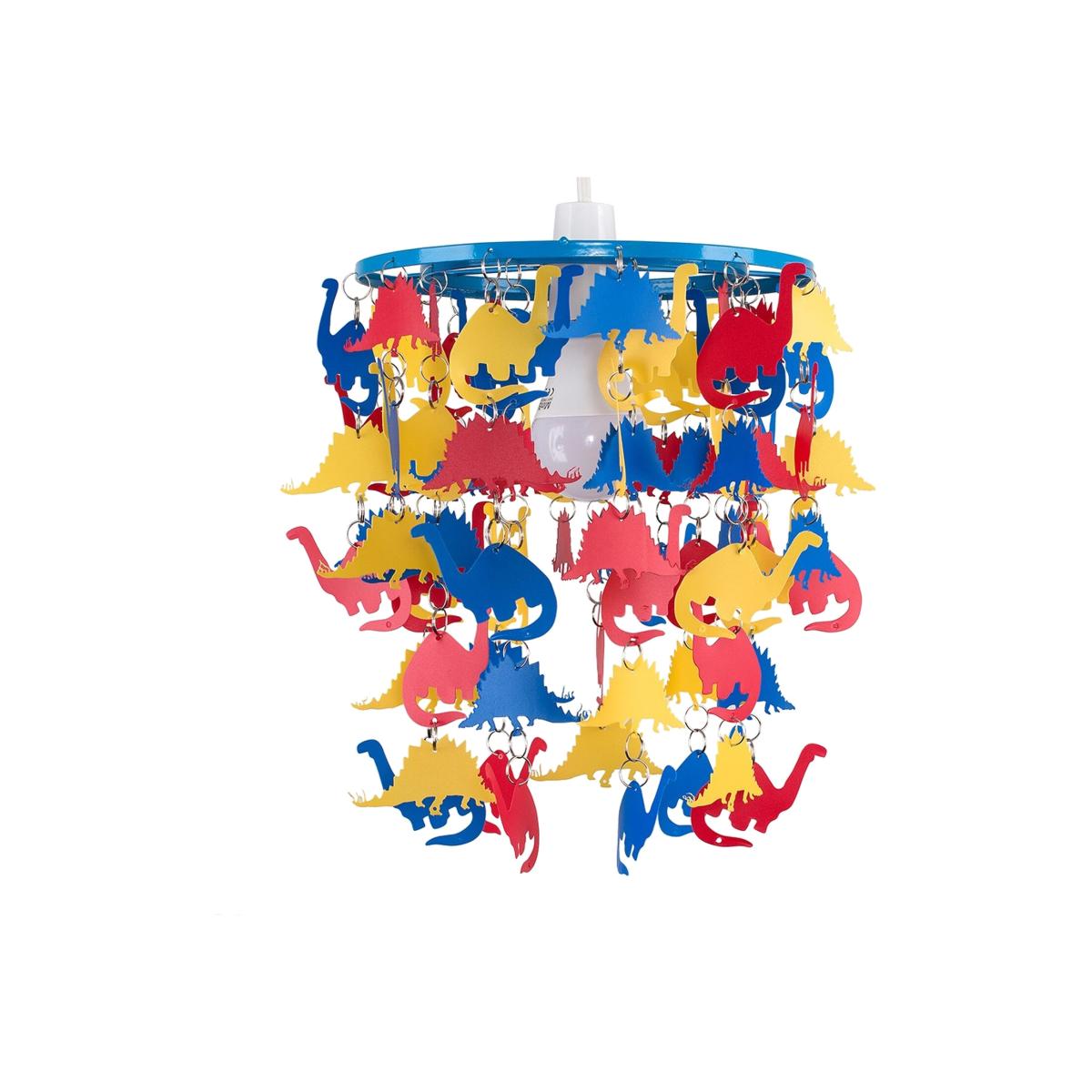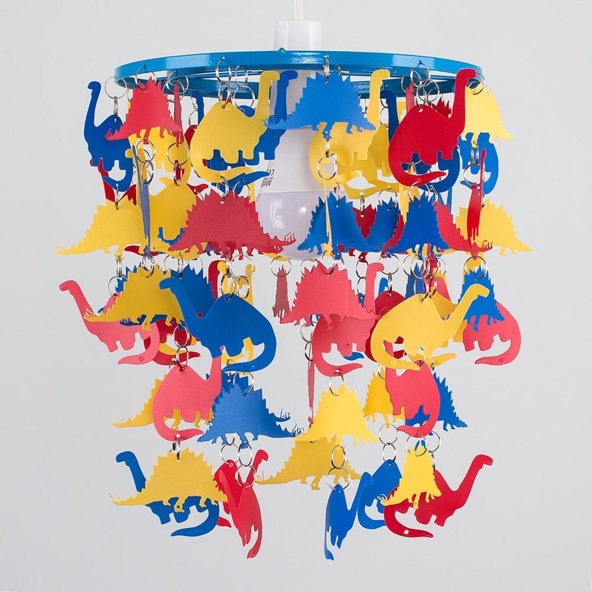 Red, blue and yellow Dinosaur ceiling pendant light shade. Ideal for a child's bedroom or nursery. Easily fits to an existing lamp holder and transforms a room in a matter of seconds - no electrical installation required. The ideal bulb to use with this product is a 60w BC GLS bulb.