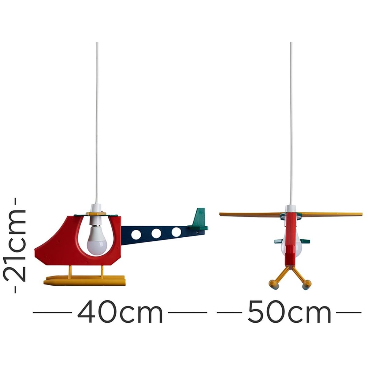 A fantastic addition to a young child's bedroom, this cool and exciting ceiling pendant light shade comes in a brilliant colourful 3D helicopter design, complete with landing gear and propellers! Finished in bright and vibrant blue, yellow, green and red, this is ideal as a kids gift or for simply updating a young boy's bedroom with a bit of fun. The bulb is positioned inside the aircraft cockpit, with the flex connecting to the copter. 1 x 60w BC B22 GLS bulb is required - not supplied.