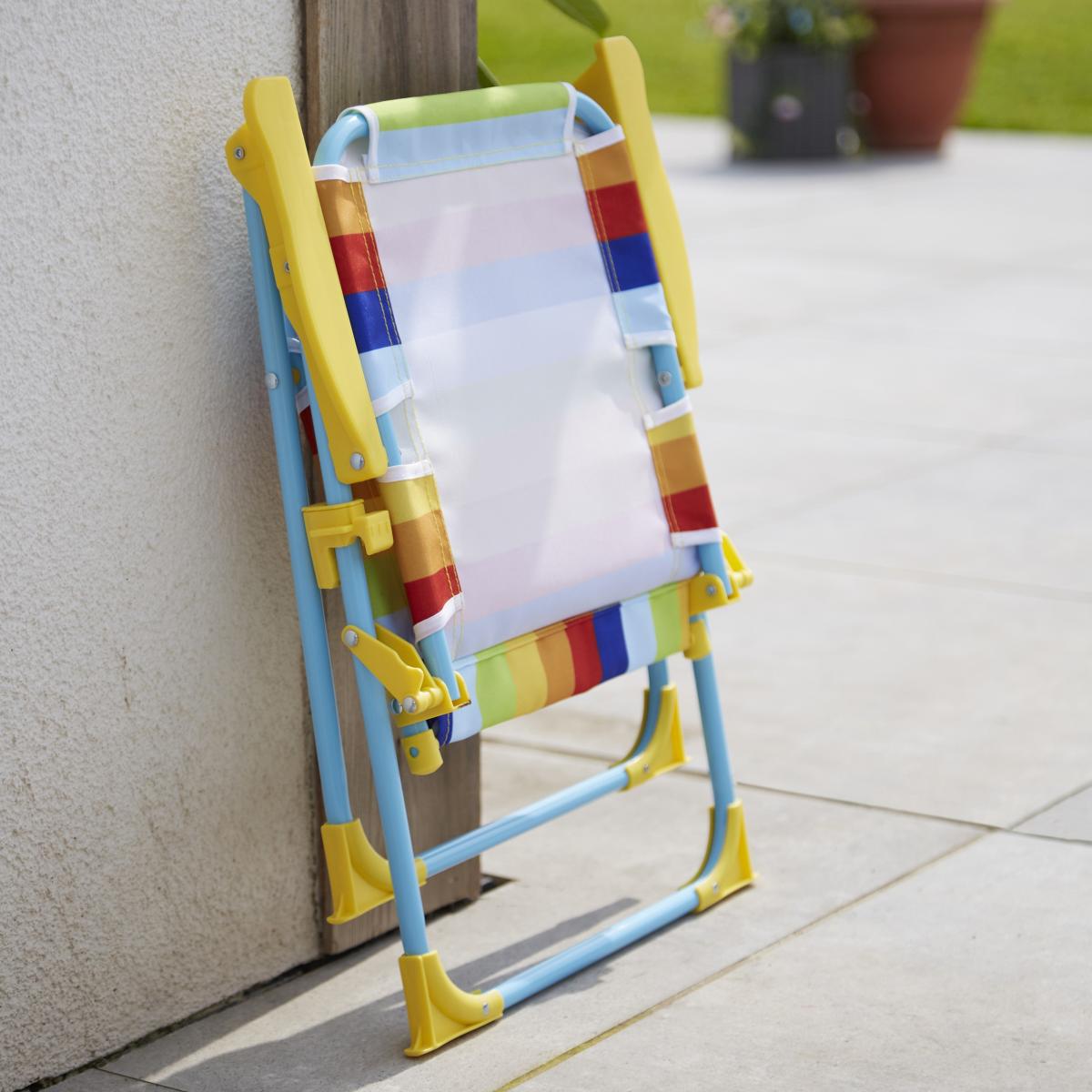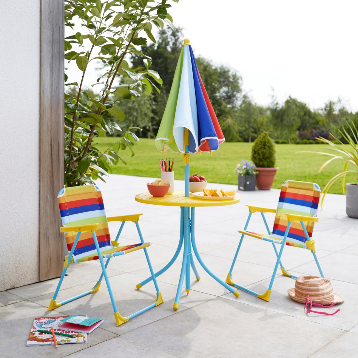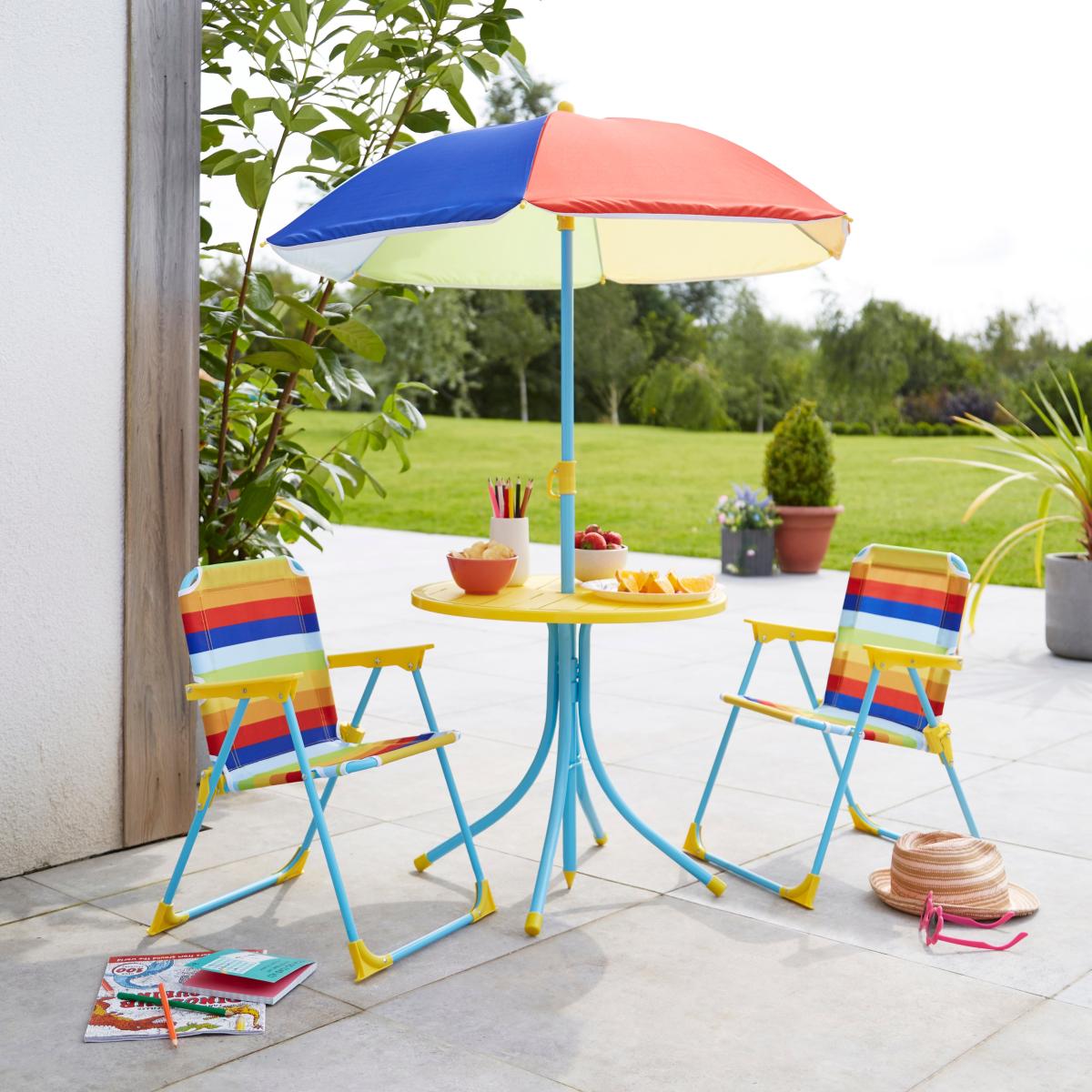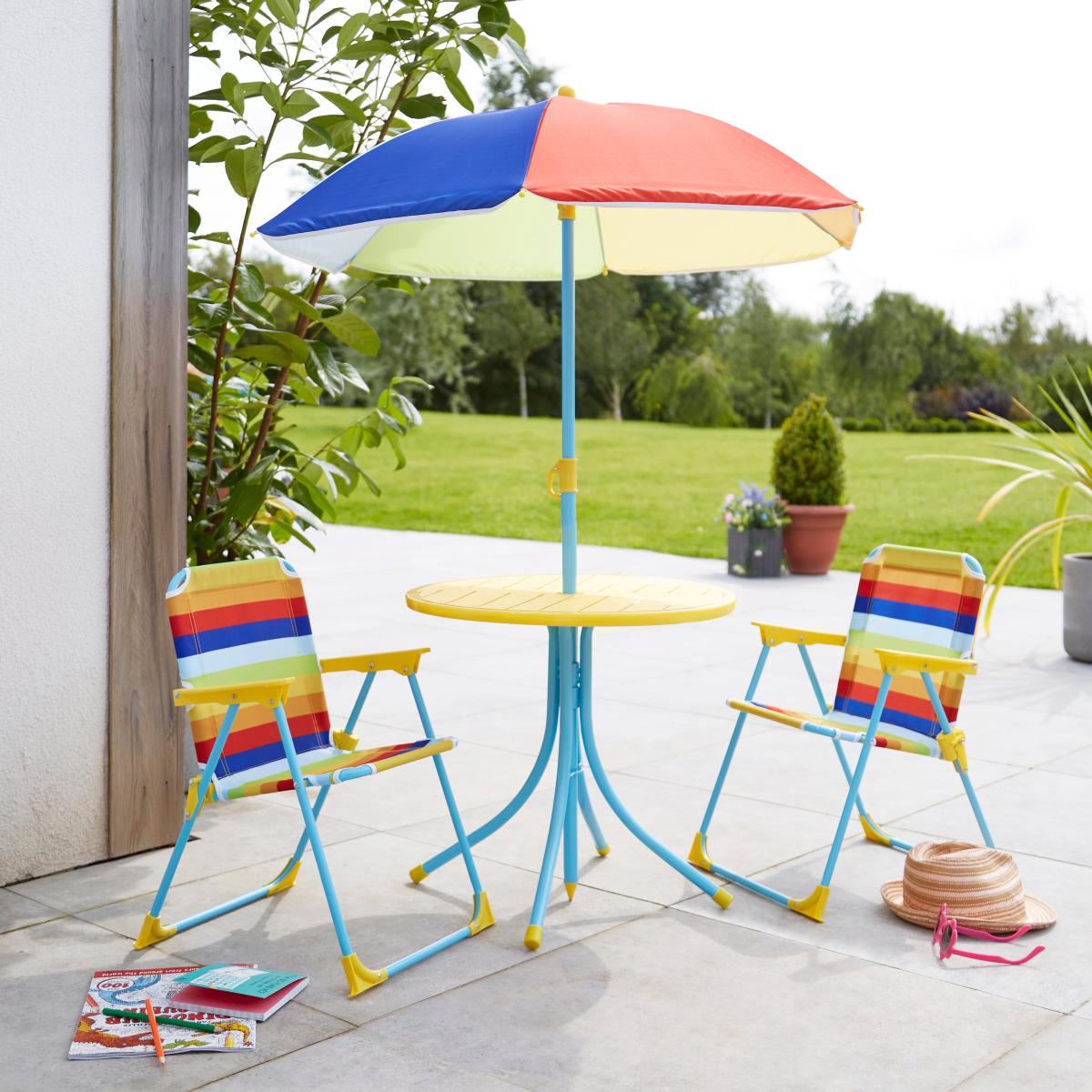 * Brightly coloured * Strong and durable * Lightweight * Umbrella included * Max. User weight: 30kg Bring fun and colour to outdoor play with this vibrant rainbow patio set, perfect for little ones to enjoy sunshine-filled days. Designed with a sturdy metal frame, the table and chairs offer a solid and durable structure for safe seating. The set includes two foldable chairs for easy storage and a matching six-bone umbrella to provide shade on warm days. Lightweight and easy to carry, it’s ideal for use in gardens, patios, or backyards. Whether for snack time, arts and crafts, or imaginative play, this cheerful set encourages social interaction and outdoor fun.