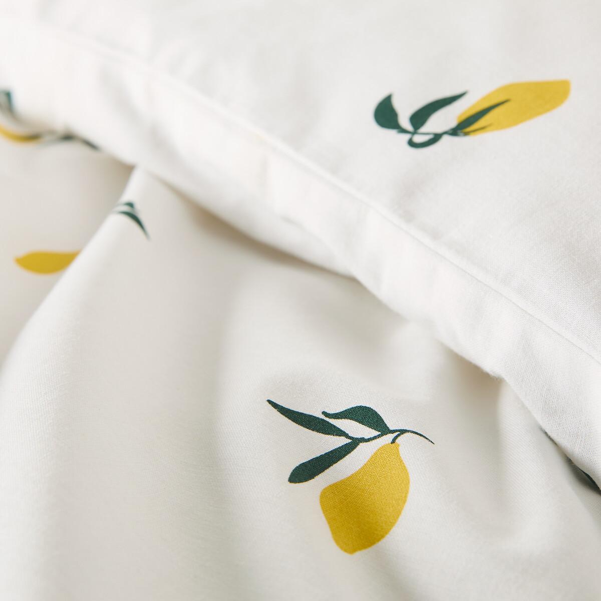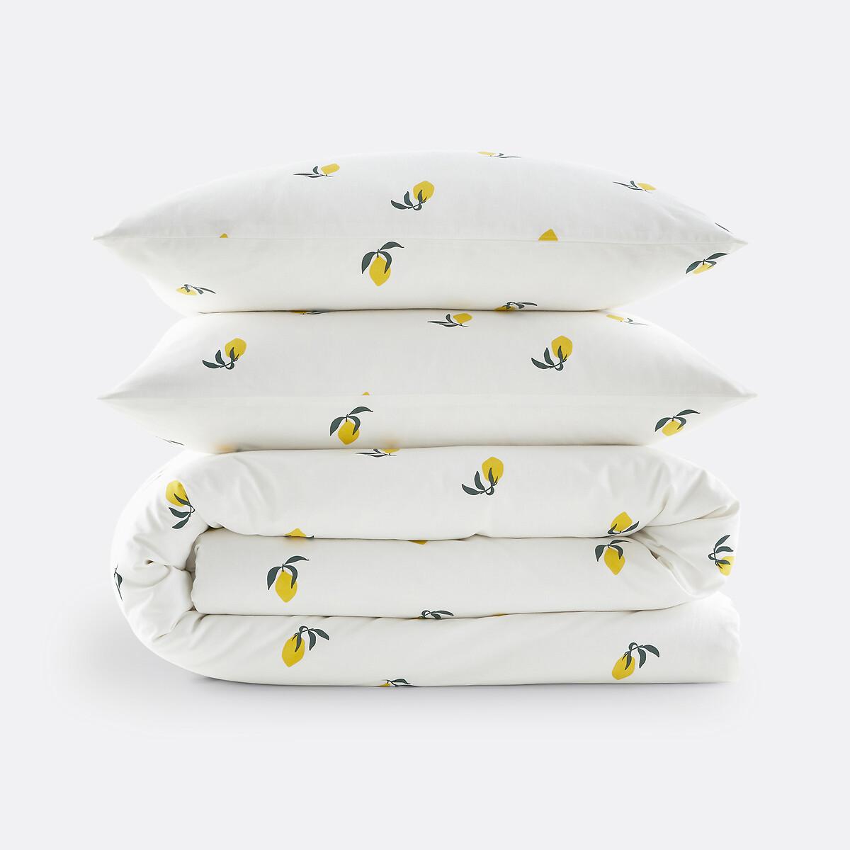 A fresh, tangy lemon print that's sure to brighten up your bedroom. The Citron set is created by La Redoute Intérieurs. Cotton is part of our daily lives. We love it for its suppleness and softness. Easy Care, it is ideal for the beds of young and old alike!Product Details • 100% cotton • Contains 50% recycled cotton • 144 thread count • Recto/verso printed with lemons • Straight buttoned hem. As the seasons go by, add your own personal touch by mixing the Lemon range with our Scenario range of plains. Care Advice • Machine washable at 40°CDimensions • Duvet cover (140 x 200cm) + 1 square pillow case (63 x 63cm): Single • Recycled cotton. Using recycled cotton is all about conserving resources and reducing waste. • OEKO-TEX® Standard 100. Standard 100 certification by OEKO-TEX® tests textile products for harmful substances via an independent, international label.
