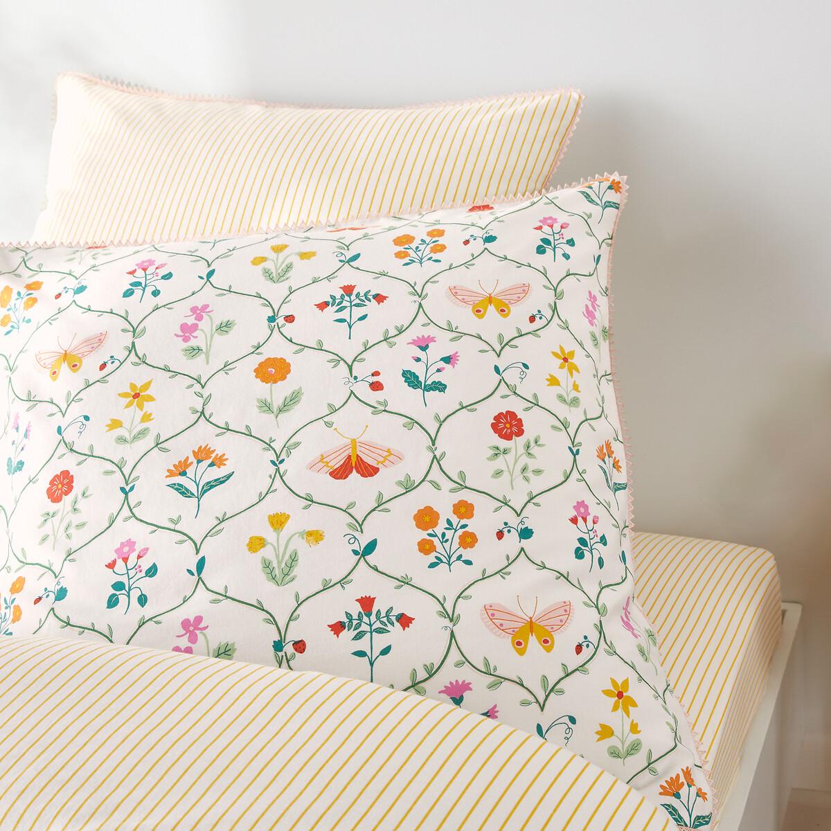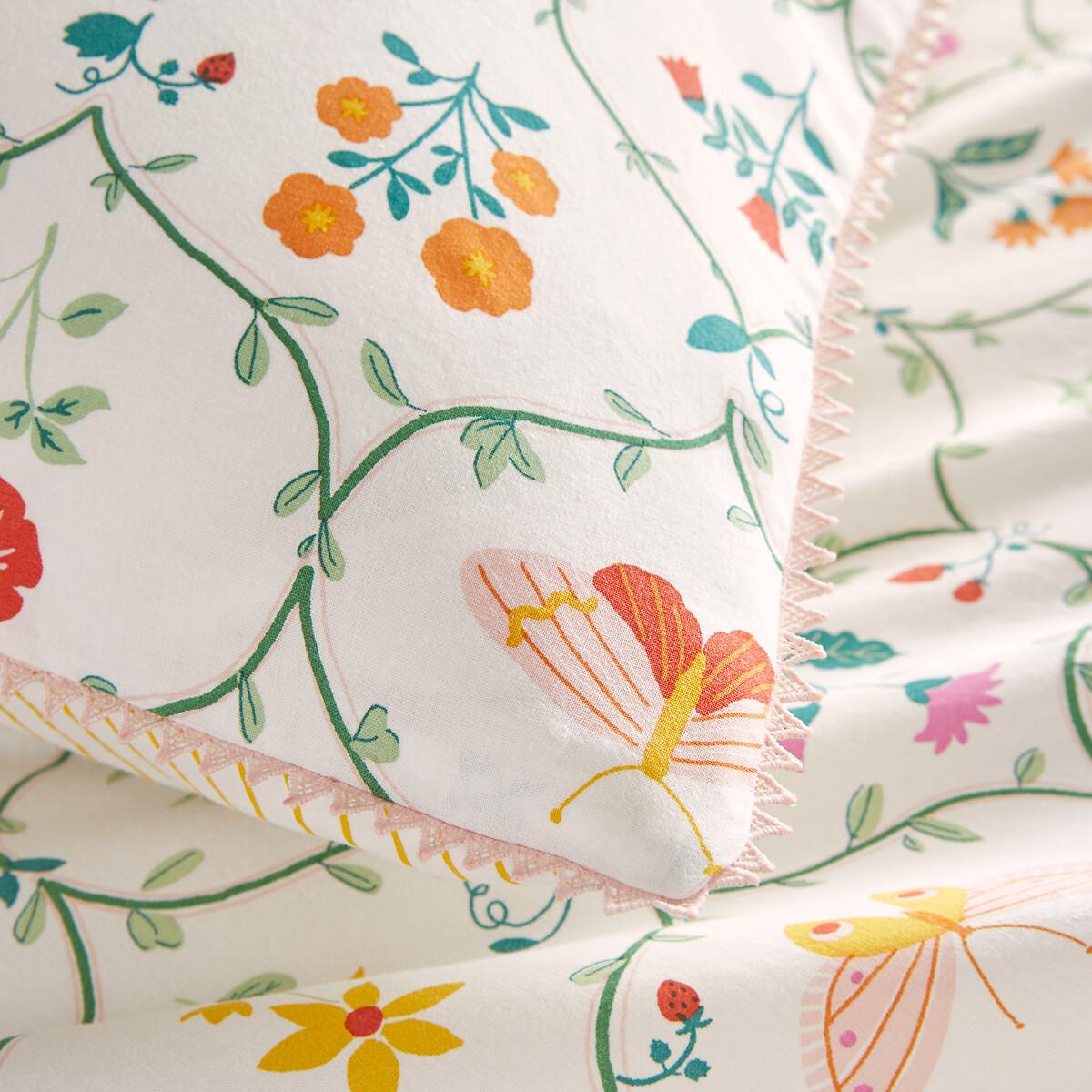 Cheerful colours, flowers and butterflies for this Emily duvet cover, creating an English countryside feel. Designed by La Redoute Interiors. Cotton is part of our daily lives. We love it for its suppleness and softness. Easy Care, it is ideal for the beds of young and old alike!Product Details • 100% cotton • Contains 50% recycled cotton • 144 thread count • Front printed with flowers and butterflies, striped back • Contrast lace ribbon finish. As the seasons change, add your own personal touch by mixing the Emily range with our range of Scenario plain bed linen. Care Advice • Machine washable at 40°CDimensions • 50 x 70cm: Rectangular pillowcase • 63 x 63cm: Square pillowcase • Recycled cotton. Using recycled cotton is all about conserving resources and reducing waste. • OEKO-TEX® Standard 100. Standard 100 certification by OEKO-TEX® tests textile products for harmful substances via an independent, international label.