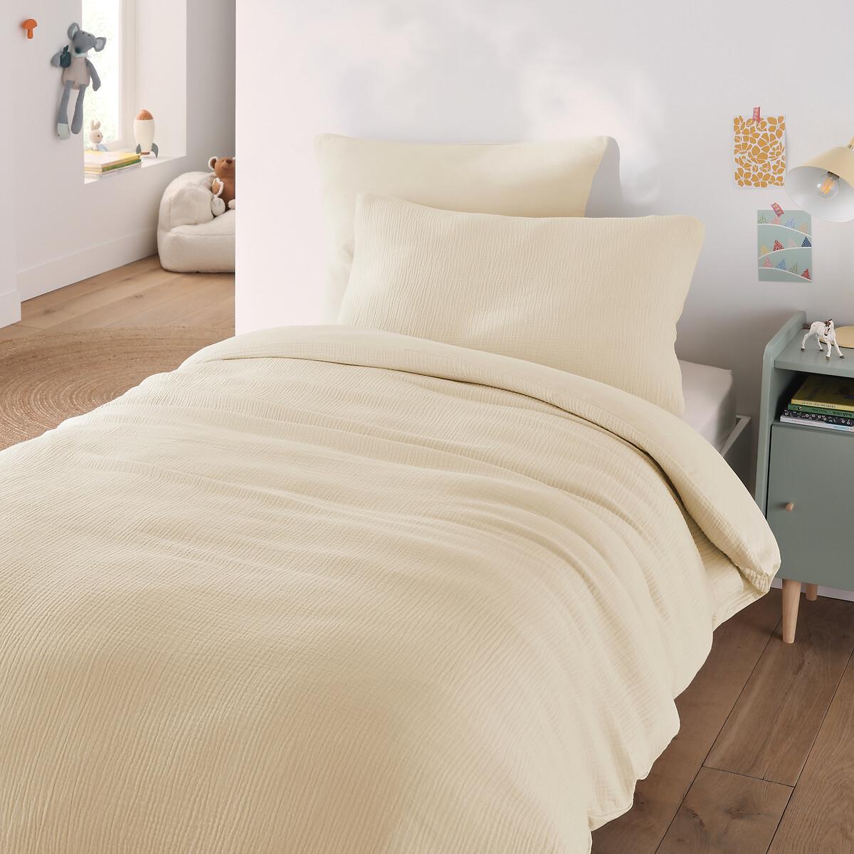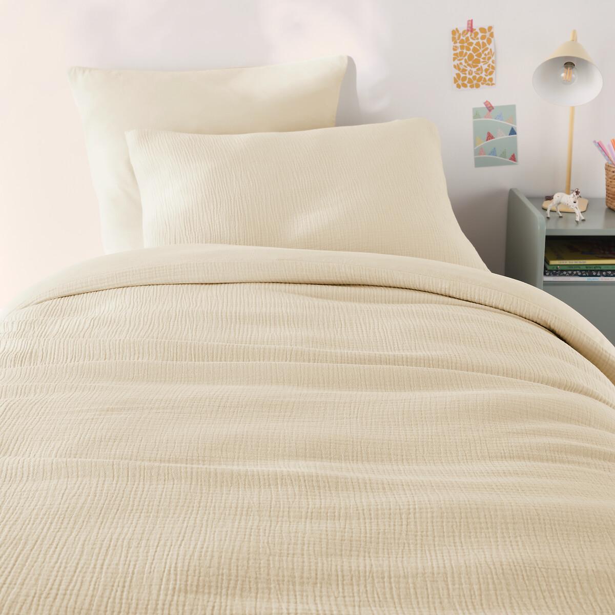 Kumco two-sided bed linen is part of our Les Ingénieux collection. Creations full of ideas to make life simpler and everyday life more beautiful, imagined by our designers in France.. Kumco, two-sided bed linen, beautiful on the front, soft on the back. Why you'll love this product • An alternative to cotton muslin at an affordable price. • A marriage of aesthetics and modernity: the top side is in cotton muslin, textured and elegant, the bottom side is in washed cotton, particularly soft and comfortable. Cotton muslin is light, supple and super soft. Naturally textured, they do not require ironing and become more beautiful over time. The washed cotton has been delicately bleached during its manufacture. Soft, supple and comfortable, it softens over time. Its slightly wrinkled appearance is incredibly on-trend, and it does not require ironing. Product Details • 100% cotton • Cotton muslin front, washed cotton back • Straight buttoned hem Care Advice • Machine washable at 60°C • By washing your laundry at 40°C instead of 60°C, you limit energy consumption. Dimensions • 140 x 200cm: Single • 200 x 200cm: Double • OEKO-TEX® Standard 100. Standard 100 certification by OEKO-TEX® tests textile products for harmful substances via an independent, international label.