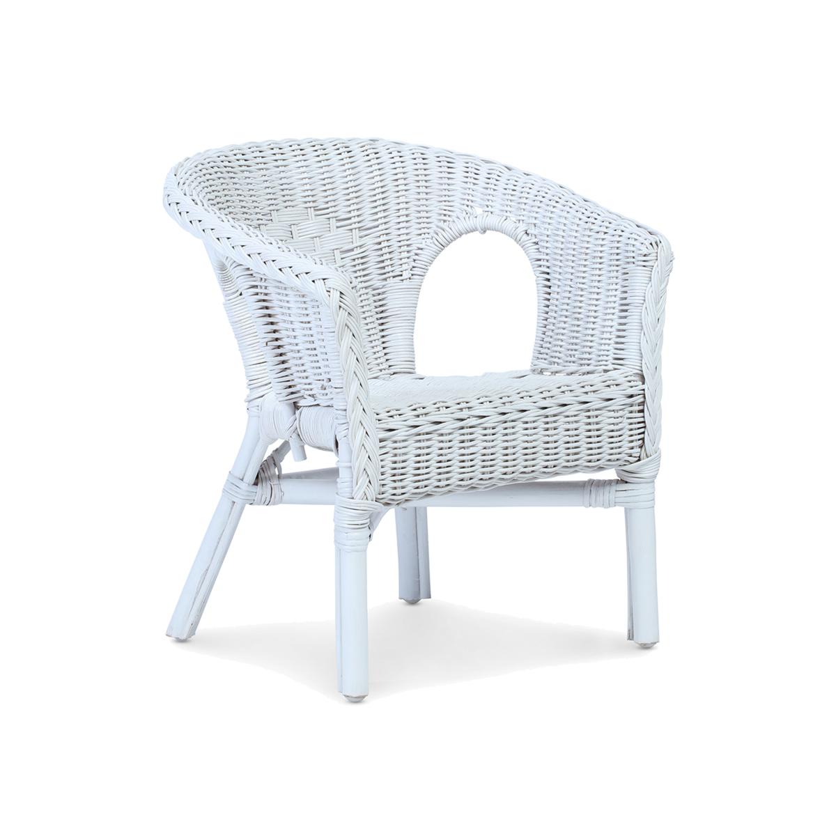 A sustainable natural rattan tub chair for children with a woven wicker frame in white.