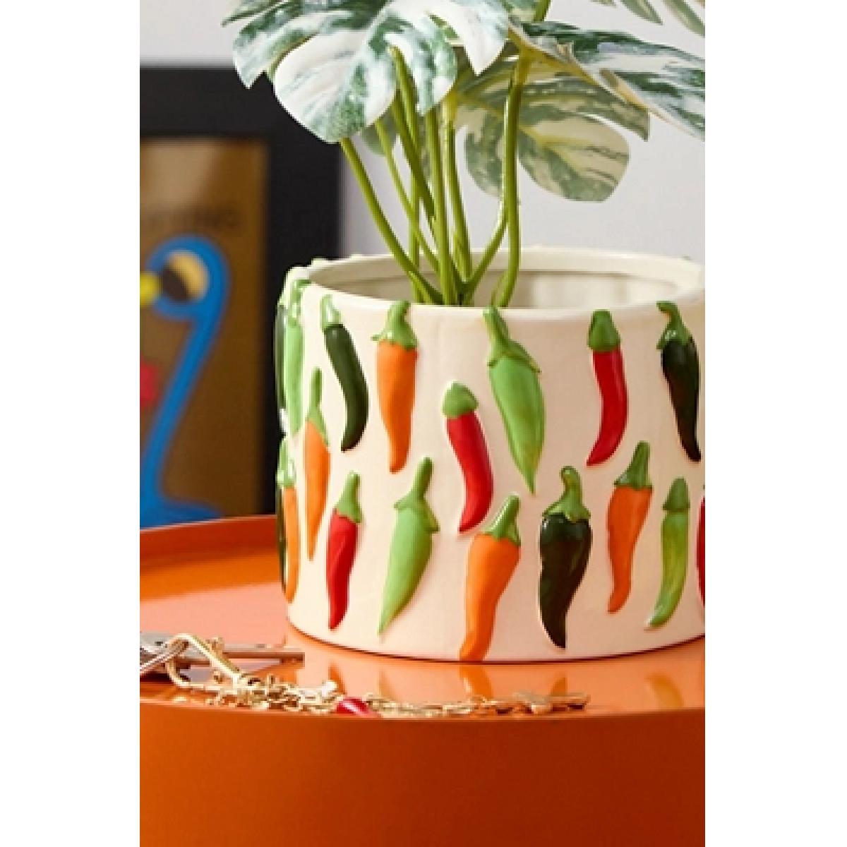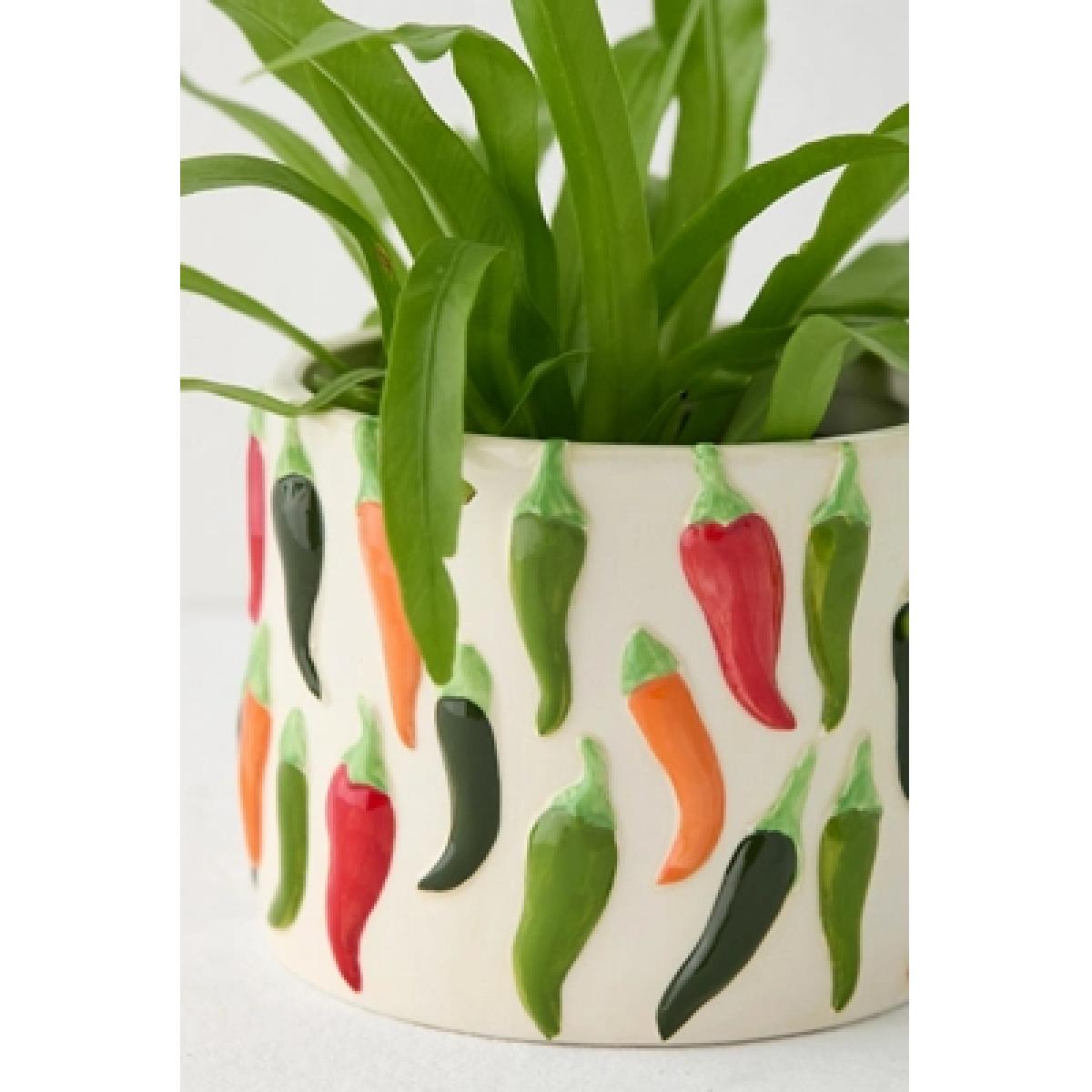 Merge your love for spice and plants with this adorable ceramic plant pot with a fun chilli print design. **Content + Care** \- Ceramic \- Wipe clean **Size** \- Diameter: 13cm \- Height: 10cm