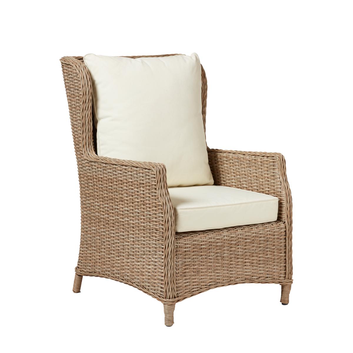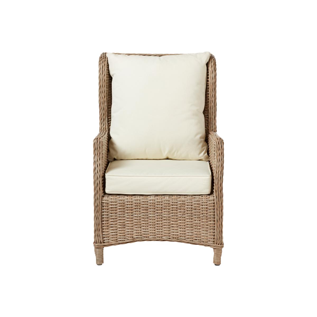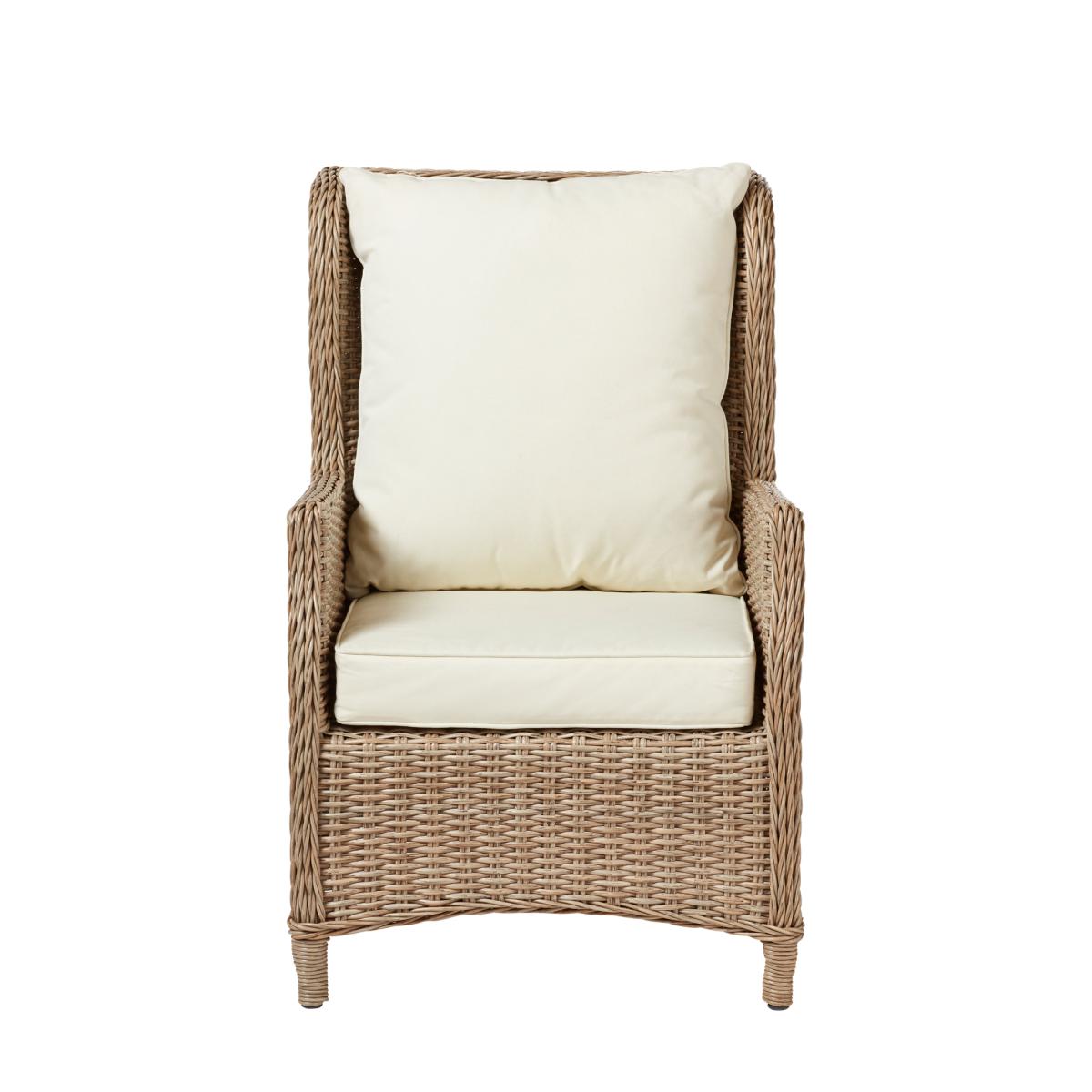 Every season, our all-weather "rattan" collection gets bigger and better: the Chillon is a testament to that. This throne-like outdoor armchair, with its formal high wing back, adds a sense of occasion to al fresco dining. Designed to be mixed and matched with other pieces from the collection, including simpler garden chairs or dining benches, the Chillon is practical (it's weatherproof) as well as comfortable – it comes with a thick off-white seat cushion and plump back cushion.