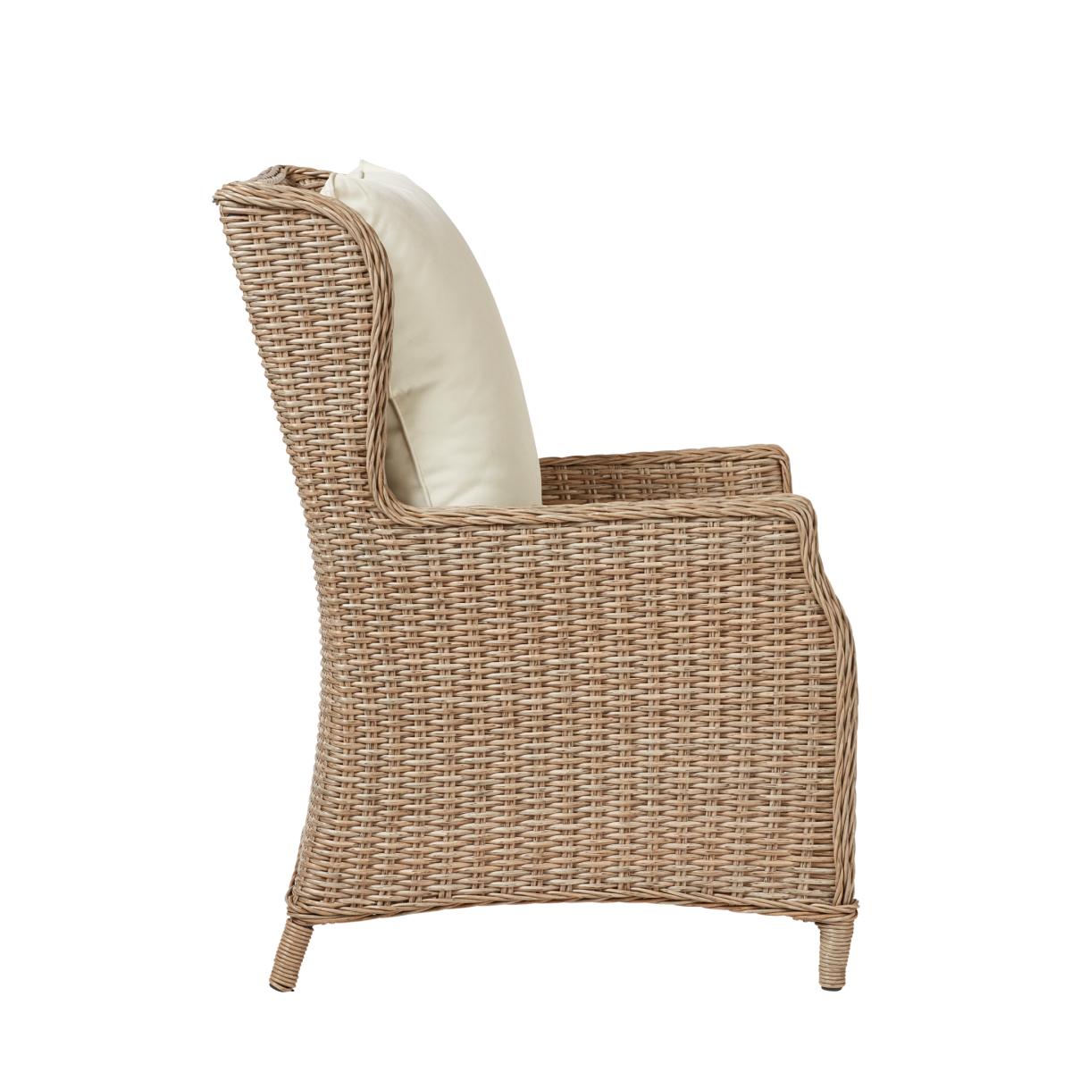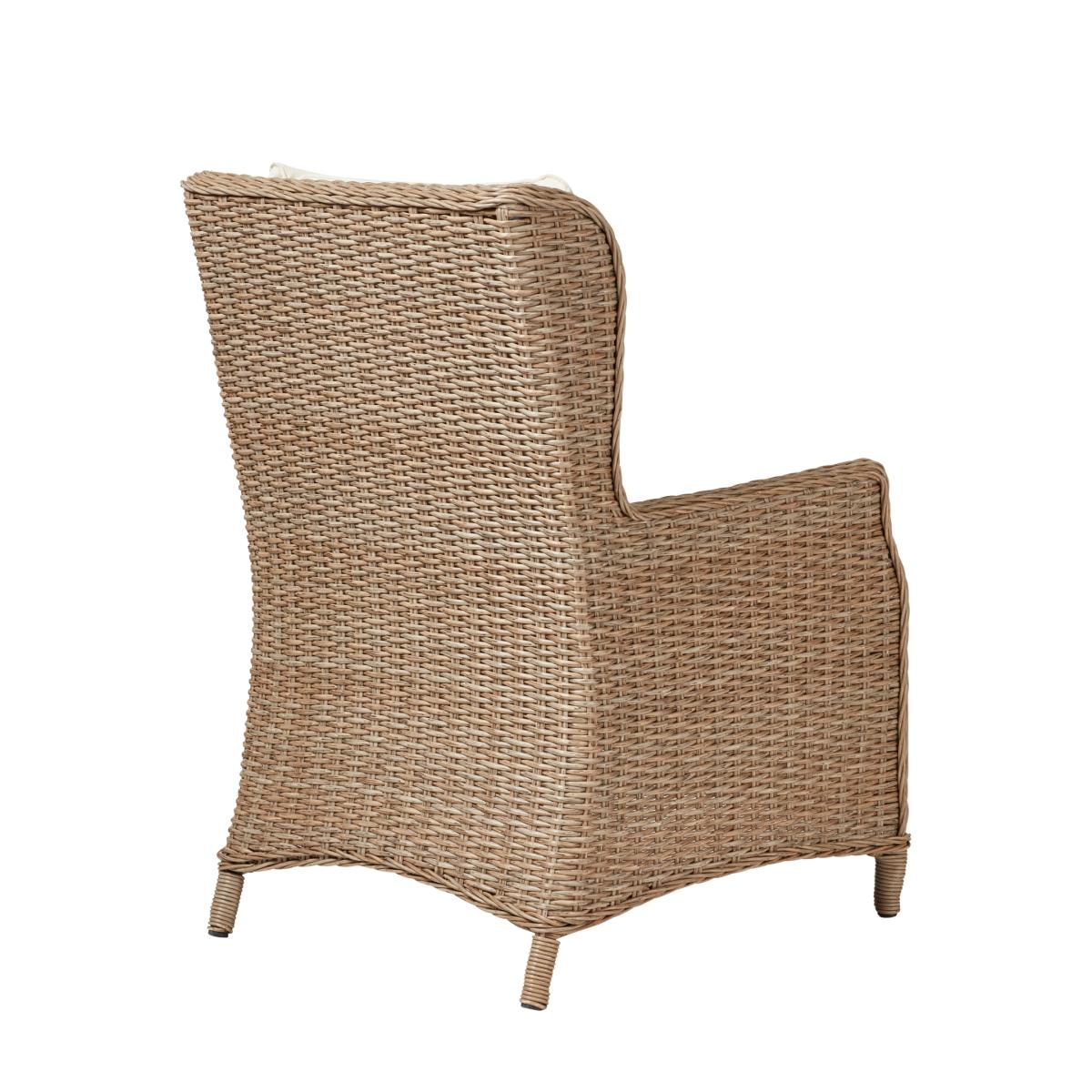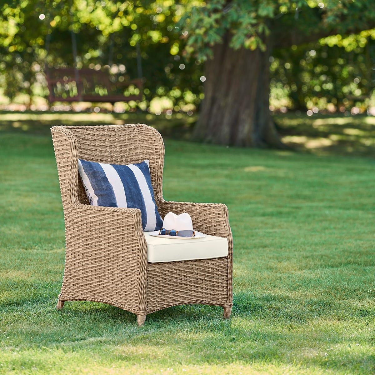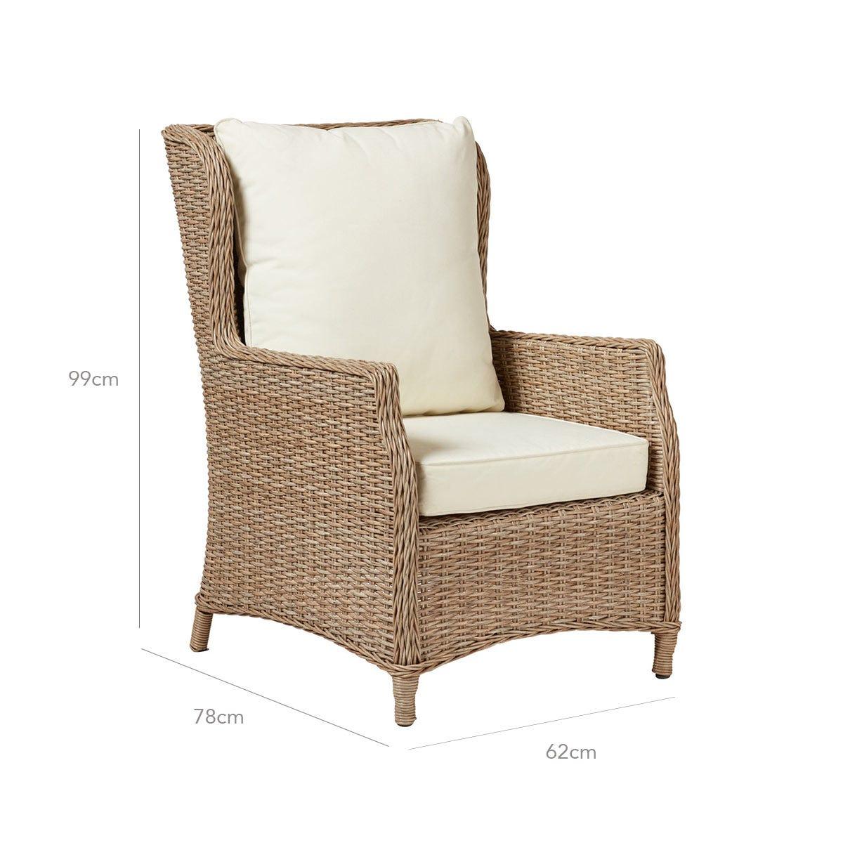 Every season, our all-weather "rattan" collection gets bigger and better: the Chillon is a testament to that. This throne-like outdoor armchair, with its formal high wing back, adds a sense of occasion to al fresco dining. Designed to be mixed and matched with other pieces from the collection, including simpler garden chairs or dining benches, the Chillon is practical (it's weatherproof) as well as comfortable – it comes with a thick off-white seat cushion and plump back cushion.