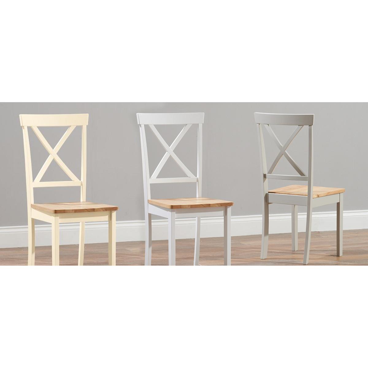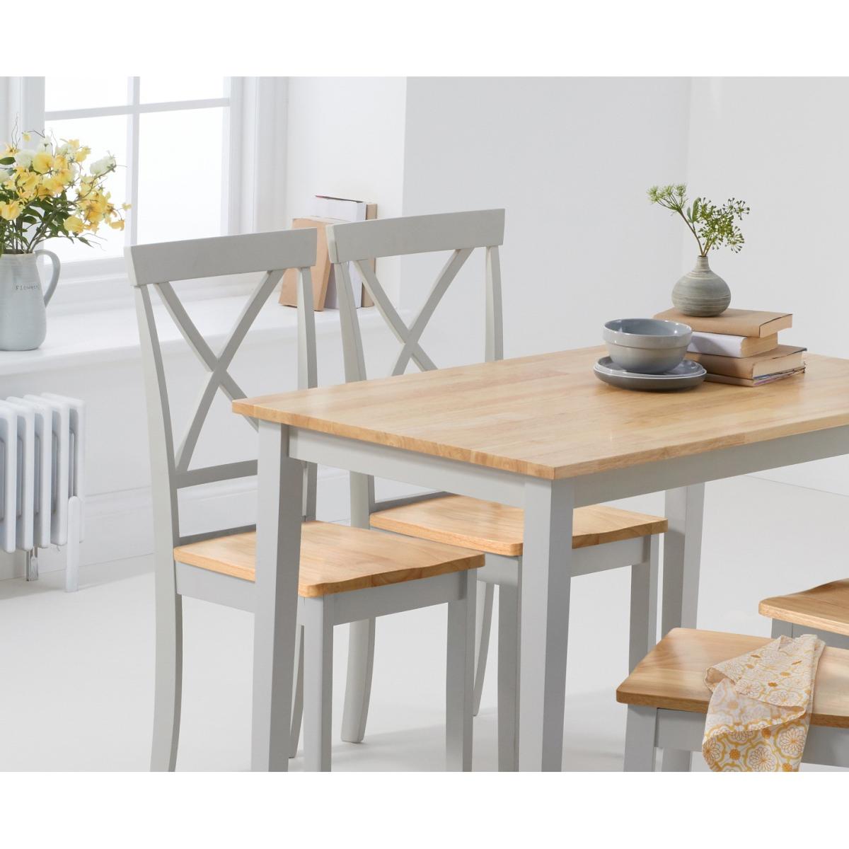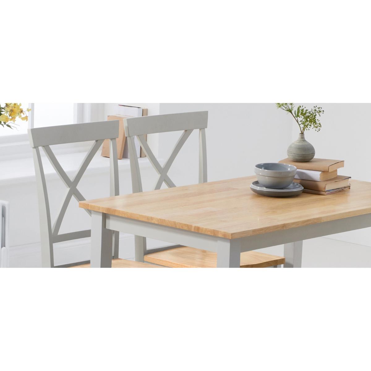 The Chiltern 114cm Oak and Grey Table with Epsom Chairs is a stylish space saving dining set. Seating up to 6 people, the Chiltern Table is crafted from durable solid hardwood and features an oak effect table top that is conveniently wiped clean contrasting with sturdy grey painted legs. Hardwood Epsom Chairs complete the set and feature a grey painted finish on the frame and natural seats. Space saving hardwood dining set. Seats 6 people – perfect for small dining areas. Durable hardwood dining table is stylish and sturdy. Wipe-clean oak effect table top is easily maintained. Sturdy grey painted legs for a stunning contrast. Matching hardwood chairs complete the set. Supportive cross design on the backrest. Durable frame with grey painted finish and natural seat