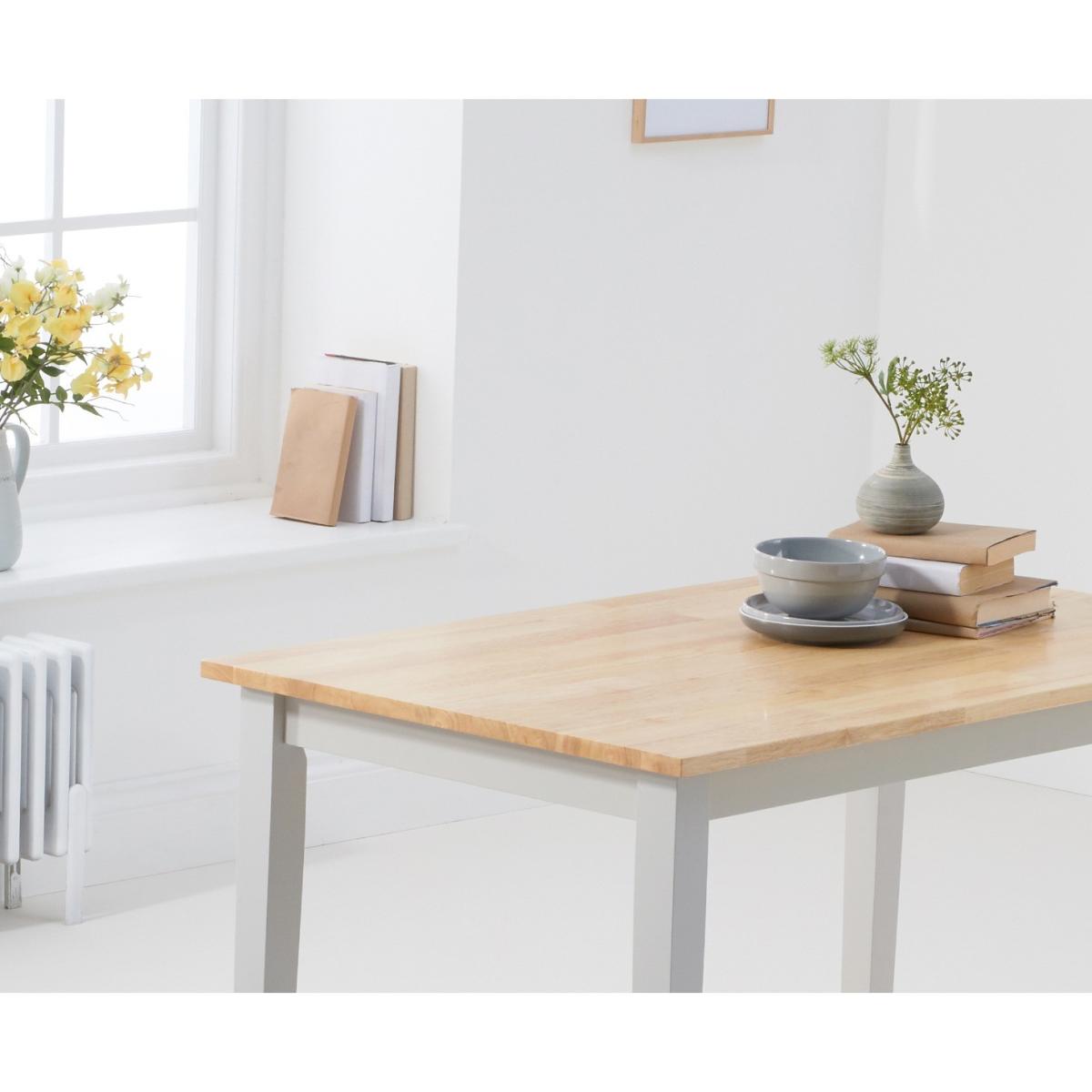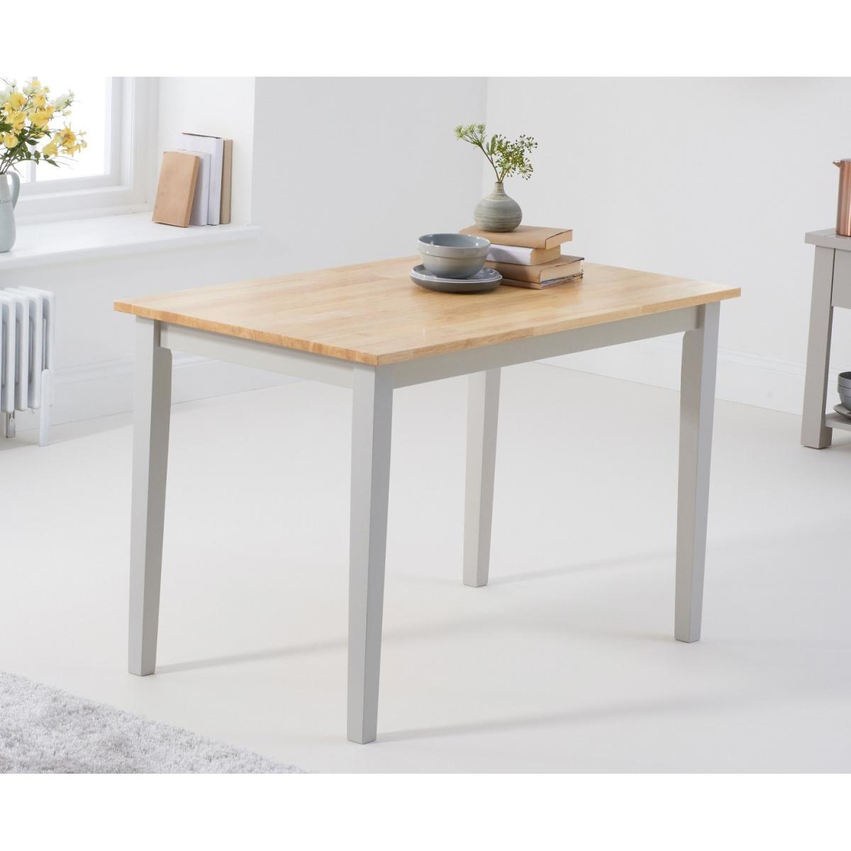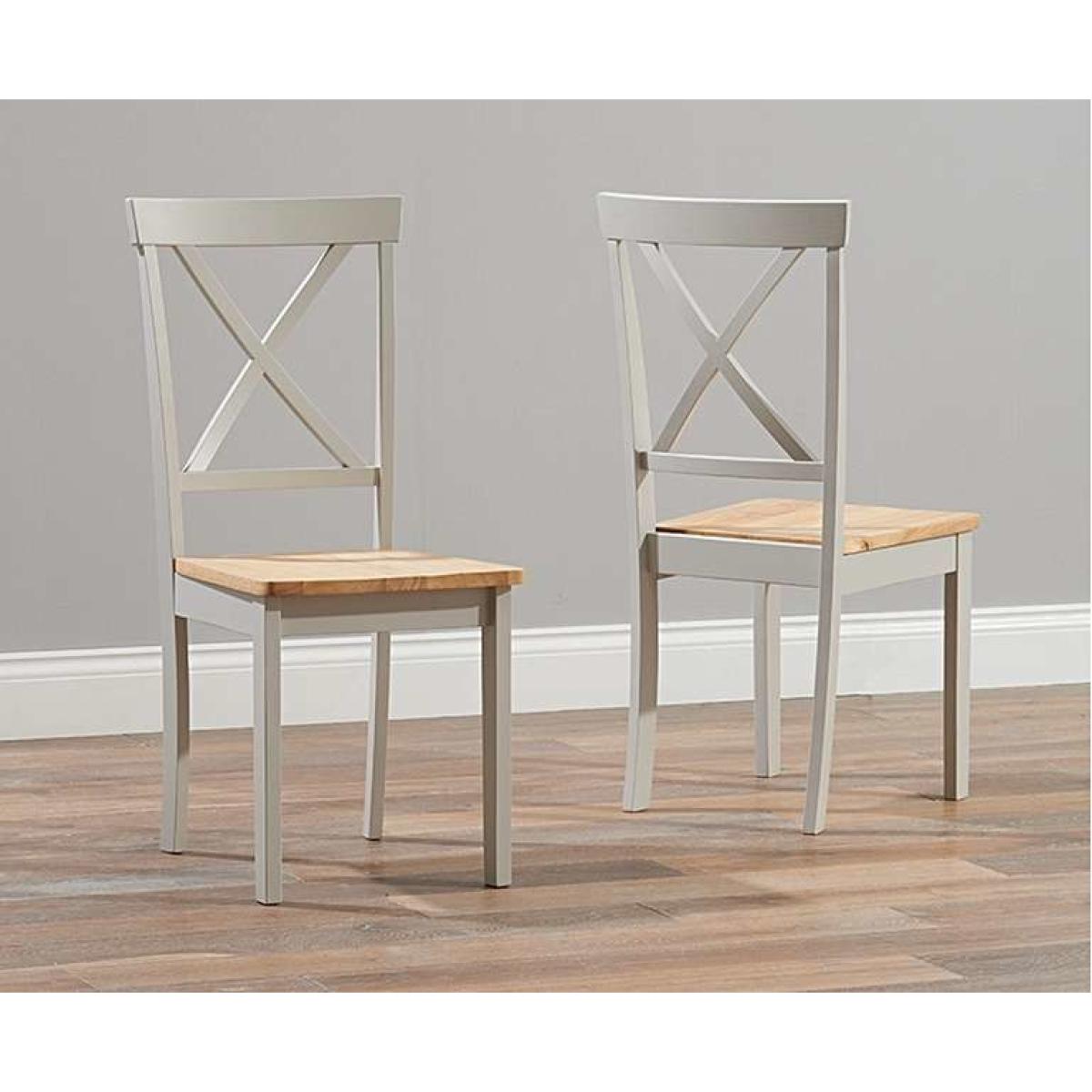 The Chiltern 114cm Oak and Grey Table with Epsom Chairs is a stylish space saving dining set. Seating up to 6 people, the Chiltern Table is crafted from durable solid hardwood and features an oak effect table top that is conveniently wiped clean contrasting with sturdy grey painted legs. Hardwood Epsom Chairs complete the set and feature a grey painted finish on the frame and natural seats. Space saving hardwood dining set. Seats 6 people – perfect for small dining areas. Durable hardwood dining table is stylish and sturdy. Wipe-clean oak effect table top is easily maintained. Sturdy grey painted legs for a stunning contrast. Matching hardwood chairs complete the set. Supportive cross design on the backrest. Durable frame with grey painted finish and natural seat