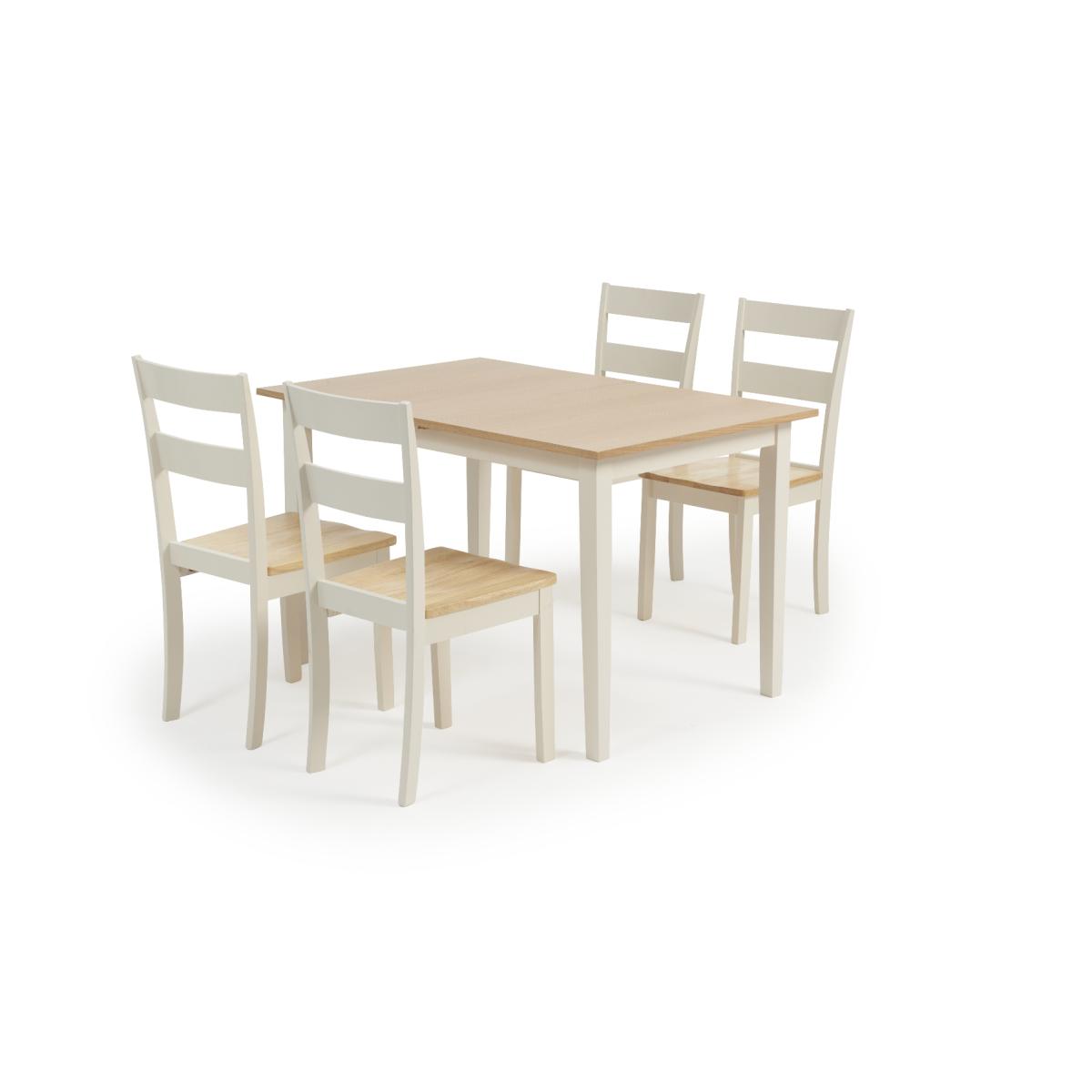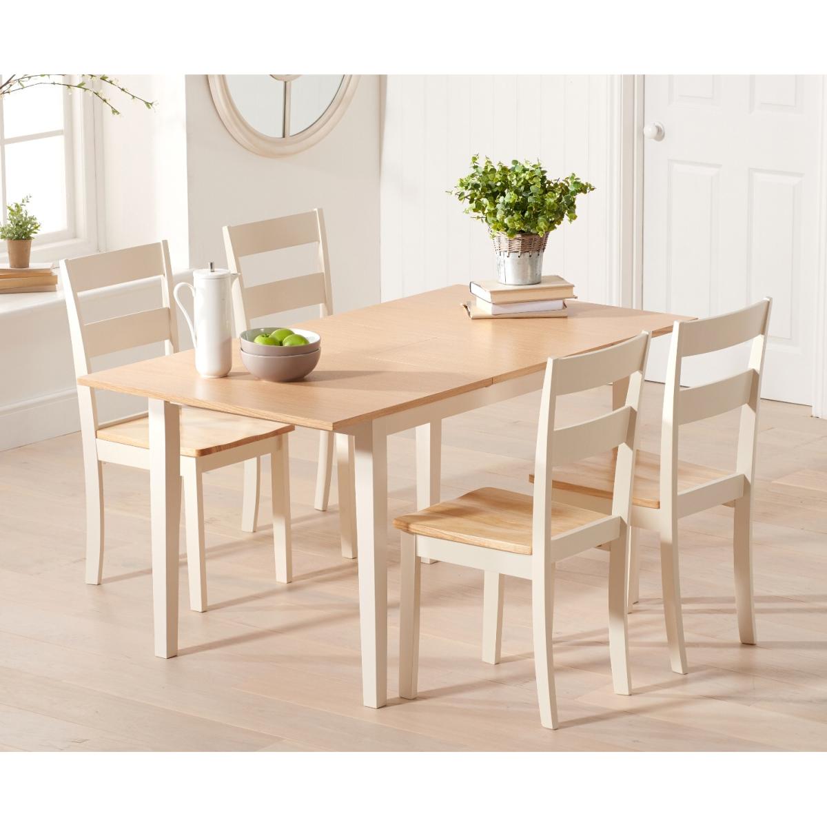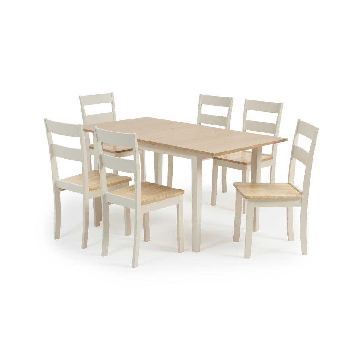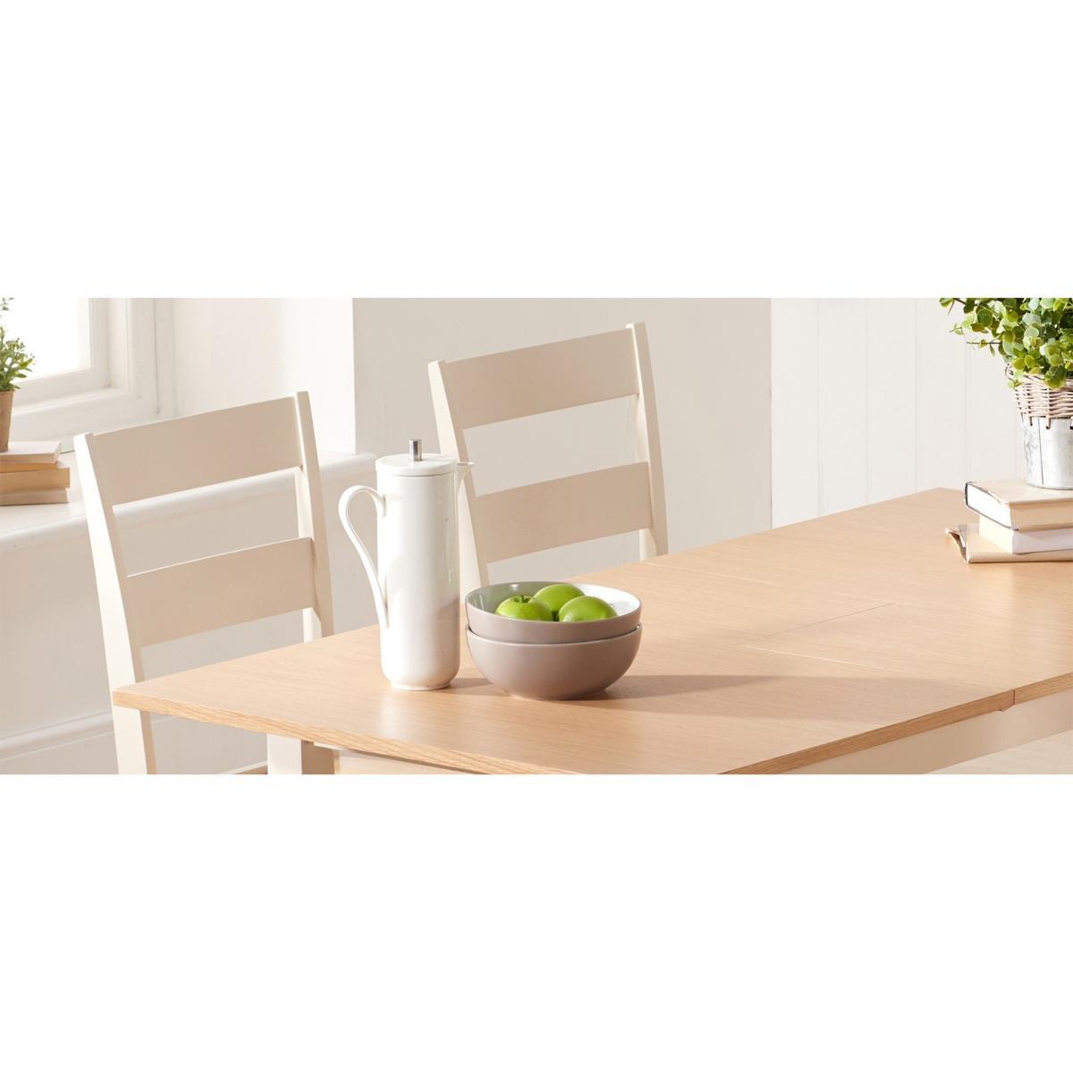 Chic and versatile, the Chiltern 120cm Oak and Cream Extending Dining Table is an asset for your dining room or kitchen. Seating up to 4 people, the painted dining table adapts to suit you as it extends to seat 6. Meticulously crafted from naturally resilient solid hardwood, the extending dining table features a smooth oak effect table top and a durable cream painted frame and legs. A stylish setting for any occasion, the painted dining table extends to 150cm via an inbuilt butterfly extension feature. Matching chairs complement the Chiltern table. Crafted from solid hardwood, the Chiltern chairs feature a laddered-backrest design and a cream painted finish that contrasts with a natural seat.