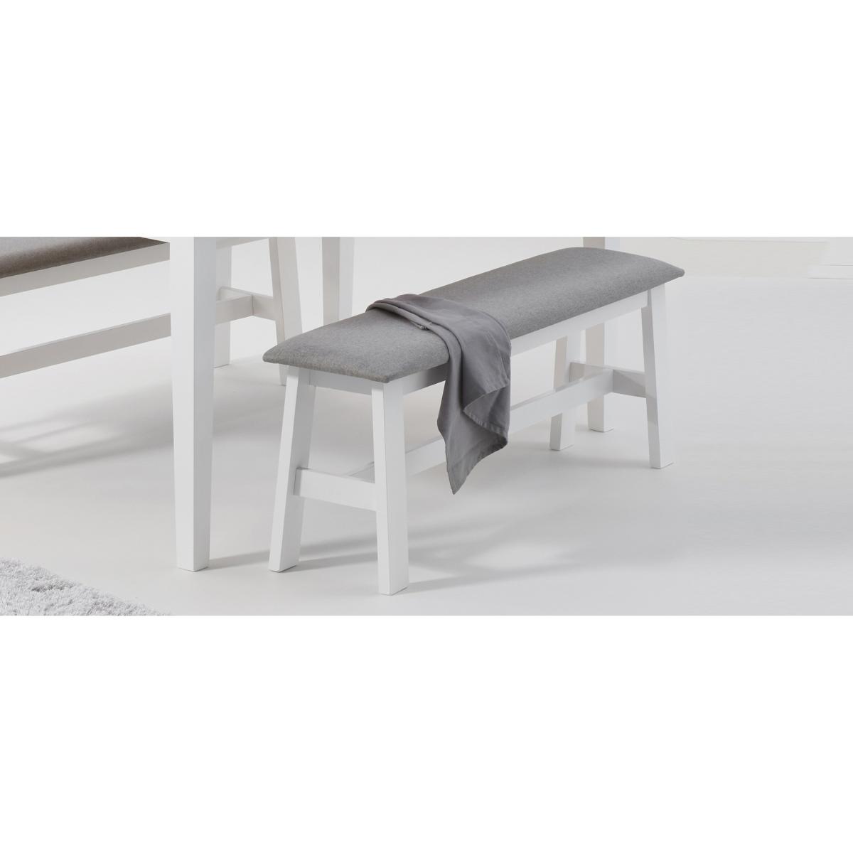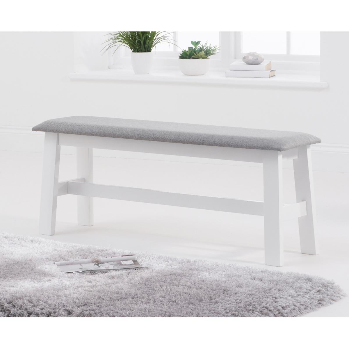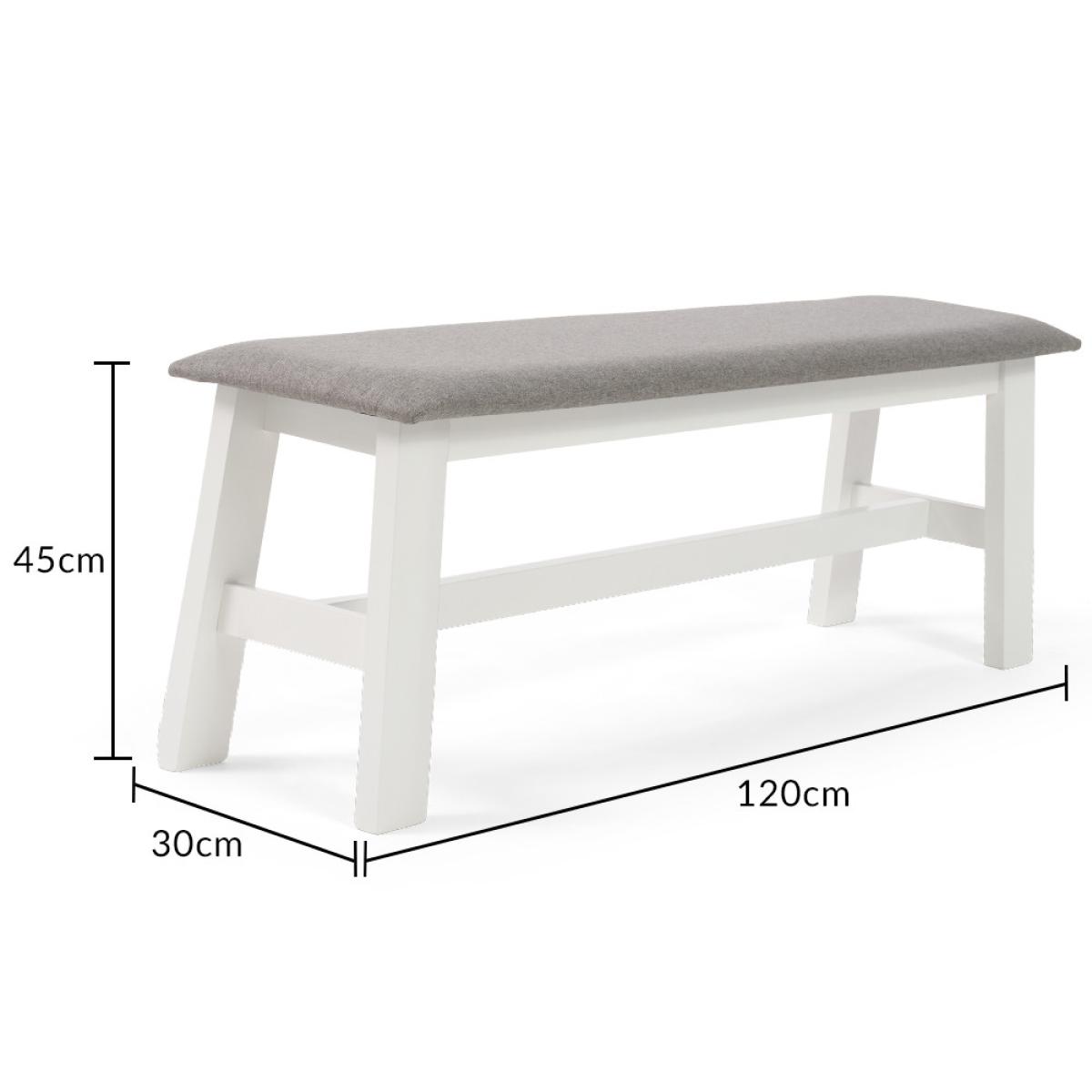 The Chiltern Large White Bench with Fabric Seat is a stylish addition to any dining area. A stunning alternative to dining chairs, the white painted bench is crafted from durable solid hardwood and features a comfortable grey fabric seat. Solid hardwood construction for optimum durability Smooth white painted finish for a classic look to suit every interior. Perfectly practical; seats up to 3 diners. Padded seat withgreyfabric upholstery completes the look and offers a comfortable sit
