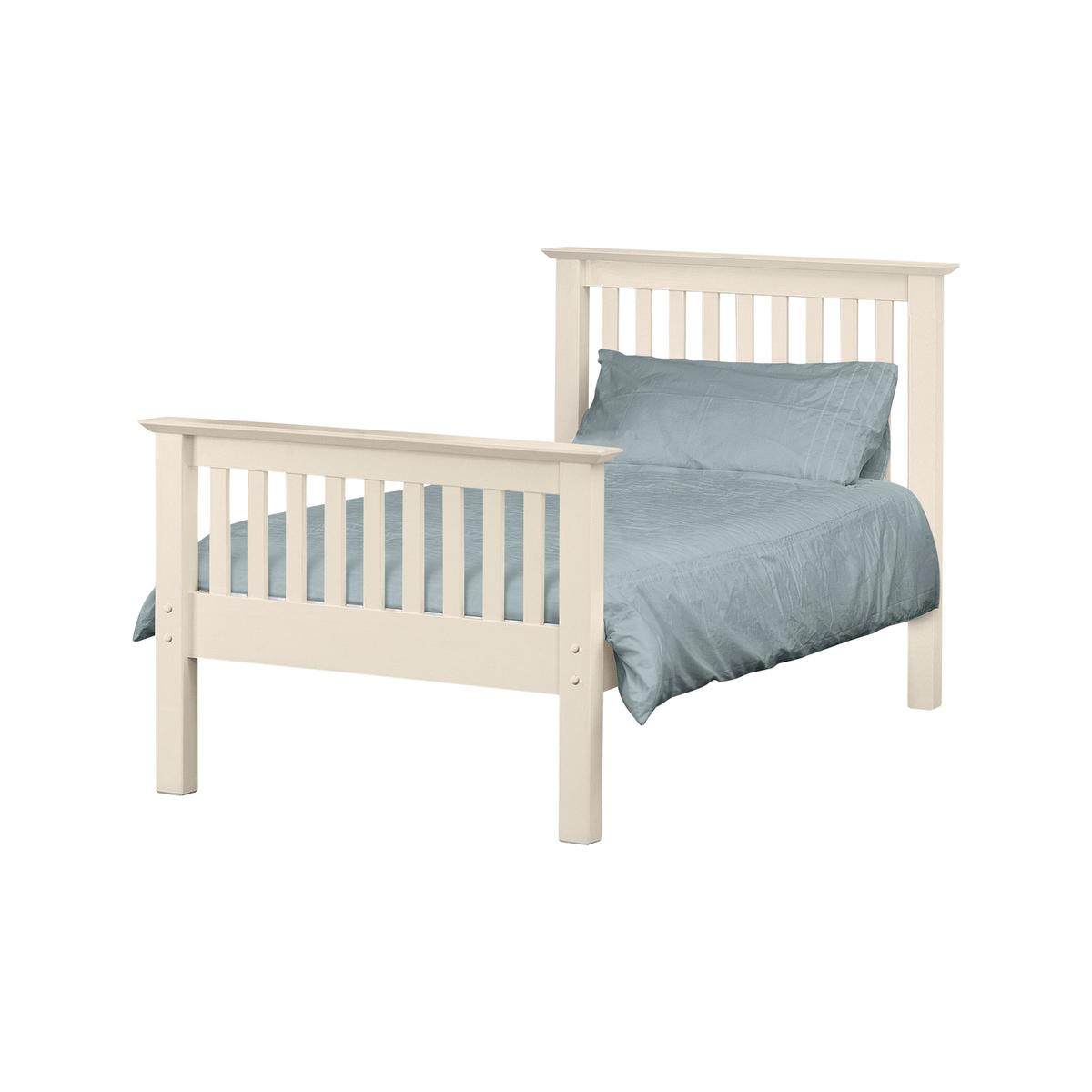 Headboard and footboard each come in one single piece. Beautifully simple, Shaker-style painted furniture. Double bedstead has high, slatted headboard and footboard. Stylish overhanging tops and solid, square legs. Carefully made from MDF and solid pine. Painted in stone white with a hardwearing lacquer finish. Bedroom furniture designed for adults and children alike. Mattress available separately