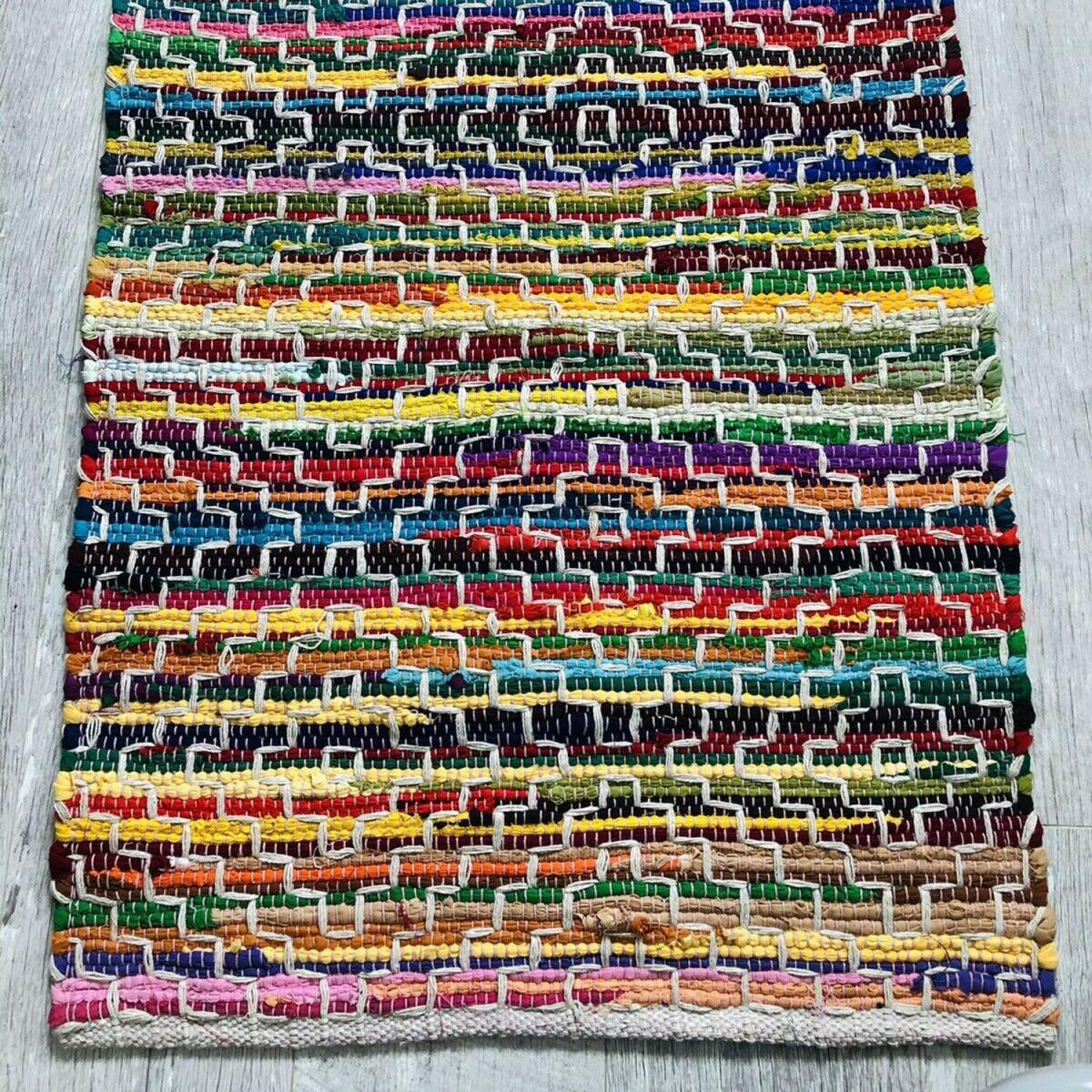 A lovely traditionally hand loomed rag rug. It is bursting with colour but wonderfully contemporary with hand-stitched detailing. Made from 100% recycled cotton. Each one is handmade so no two rugs are the same.