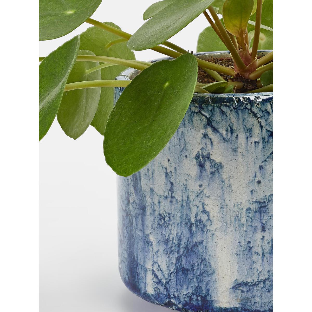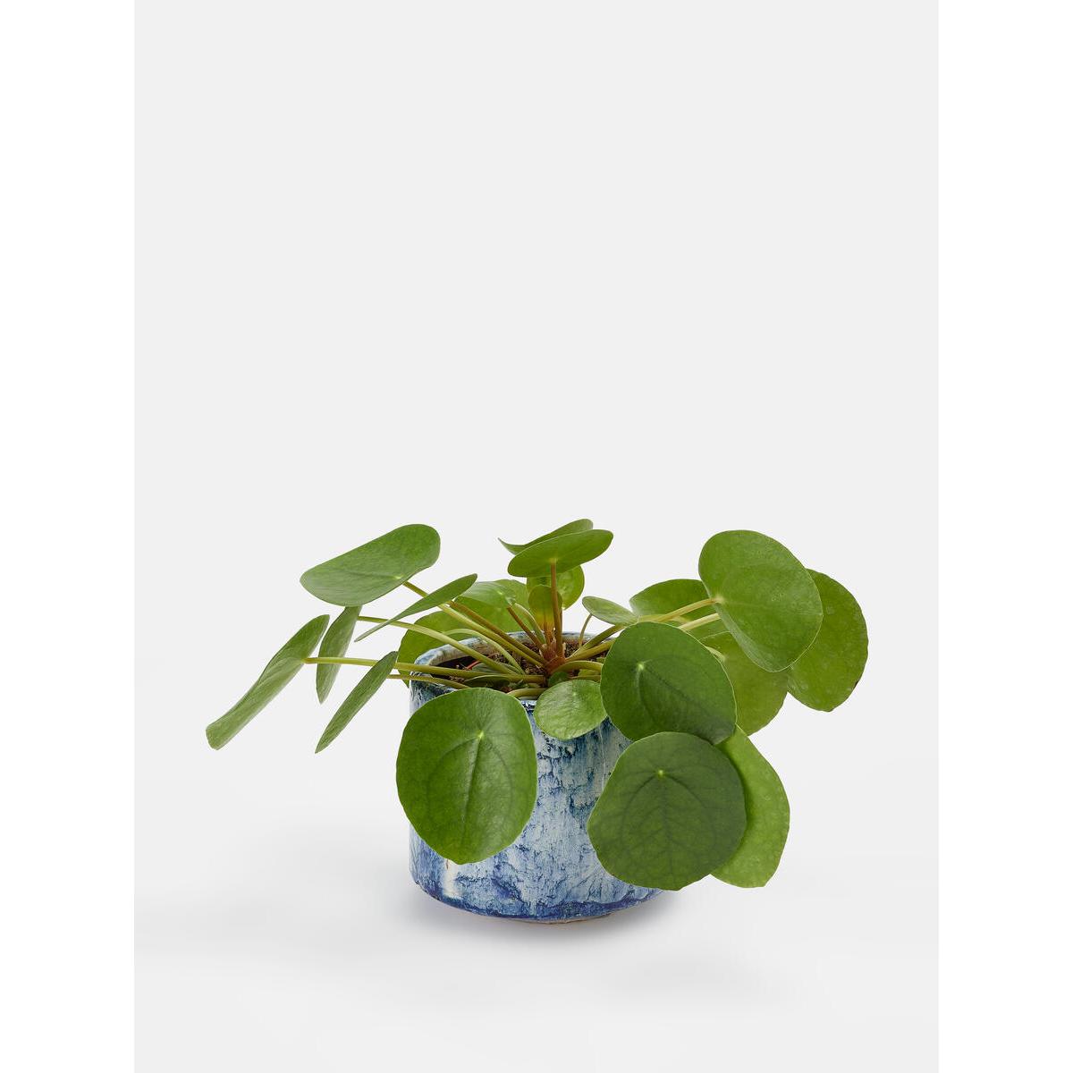 The Chinese Money plant is renowned for its thick, spoon-shapedleaves and ability to grow tall. It symbolises abundance, goodfortune and is also called the 'friendship plant' as they grow manynodes that can be gifted to friends. The plant comes in ahand-crafted fractured pot, which looks great perched on a desk orside table. Bright, indirect light to dappled sun. Water every one-two weeks, allowing soil to dry out completelybetween watering. Pet friendly. Air purifying. Easy care. Comes in blue fractured pot.