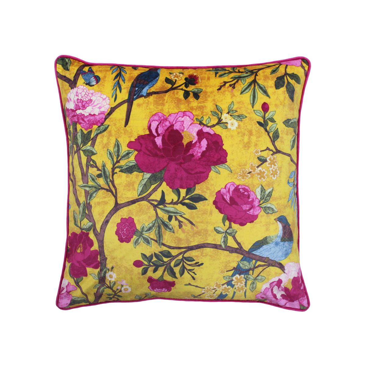 The Paoletti Chinoiserie cushion cover features traditional Chinese motifs of vibrant birds and gorgeous pink flowers on a golden background. Delicately created with velvet feel fabric this cushion will exude opulence and add a new dimension to busy home interiors. The Indian-style cushion comes complete with contrasting pink piped edges and a hidden zip design. Made using 100polyester the Chinoiserie cushion is hard-wearing making it ideal for households with messy children or overexcitable pets. Easy to care for this cushion cover is fully machine washable at 30 degrees. Lay flat to dry and use a cool iron for the best finish.