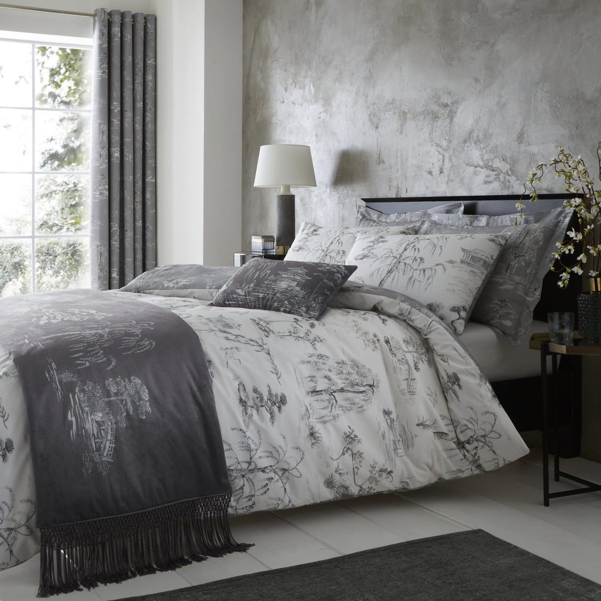 The Chinoiserie duvet cover and pillowcase set features an intricate East Asian design. With dainty trees and architecture over the water, alongside oriental birds flying here and there, this grey set with crisp white reverse is classy and trendy. The look is complete with our Chinoiserie cushion and runner, creating an absolutely stunning sleep space. Crafted using a combination of natural and synthetic that ensure comfort and durability, with a soft touch finish and easycare properties.