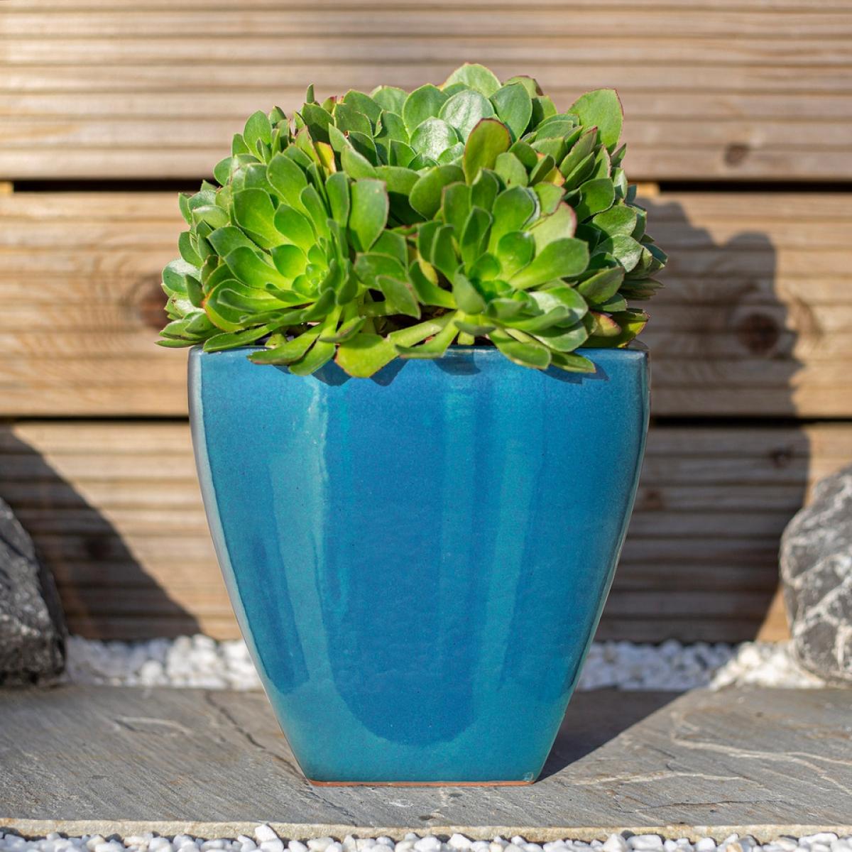This classic square green glazed 23cm terracotta plant pot is a perfect feature piece for any garden, the lustre of the glaze reflects and brings light into the surrounding area.