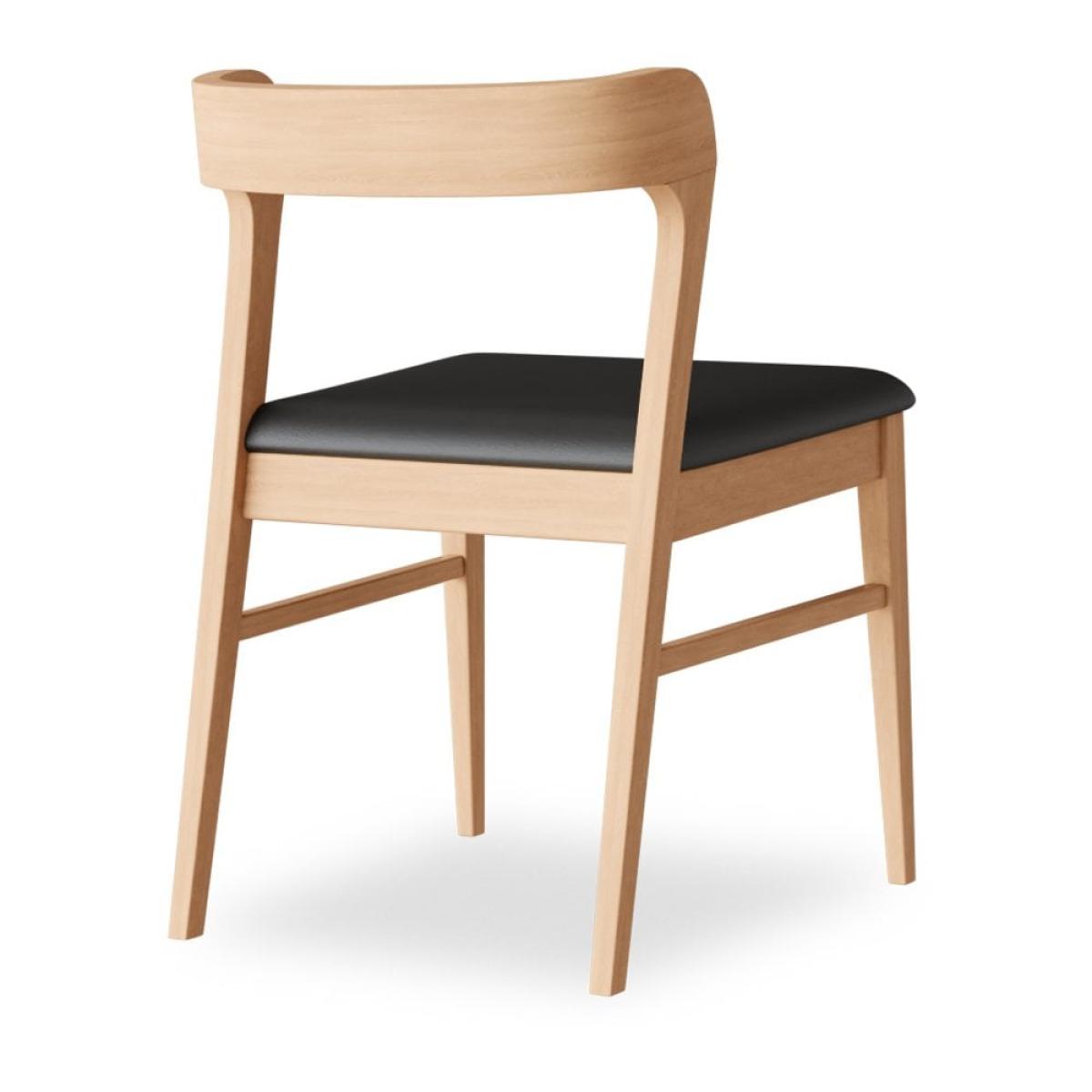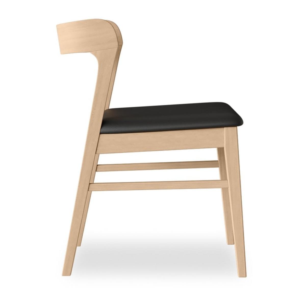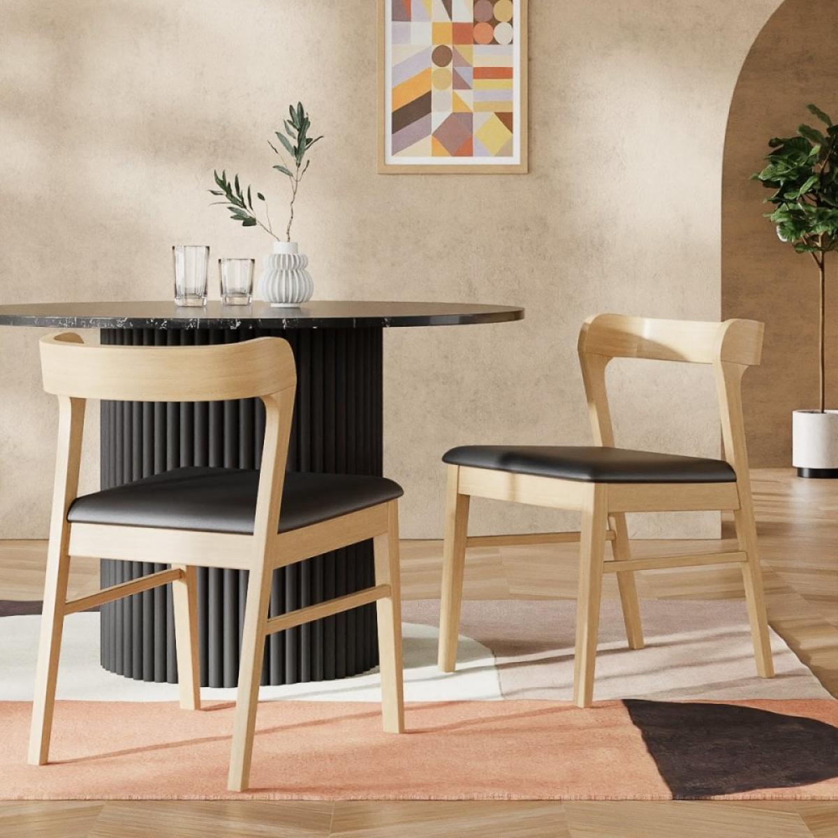 The retro-inspired design of the Chiswick Dining Chair has that thick wooden frame stained in a a natural light wood finish for durability and mid century style. The smooth curved backrest along with angled legs offer additional comfort; ideal for bustling kitchens. We love how the backrest hugs the body, the true epitome of functional furniture design. Featuring a padded faux leather seat in a soft black, in keeping with the retro mid-century style.