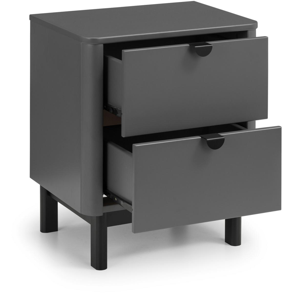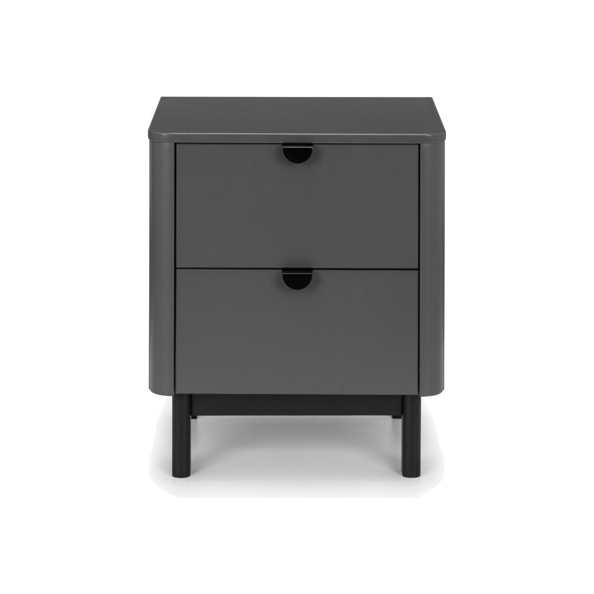 The Chloe Bedroom collection has a modern, retro style finished in a storm grey lacquer with satin black wooden legs and handles. The corners are rounded for a softer look, creating perfect balance between style and functionality. Stow away all your night time essentials with the Chloe 2 drawer bedside.