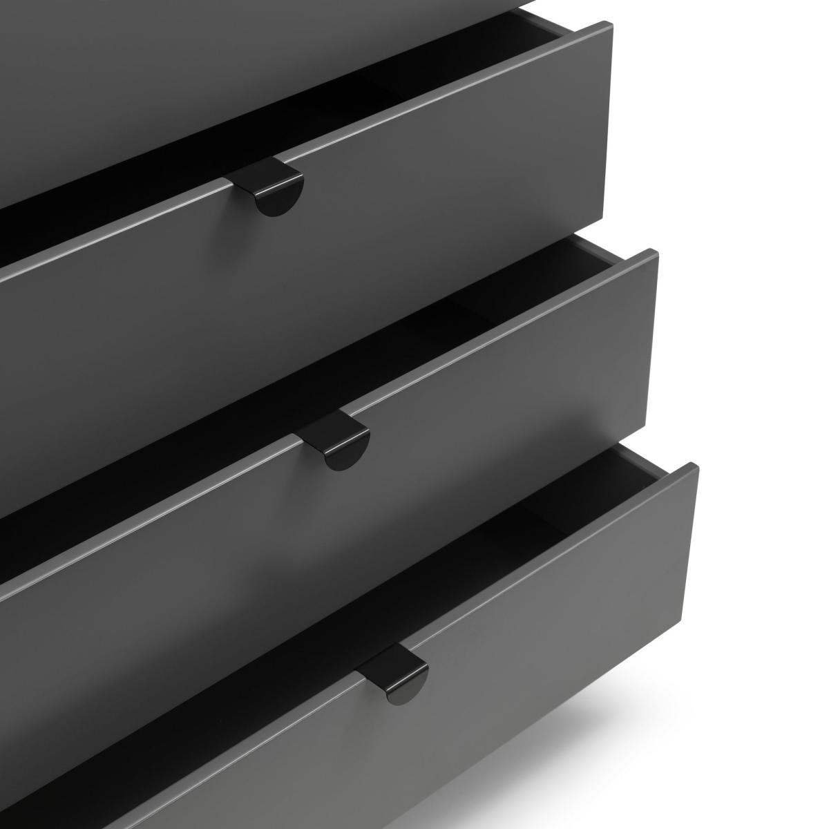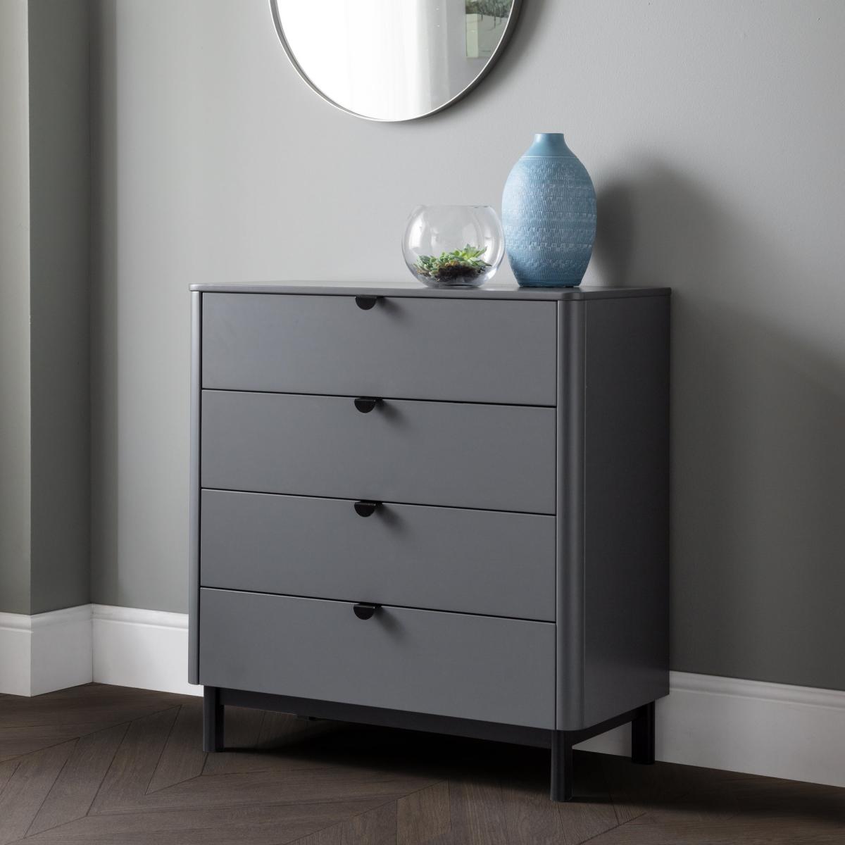 This chest of drawers is a great place to keep your extra clothes and other knickknacks. It has four deep drawers that keep everything neatly tucked away and out of sight, with rounded corners for a softer look. The storm grey finish with satin black wooden legs and handles adds a stylish look to any home.