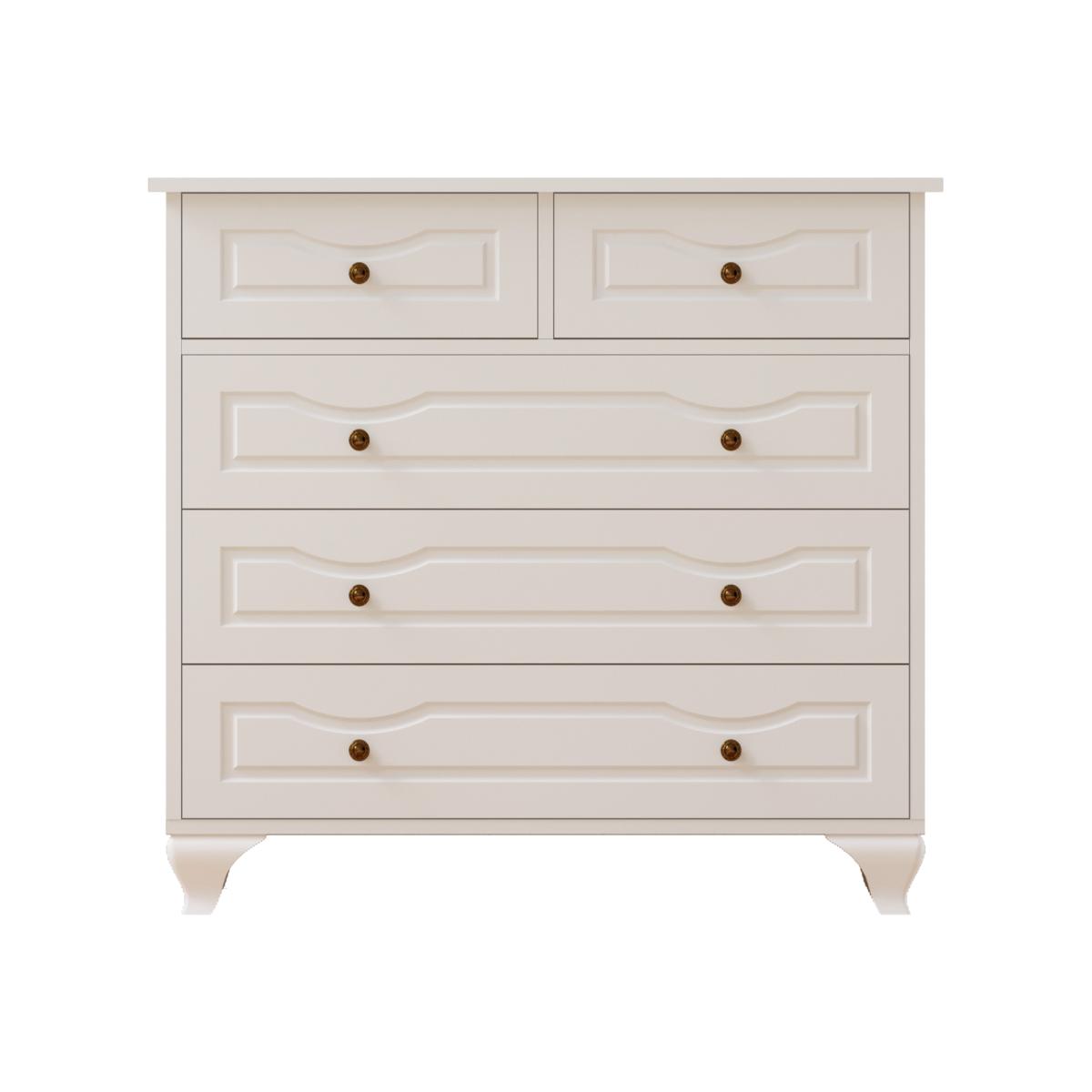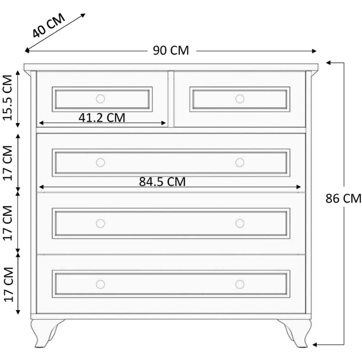 Inspired by the French antiques and country furniture CHLOE range is characterful and practical. Featuring five deep drawers, tapered feet and finished with bronze effect handles it boosts timeless design while offering you ample space for your folded clothes or accessories, such as sweaters, jeans, hats, hand bags, etc. Material Membrane coated MDF board, finished with CNC process. Colour White Dimensions Width90cm,Height86cm,Depth40cm. Delivered flat packed in 2x Boxes. Total Gross Weight40.7kg.