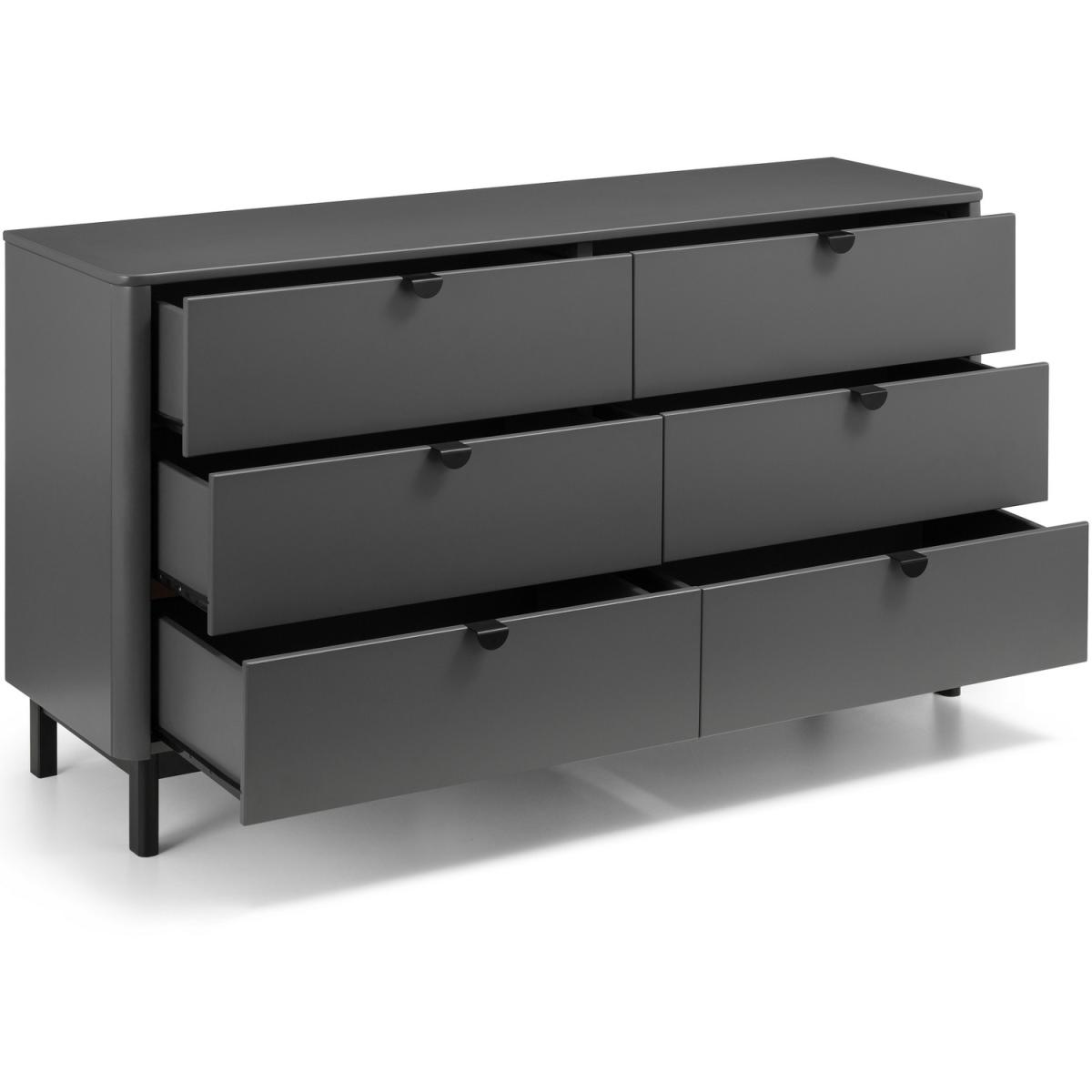 The Chloe Bedroom collection has a modern, retro style finished in a storm grey lacquer with satin black wooden legs and handles. The corners are rounded for a softer look, creating perfect balance between style and functionality. Featuring 6 large drawers, this chest is perfect for neatly storing your clothes.