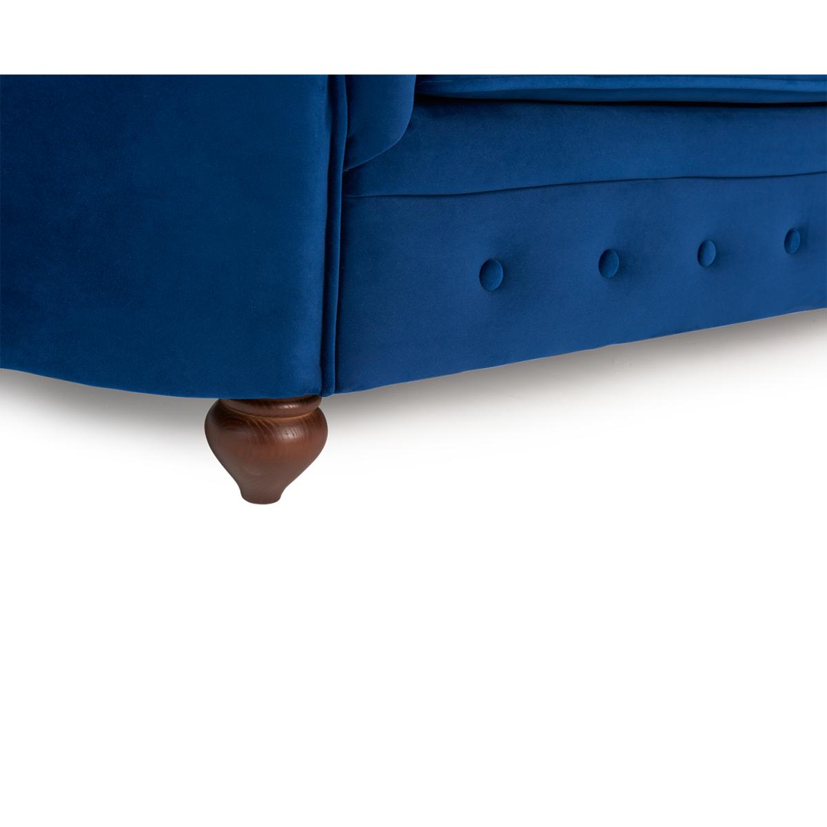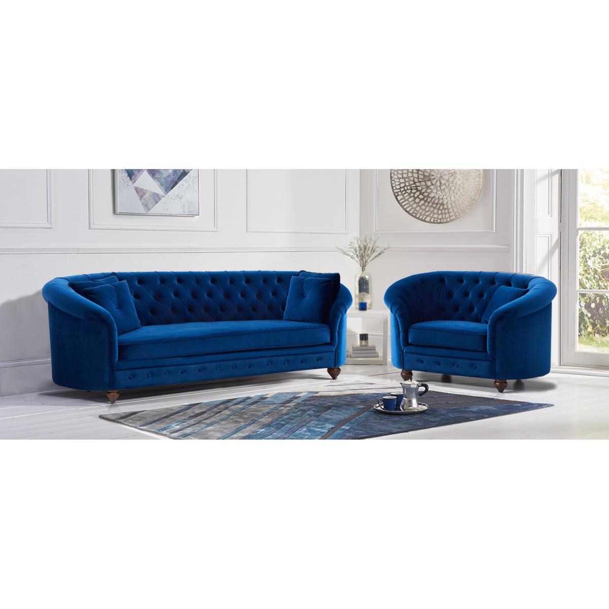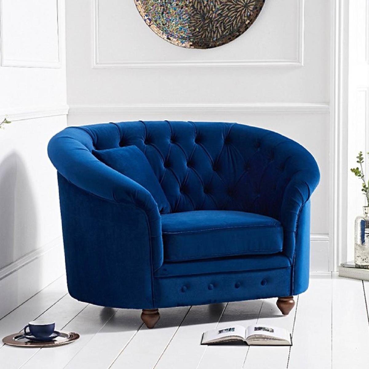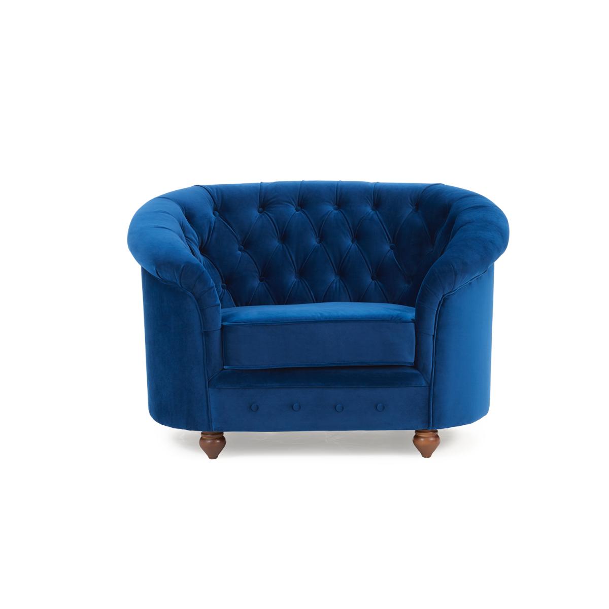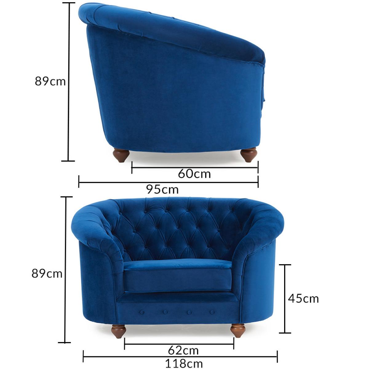 The Chloe Chesterfield Blue Plush Armchair brings style and comfort to any living area. Perfect as an accent chair or as part of a suite, the armchair features a cosy tub-style design perfect for curling up and relaxing. The striking armchair is upholstered in sumptuous blue plush fabric and features a stunning tufted-button design on the backrest for a classic Chesterfield look. Featuring a comfortable deep filled foam seat an elegantly turned solid wood legs, the armchair comes complete with a free scatter cushion. The Chloe Chesterfield Plush Armchair is also available ingrey.