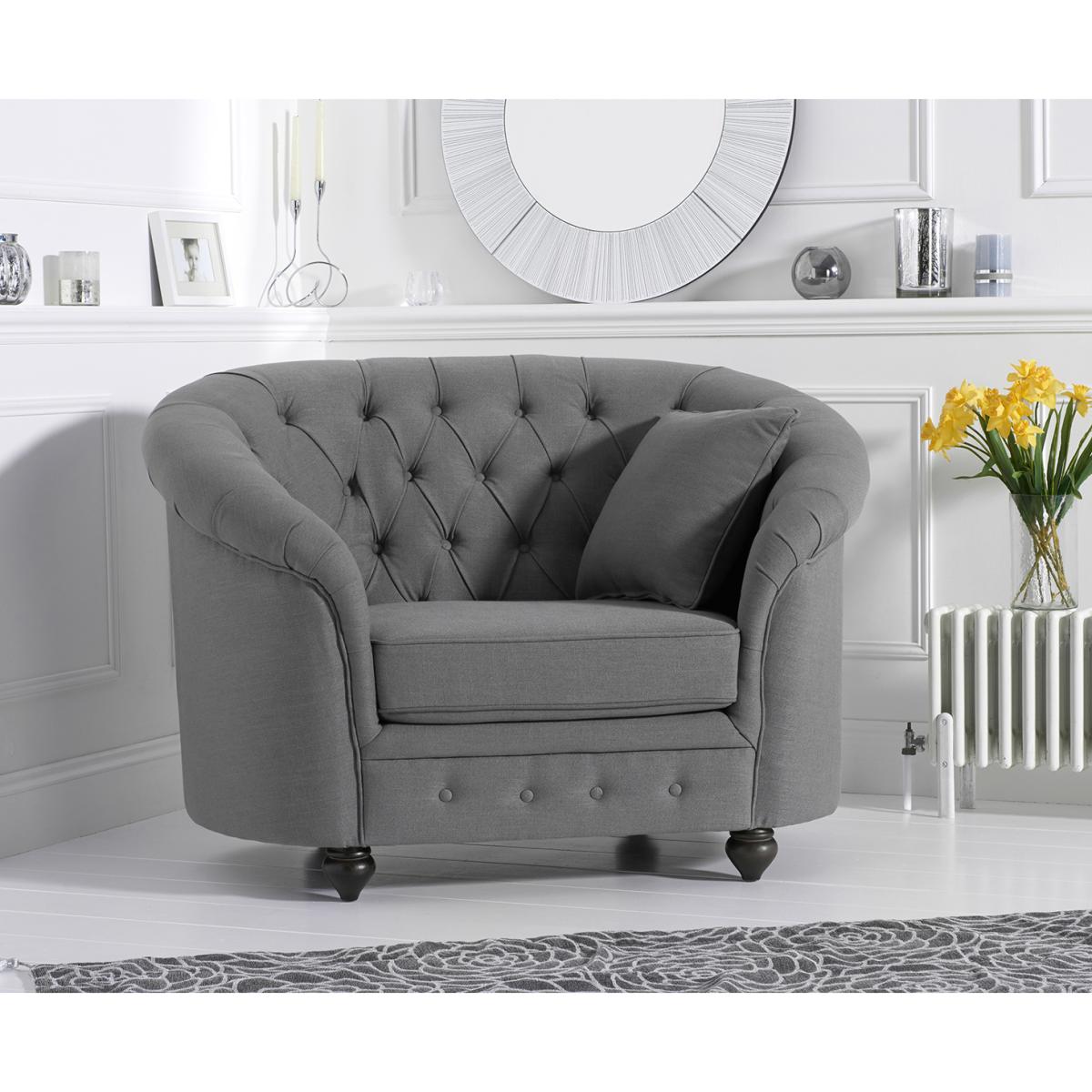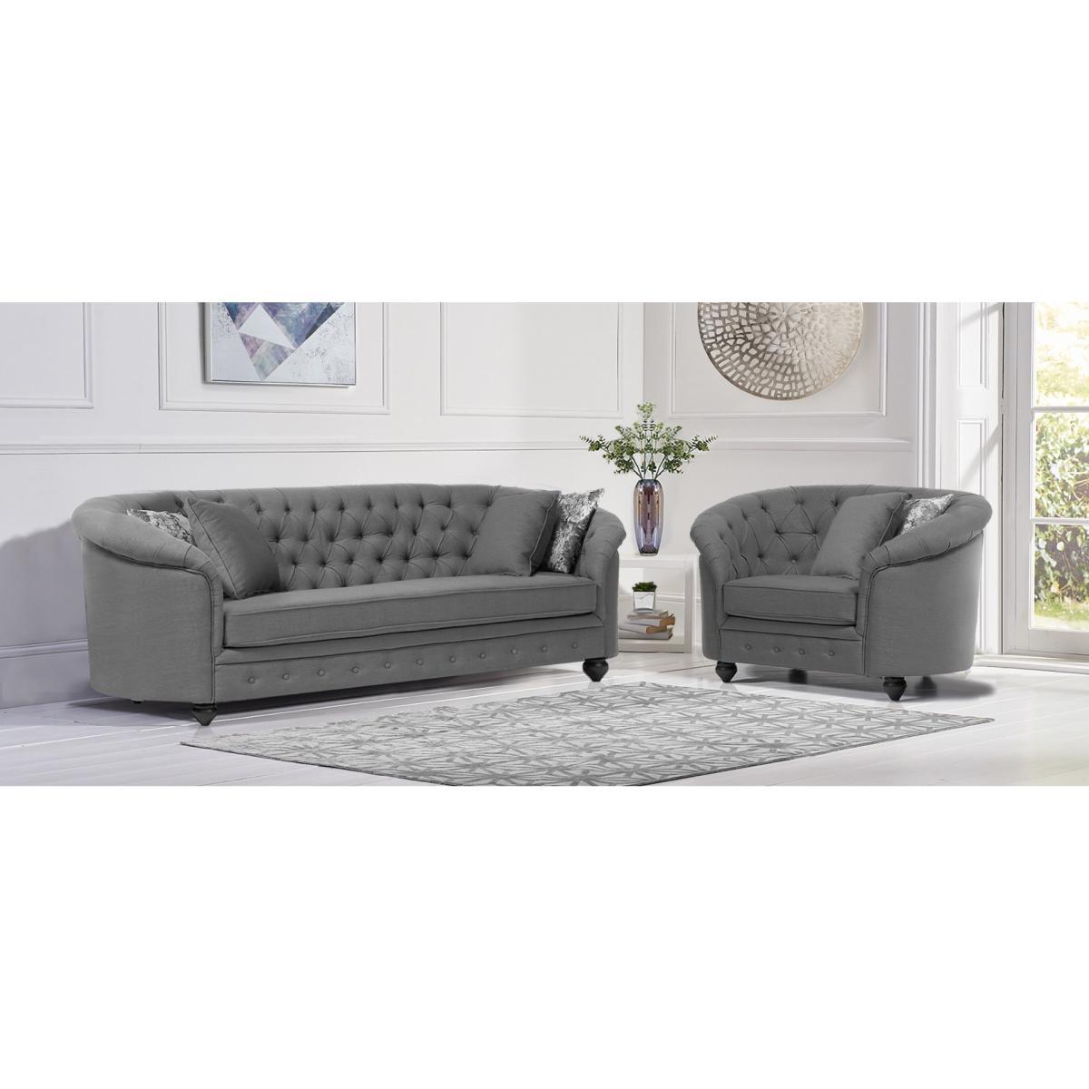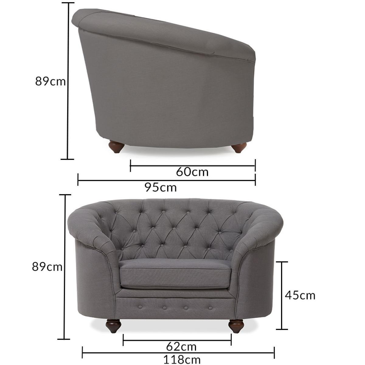Either as part of the Chloe suite or as an accent chair by itself, the Chloe Chesterfield Grey Armchair is sure to bring quality, comfort and style into your living room. Upholstered in a chic grey linen, this sofa features Chesterfield-inspired design features such as the tufted button detail, high arms that blend into the backrest, a comfortable structure of firm S-springs, and perfectly turned solid ash feet. This armchair comes with one free scatter cushion in a complementary shade of grey.*Comes with one free 40 x 40cm scatter cushion.