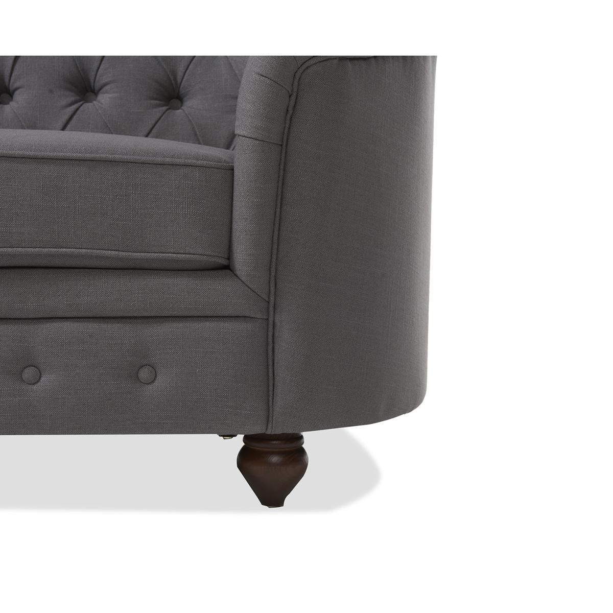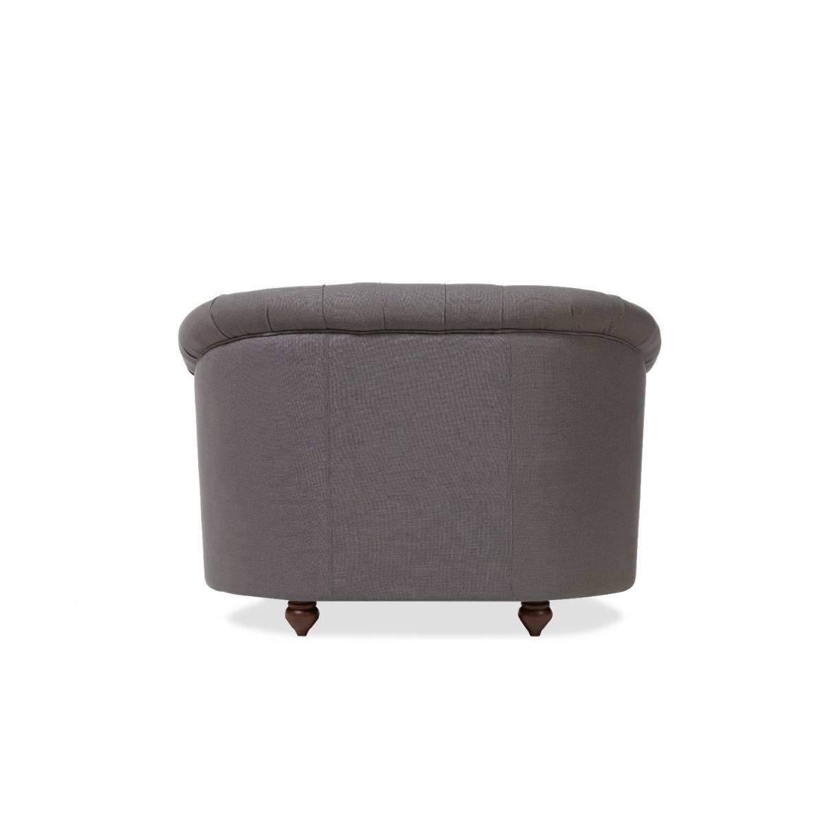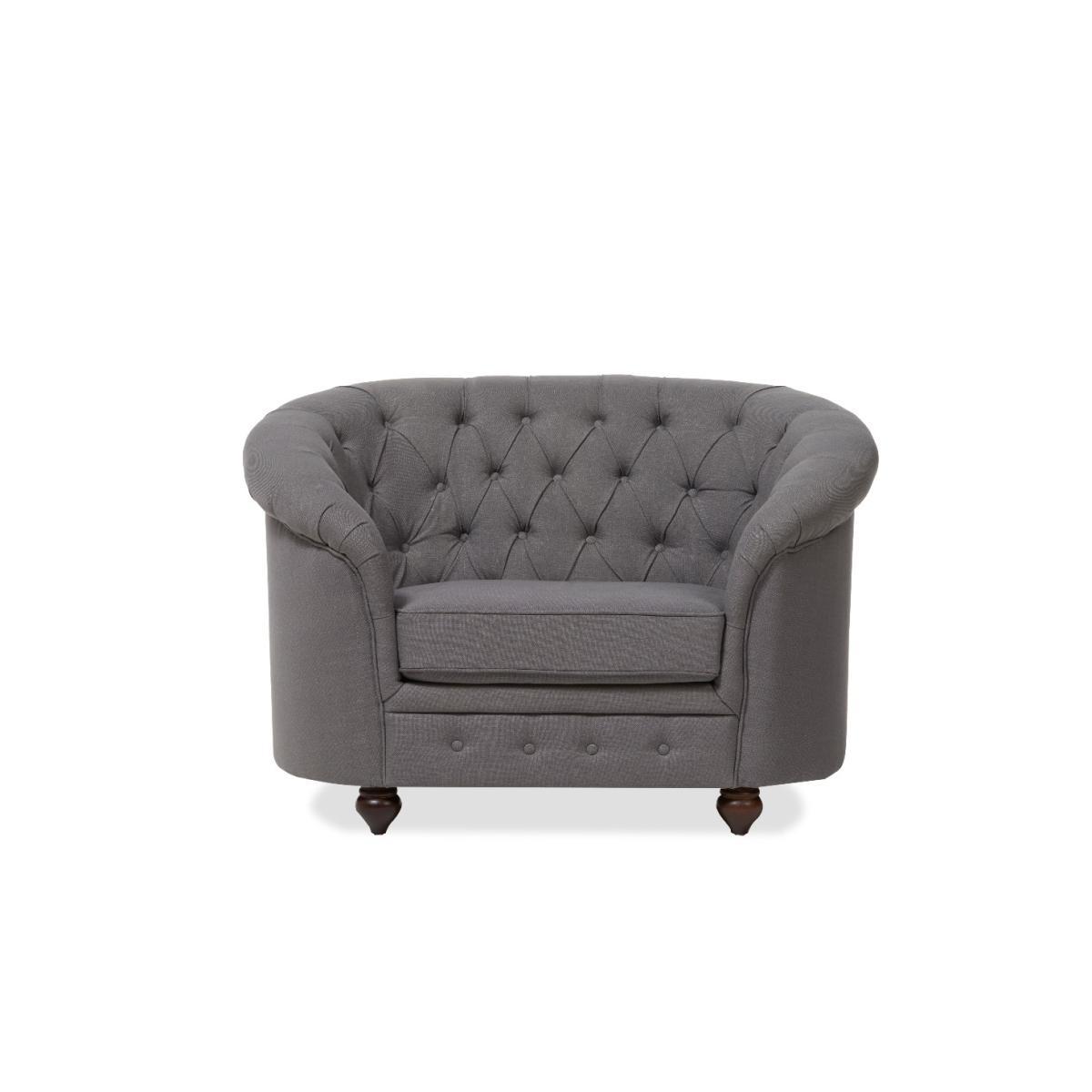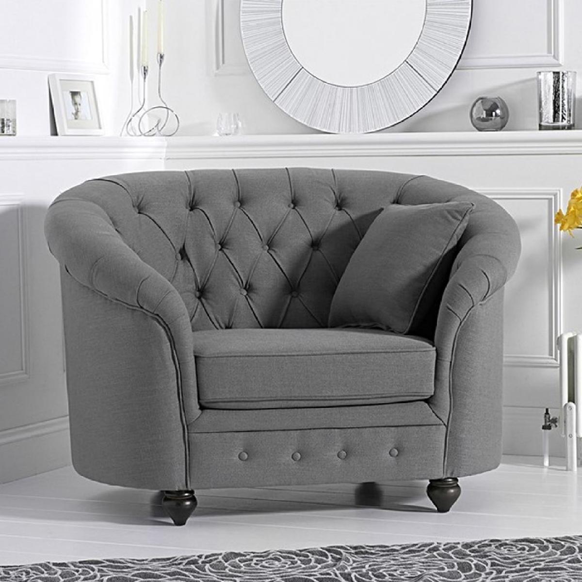 Either as part of the Chloe suite or as an accent chair by itself, the Chloe Chesterfield Grey Armchair is sure to bring quality, comfort and style into your living room. Upholstered in a chic grey linen, this sofa features Chesterfield-inspired design features such as the tufted button detail, high arms that blend into the backrest, a comfortable structure of firm S-springs, and perfectly turned solid ash feet. This armchair comes with one free scatter cushion in a complementary shade of grey.*Comes with one free 40 x 40cm scatter cushion.