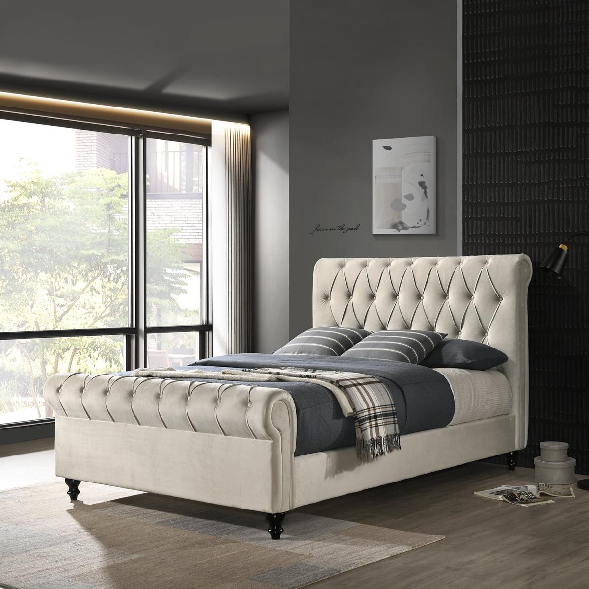 Our Chloe Bedframe brings style in spades. Its smooth velvet upholstery and diamond detailing combine with the ornate feet and curved sleigh-bed footboard and headboard to create an elegant design. Traditionally sophisticated, this bed uses button detailing and sleek curves to offer a statement feature to any bedroom, while the neutral colouring keeps it on trend and maintains your chic aesthetic.