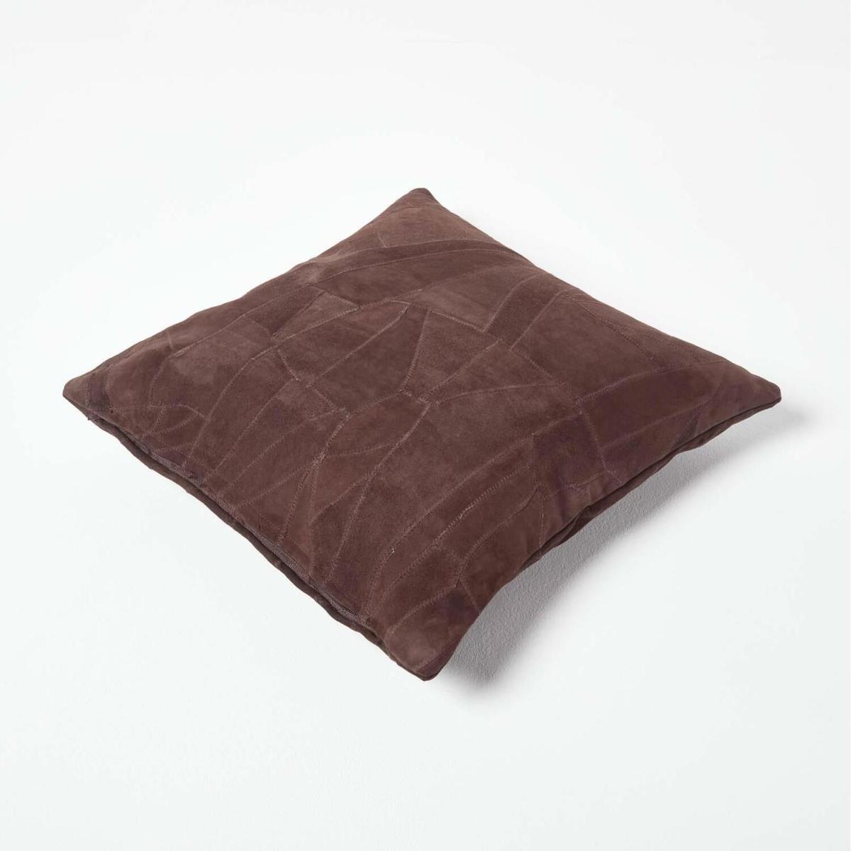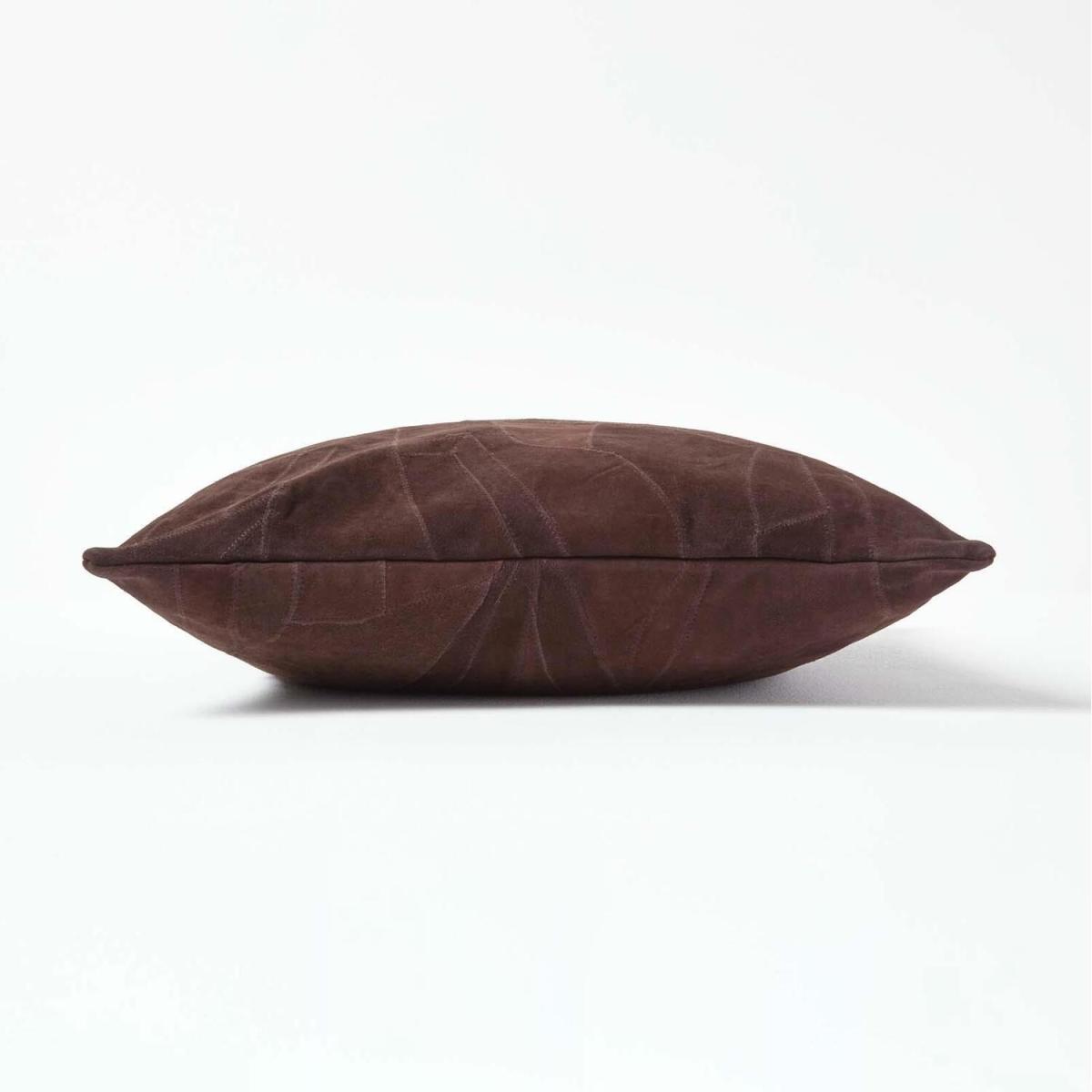 Handcrafted suede leather cushion cover from Homescapes to add design and texture to your home interiors. This cushion cover will easily complement any interior style. A natural fabric, suede feels soft and gentle to the touch, and the cover has been created out of recycled off cuts to reduce waste. This means that each cover is unique, as different off cuts are stitched together to create a patchwork style pattern. Mix and match with other colours from Homescapes suede and leather range such as cream and grey for a contemporary look that will never go out of style. The cover has a zip closure to make filling quick and easy and it has a cotton lining to protect the suede. Comes with a Homescapes feather cushion pad.