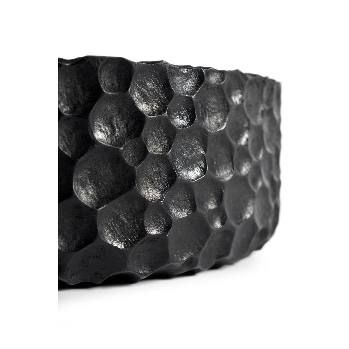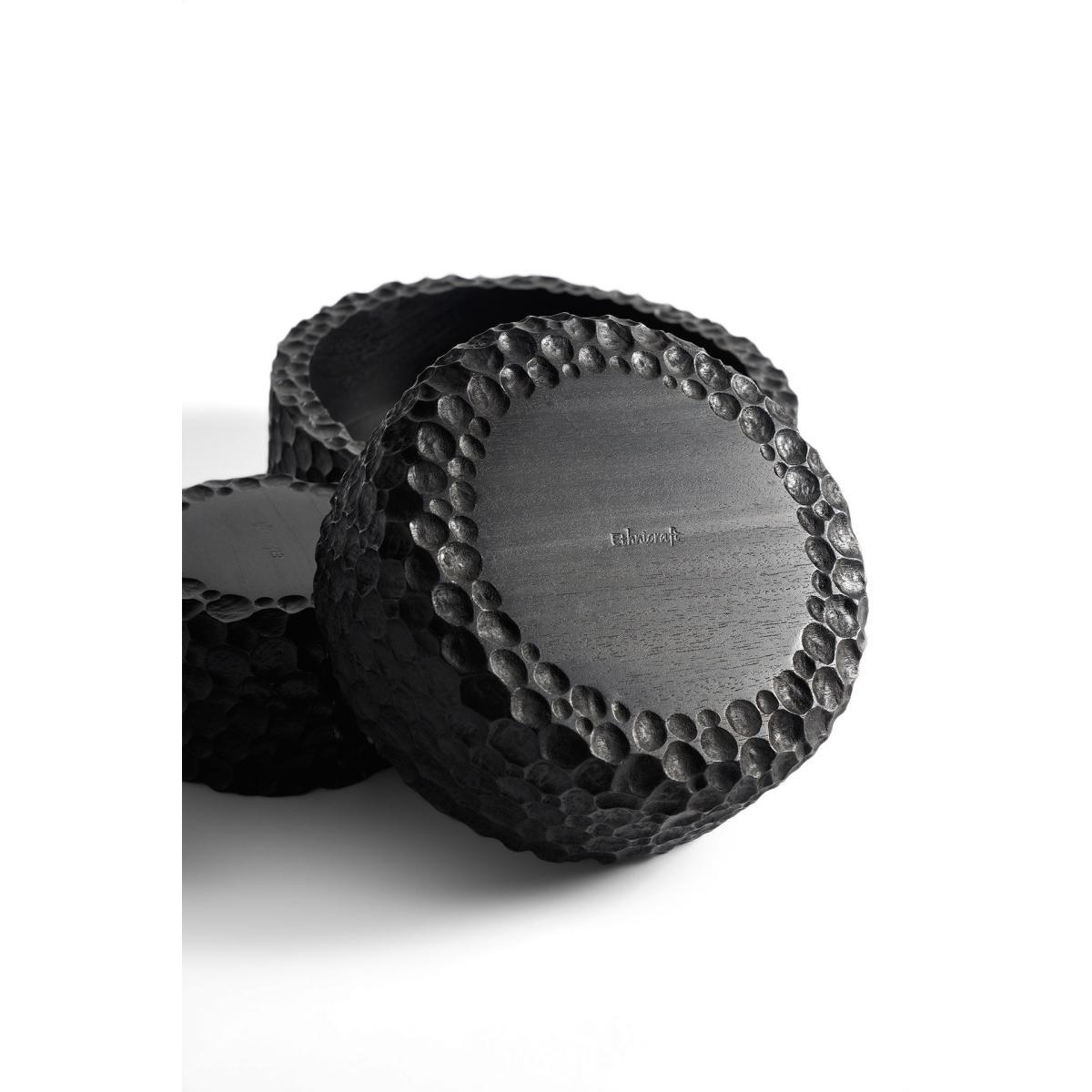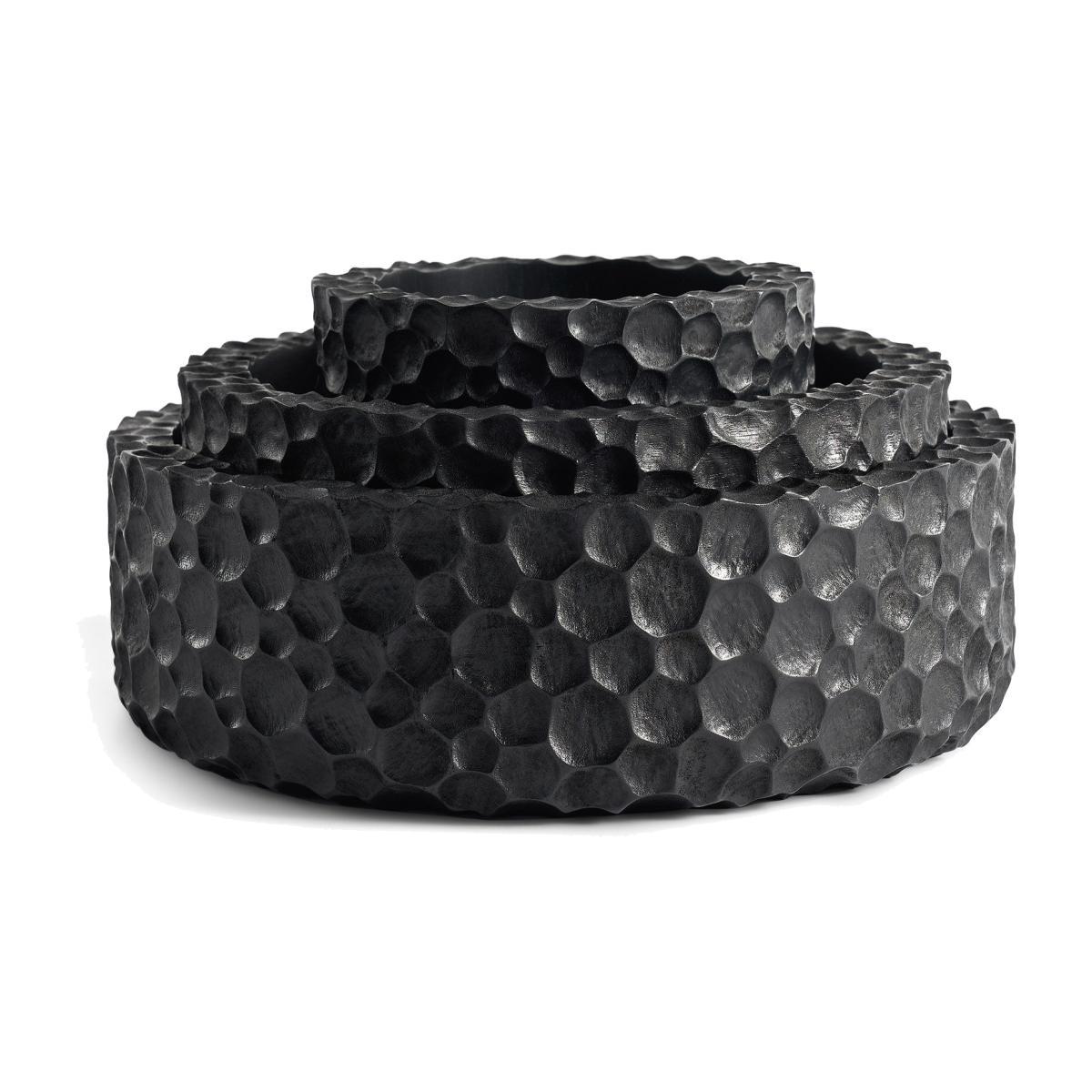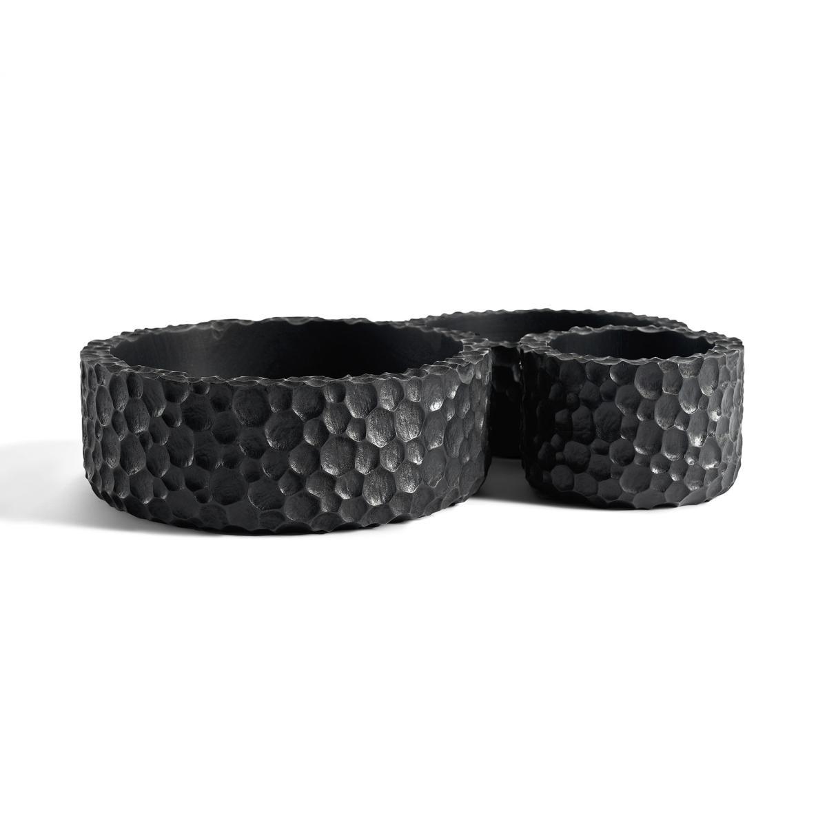 Arts & crafts trend. This set consists of three baskets carved by hand in solid mahogany. The textured surface is covered with a multitude of cavities. This irregular, organic surface reminds us of the cells of a beehive. Primary and primitive, these bumpy, wavy, imperfect forms draw the eye. Astonishing ornamentation which brings a twist to these minimalist pieces. These pieces are made by hand using traditional techniques. This manual production makes each item different. This is the mark of a unique, quality product.
