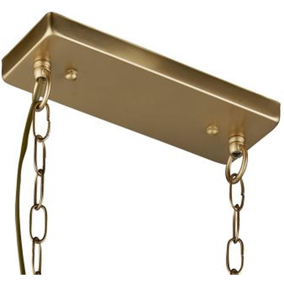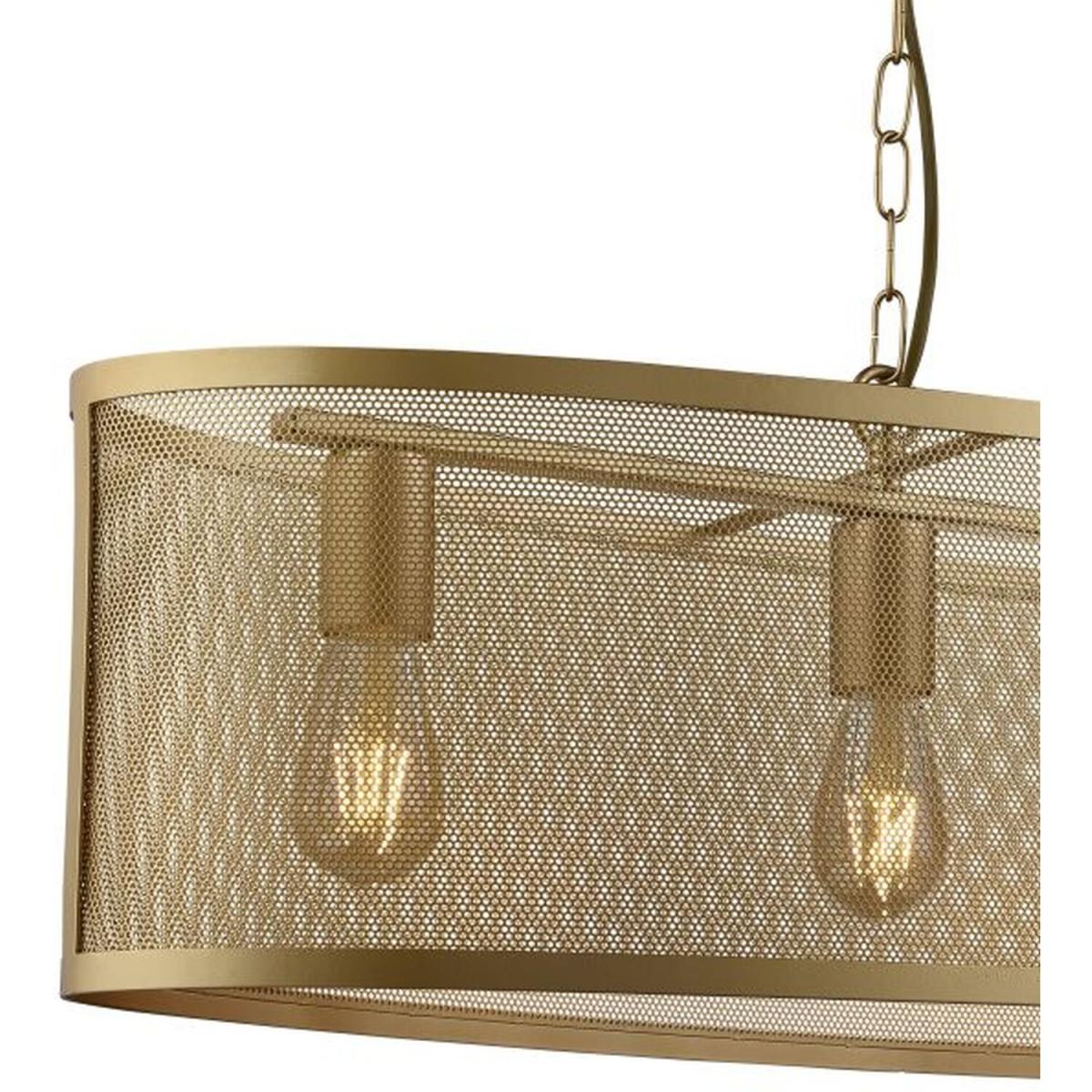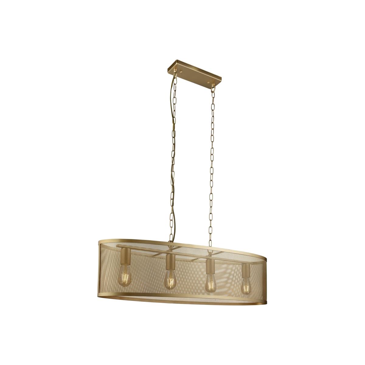 This stunning matt gold light pendant has 4 lamps within a beautiful golden mesh cage. This contemporary matt gold fitting would work in a dining, kitchen or living room. And hangs elegantly from the ceiling by 2 slim golden chains, meaning that the height can be adjusted to suit any room.
