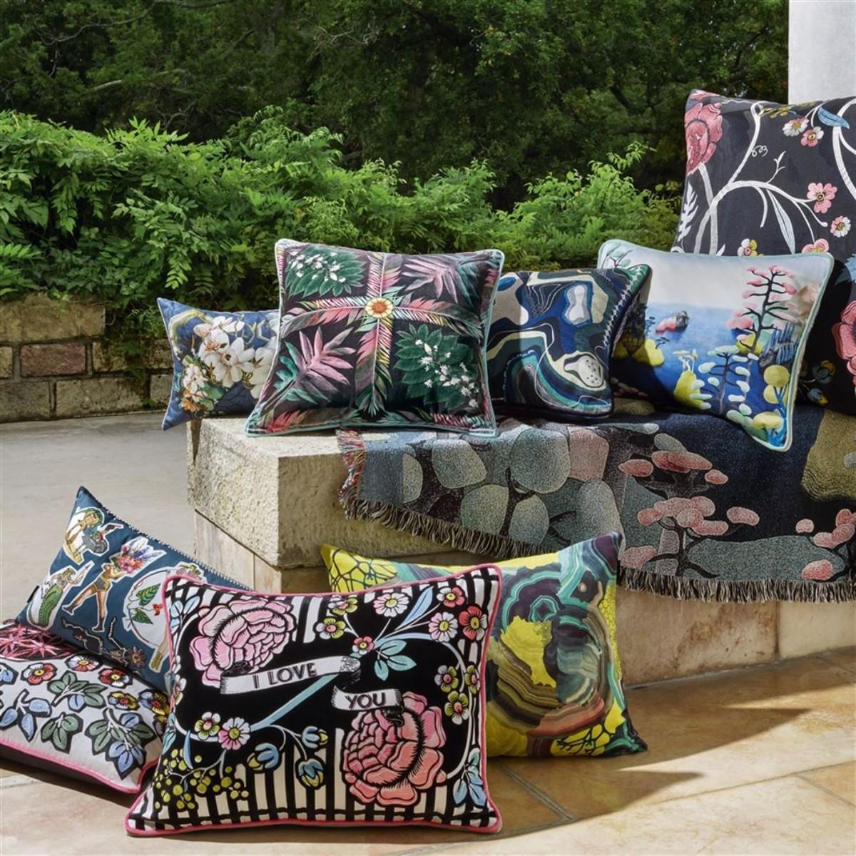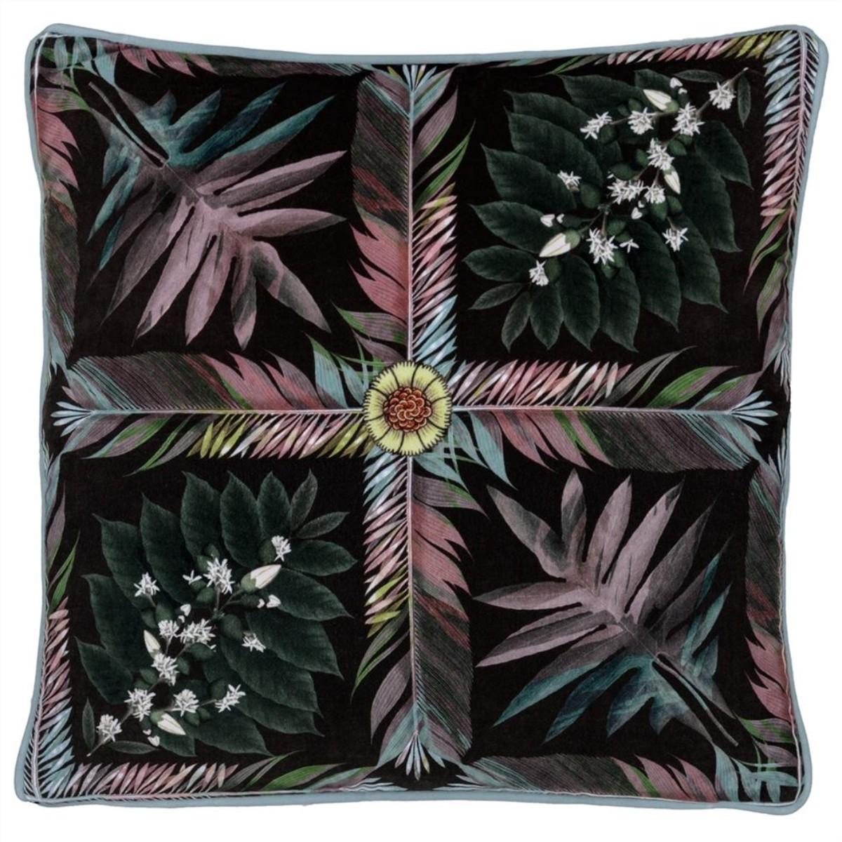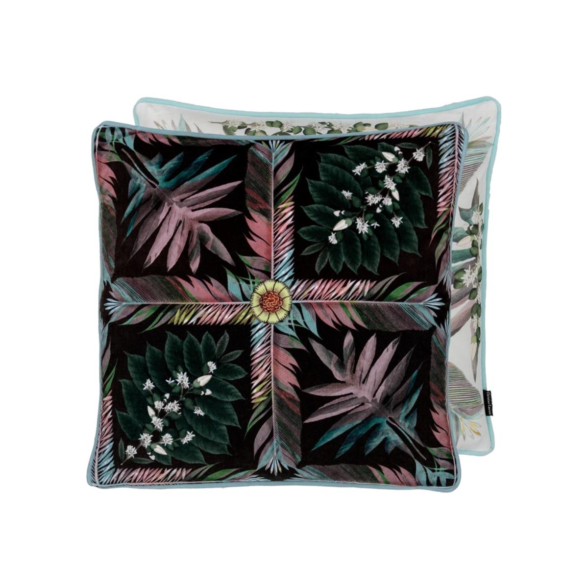 Graphic feather effect leaf and palm forms are overlaid with soft delicate shades of colour and shadows in this dramatic square cushion by Christian Lacroix. Digitally printed onto luxurious velvet this designer cushion reverses to an almost inverted form of the design on white cotton sateen and finished with turquoise velvet piping.