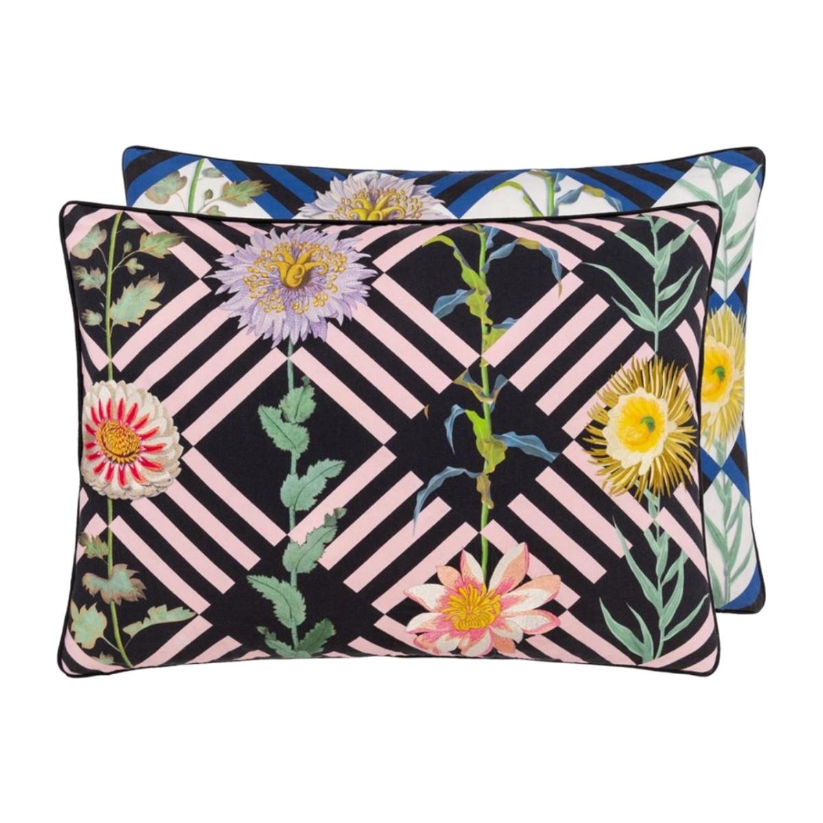 A chequerboard style pattern forms the backdrop of this stylish floral cushion by Christian Lacroix. Digitally printed onto luxurious cotton sateen this designer cushion is embellished with embroidered highlights on the front and finished with black sateen piping.