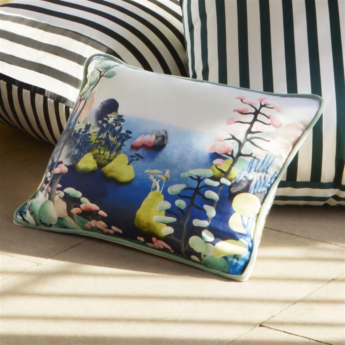 This decorative cushion by Christian Lacroix depicts an imaginative island paradise scene. Digitally printed onto luxurious cotton sateen and finished with a unique double piped border in jade and chalk velvet.