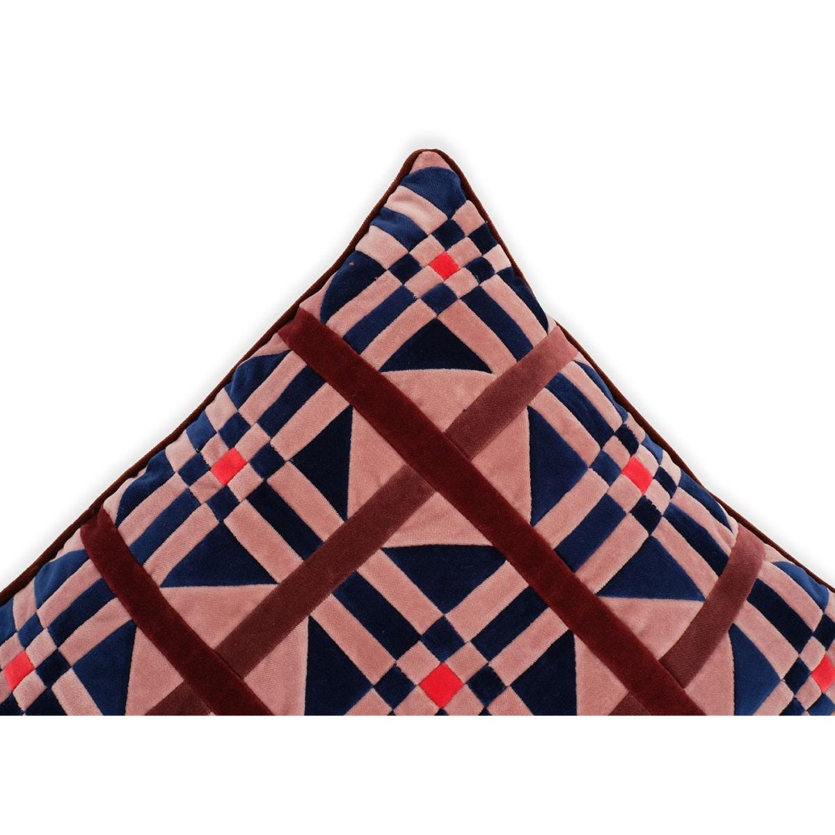 I love this cushion for its bold geometric pattern and rich colour palette, which makes it a versatile statement piece. It works particularly well in contemporary or eclectic interiors, adding visual interest without overpowering the space. For styling, consider pairing it with neutral sofa covers to let the pattern shine, or mix it with other textured textiles for a layered look. Its size is perfect for placing on a sofa or armchair as an accent, and I would recommend combining it with solid-coloured cushions to create a balanced, stylish scheme.