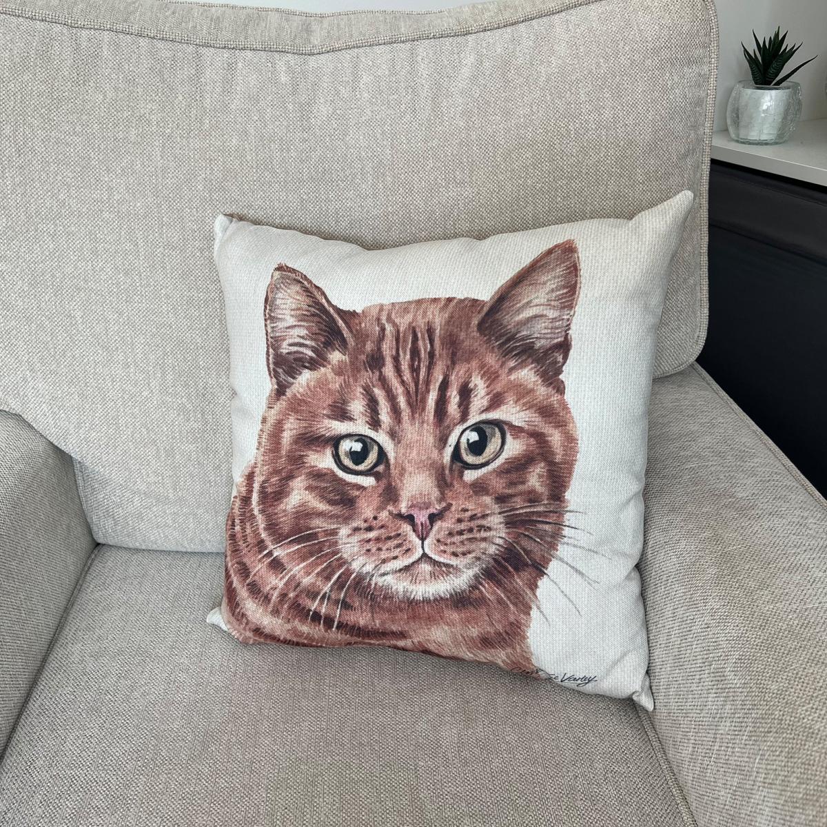 * Add a unique touch to your living space with this printed scatter cushion featuring:* Christine Varley Artist Illustrated Pet Portrait Imagery* 43cm Square Shaped Cushion* Edge to edge Print* Linen Feel - 100% Polyester Fabric* Contrast Back Panel* Luxurious recycled fabric fill* Zip fastened removable cover* Made in the UK This Ginger Cat Square Cushion brings a vibrant accent to your decor with Christine Varley's charming illustration of a ginger cat. Made from linen-feel polyester with a contrast back panel, the 43cm cushion features luxurious recycled fabric filling and a zip-fastened removable cover, made in the UK.