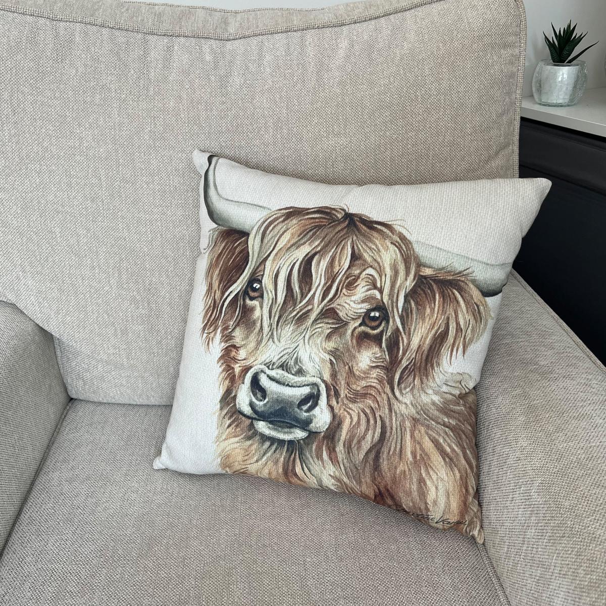 * Add a unique touch to your living space with this printed scatter cushion featuring:* Christine Varley Artist Illustrated Pet Portrait Imagery* 43cm Square Shaped Cushion* Edge to edge Print* Linen Feel - 100% Polyester Fabric* Contrast Back Panel* Luxurious recycled fabric fill* Zip fastened removable cover* Made in the UK The Highland Cow Square Cushion offers a delightful touch to your home with Christine Varley's vibrant illustration of a Highland cow. This 43cm cushion, featuring linen-feel polyester fabric with a contrast back panel, is filled with luxurious recycled material and has a zip-fastened removable cover, crafted in the UK.
