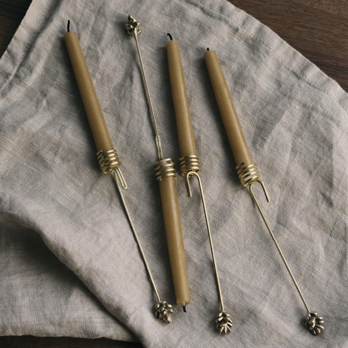 These little gilded brass candle holders adorned with small pine cones will dress up your Christmas tree like fine jewels. They are easily attached to the branches and let you light up your tree with candles. They hold your candles in place while being a decorative element on the tree. For small, long candles Ø 12 mm (candles not included, sold separately). PLEASE NOTE. Make sure you extinguish the candle before it reaches the edge of the candle holder. Never leave a candle burning out of sight.