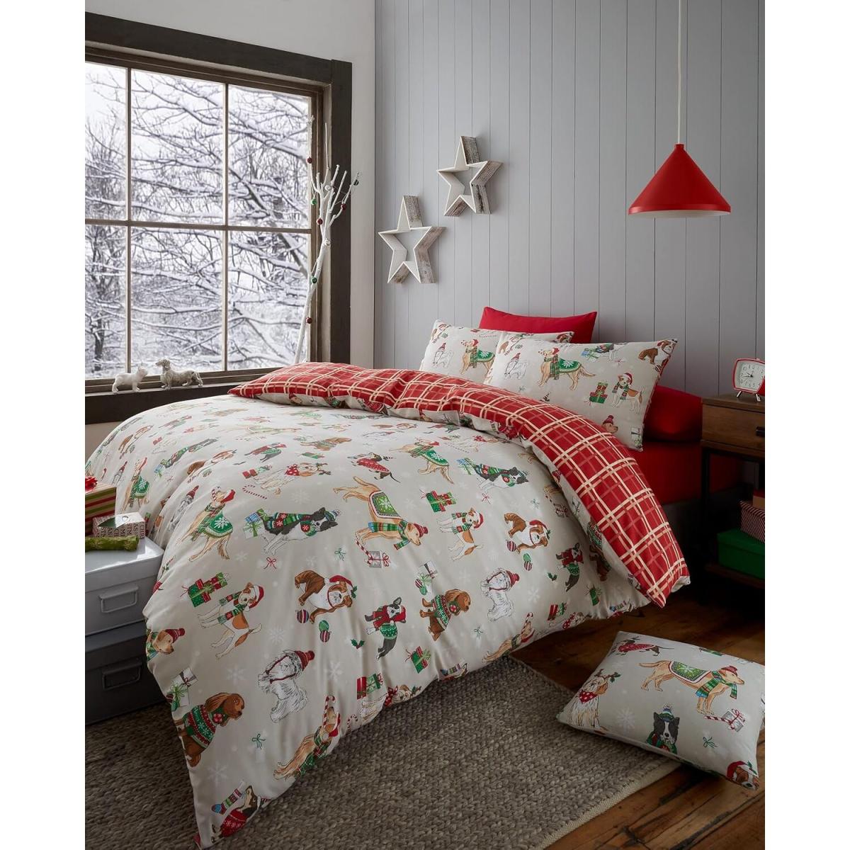 Bring festive cheer to your bedroom with this playful Christmas Dogs bedding set! Adorned with adorable holiday-themed dogs dressed in colourful scarves, sweaters, and Santa hats, this set is perfect for any dog lover looking to add some seasonal spirit. The light taupe background allows the vibrant green, red, and white accents to pop, creating a whimsical and joyful atmosphere. The reverse side features a bold red and yellow plaid pattern, offering a cozy, rustic contrast to the cute dog design. Made from soft, durable fabric, this bedding set is both comfortable and long-lasting, keeping you warm throughout the holiday season. Whether it's for a guest room or your own, this charming bedding adds a fun and festive touch, making it perfect for winter nights and holiday decor.