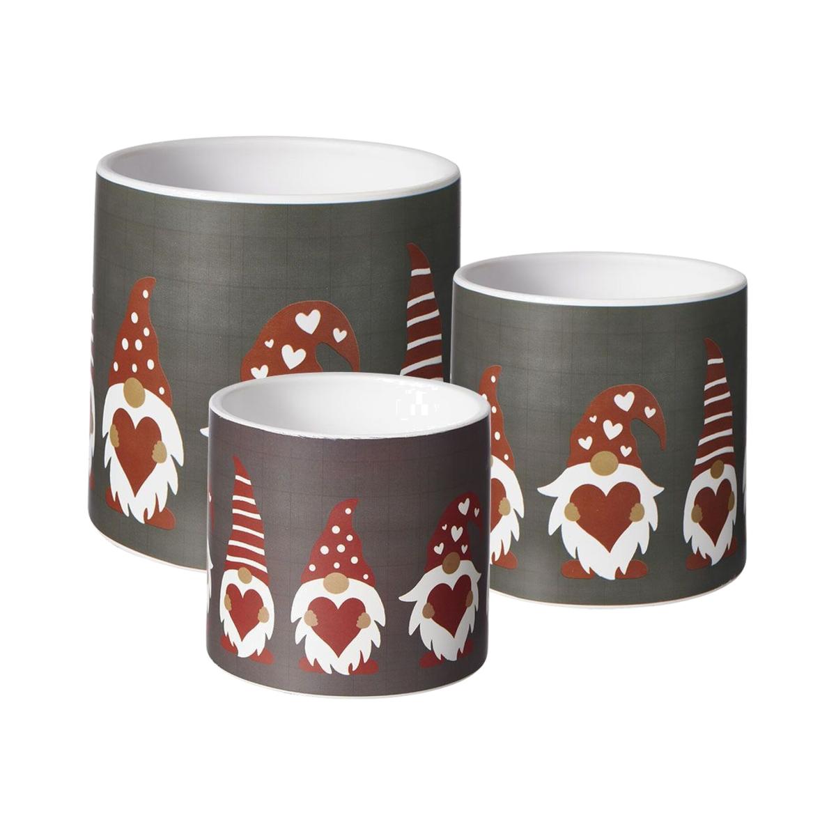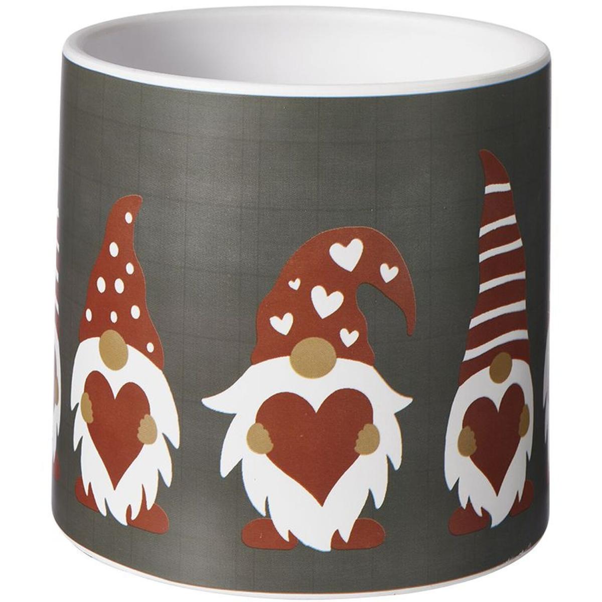 This charming Elf pot is perfect for potting poinsettias or any festive plant or flower display. Elf print design on a white ceramic pot. 2 sizes available. No drainage holes.