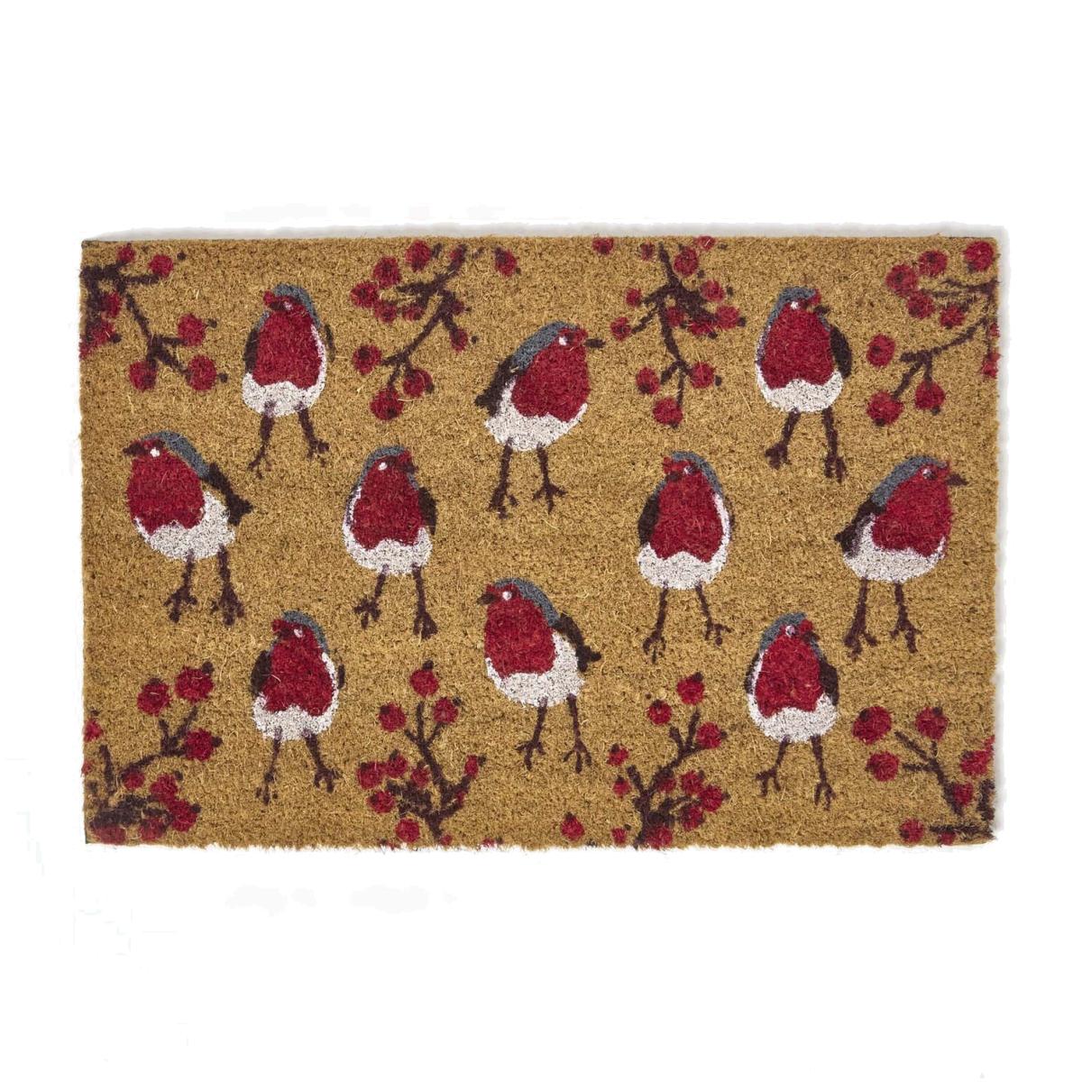 Get your home ready for the festive season with Homescapes' Christmas door mats outdoor! Add a touch of holiday elegance with this fun Christmas doormat featuring Christmas red robins and red berries. This trendy Xmas door mat meaures 60 x 40cm. Made from 100 coir with an anti-slip PVC backing. With its thick PVC backing, this non slip mat is durable and suitable for all grounds, including tiles, wood, pebbles and brick and will remain sturdy and in place whatever the weather. Suitable outside door mats for front door or door mats indoor. This welcome mat will be the perfect addition to your home. Whether welcoming friends and family or simply enhancing your festive holiday decorations, this versatile Christmas doormat will fit in perfectly at entryways, front doors and entrances. Low-maintenance and easy to care for outdoor mat. To keep your christmas mat clean, it is recommended that you shake dirt and brush mud off regularly outdoors. Part of Homescapes' collection of doormats the range includes coir door mats, boots scrapers and boot trays. Complete the look with Homescapes collection of festive home accessories.