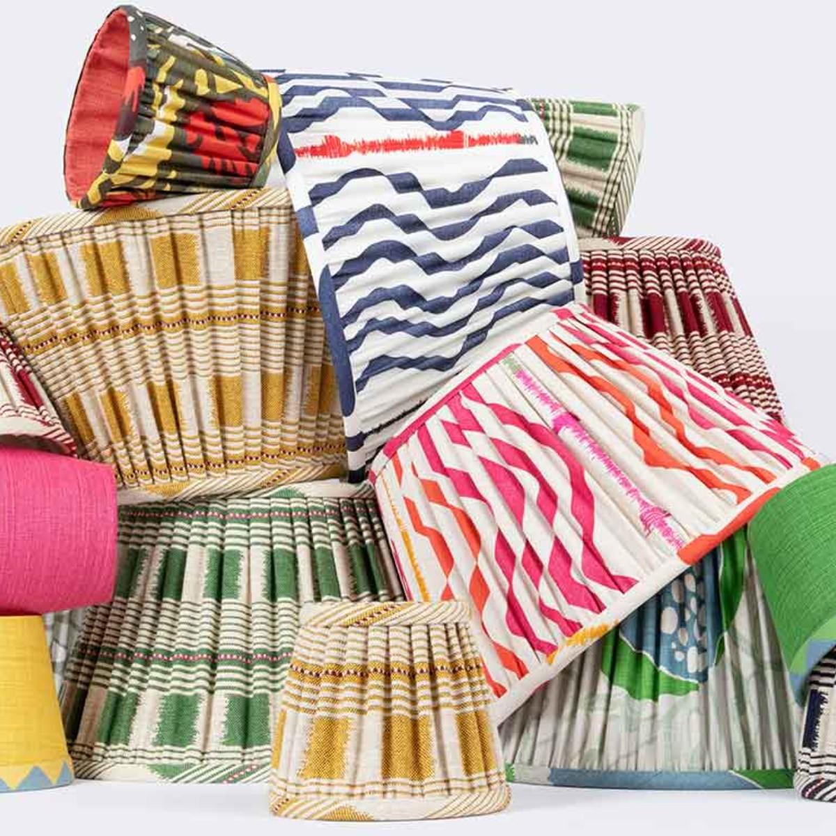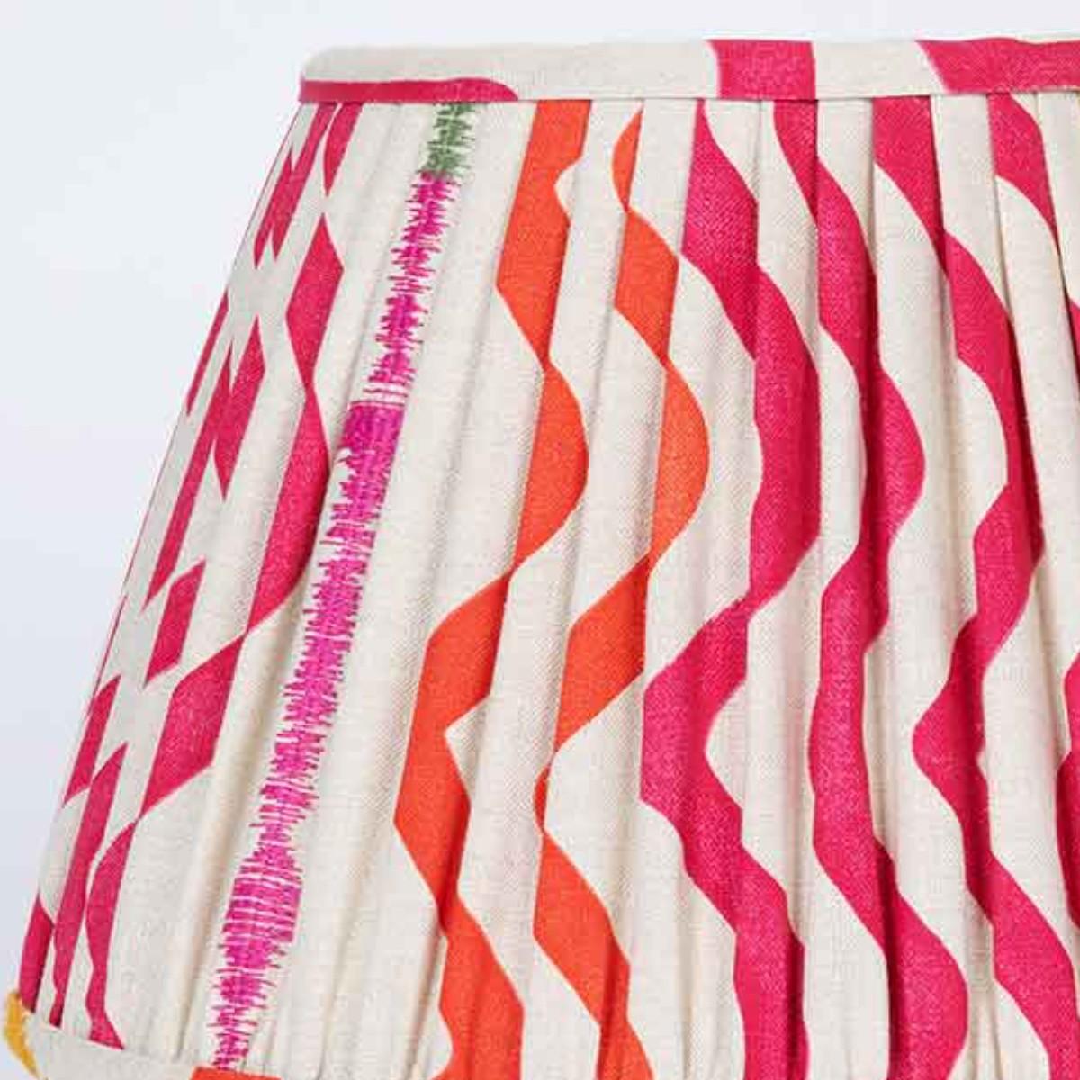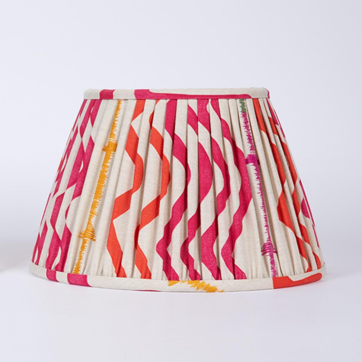 Illuminate your space with Christopher Farr Cloth's charming 14” Rick Rack Lampshade with a UK/EU Fixed Gimbal fitting, crafted from vibrant Hot Pink Rick Rack Kit Kemp fabric, printed in Ivos London and enhanced with hand-guided embroidery. This delightful shade boasts a captivating pleated design on a robust 14" metal frame, lined with luxurious Malmedy Linen in Natural. It effortlessly infuses a playful elegance that brightens any room. Handcrafted in London with meticulous attention to detail, this lampshade is more than just a lighting fixture—it’s a distinctive statement piece that adds warmth and personality to your home. Lampshades from Christopher Farr's CLOTHSHOP collection feature beloved best-selling fabrics and are available in two sizes: 6" and 14" for the UK, EU, and US markets. If you’re interested in a custom-sized lampshade, please get in touch—we're delighted to accommodate your request! Please note that the lead time for custom orders is four weeks, and prices may vary for bespoke designs.