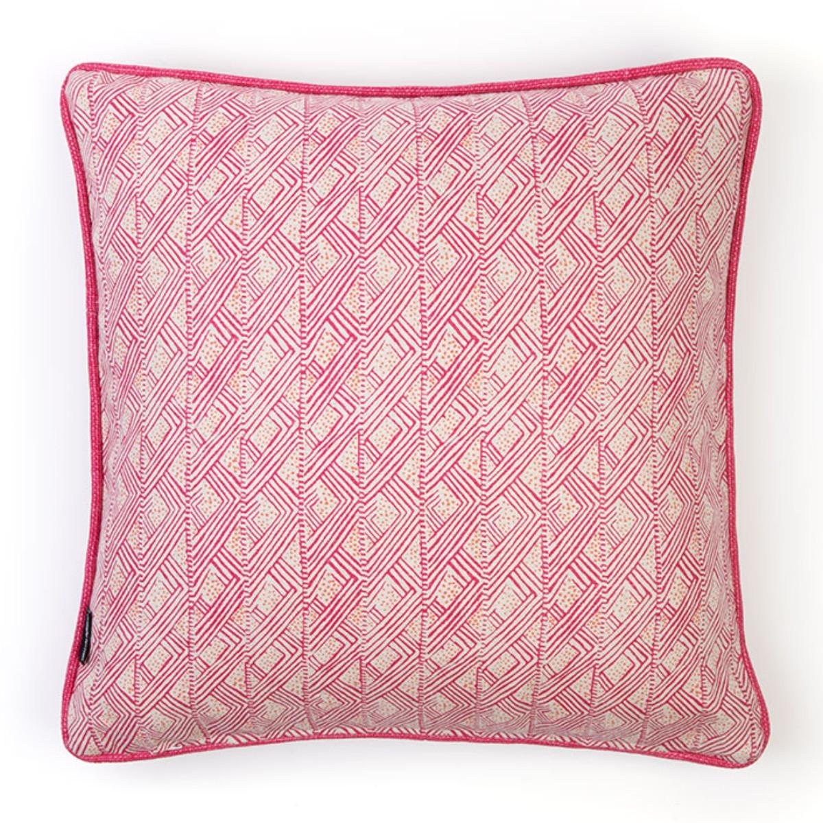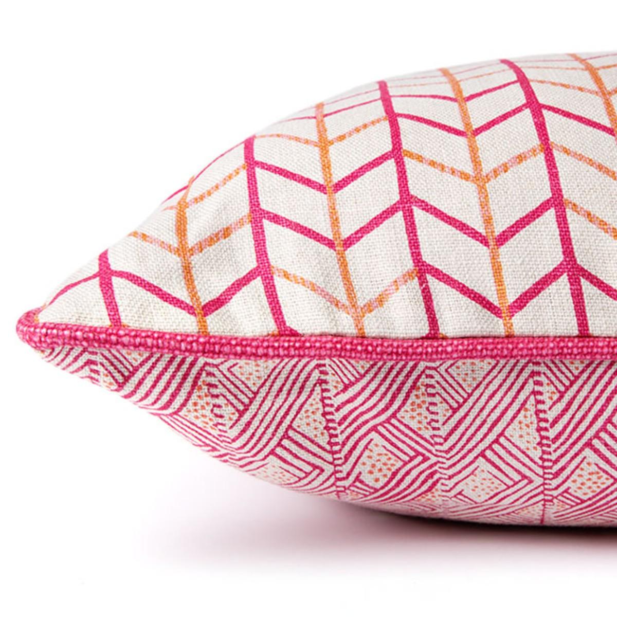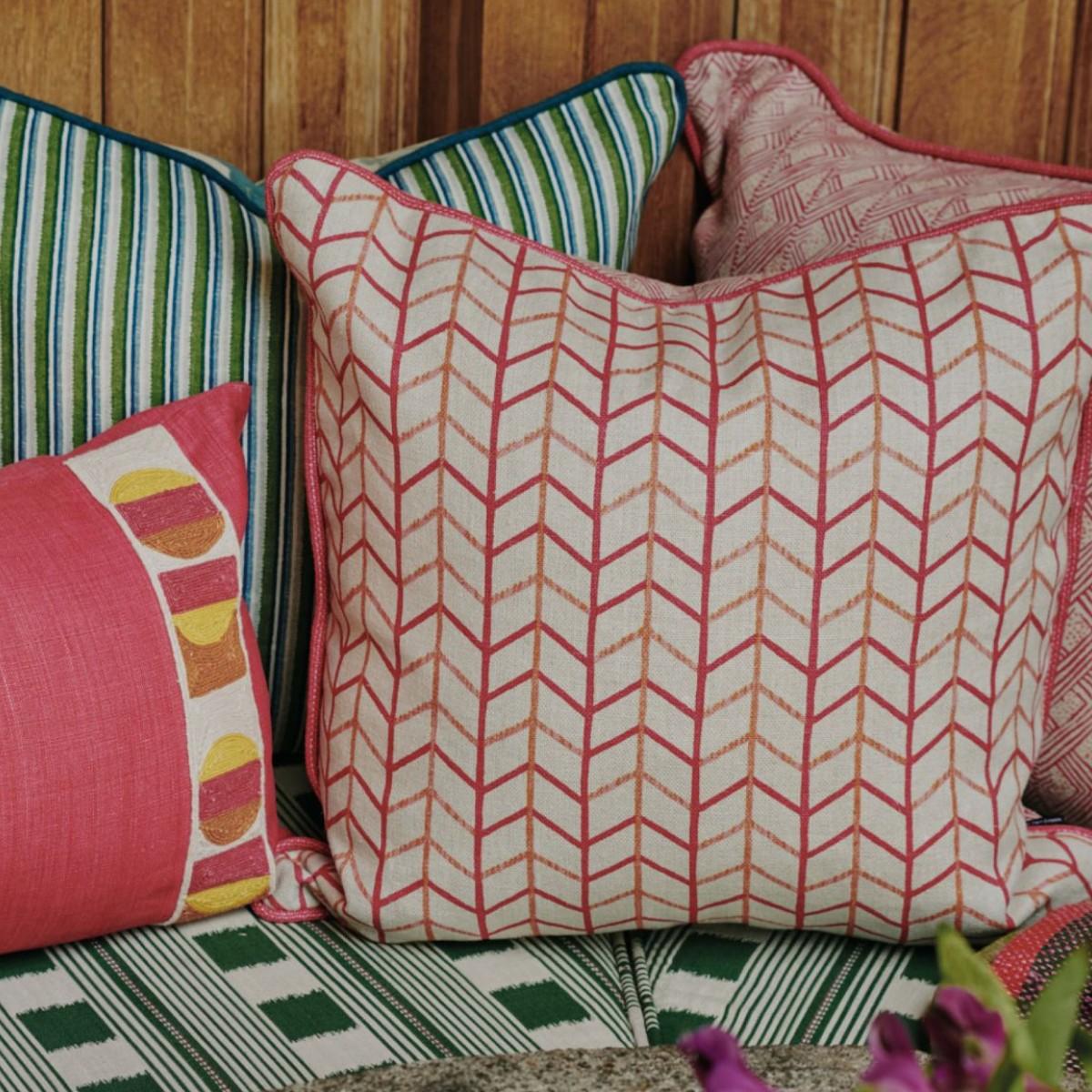 Barron and Larcher’s striking hand block printed design ‘Belge’ is combined with Kit Kemp’s geometric ‘Small Way’ print, and finished with a hot pink trim. Cushion panels are cut at random from the fabric. If you have a specific cushion placement in mind, we offer a bespoke service to ensure the desired section of the pattern is highlighted. Please note that this may impact pricing and delivery lead times. We recommend contacting us before placing your order to discuss your request.