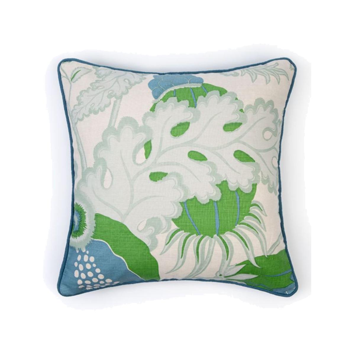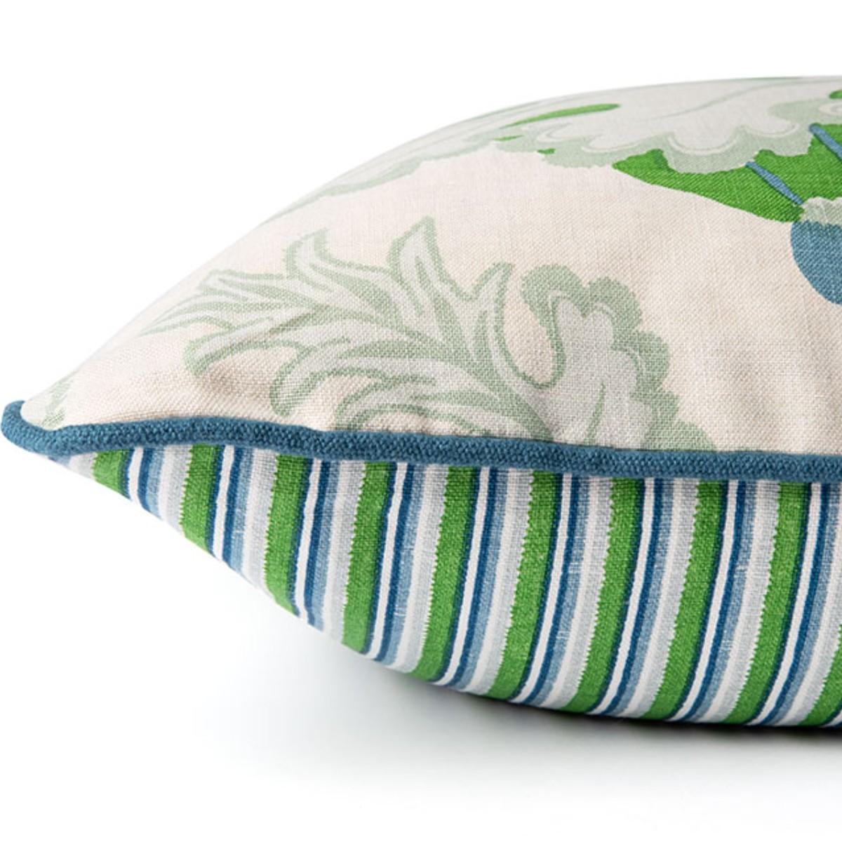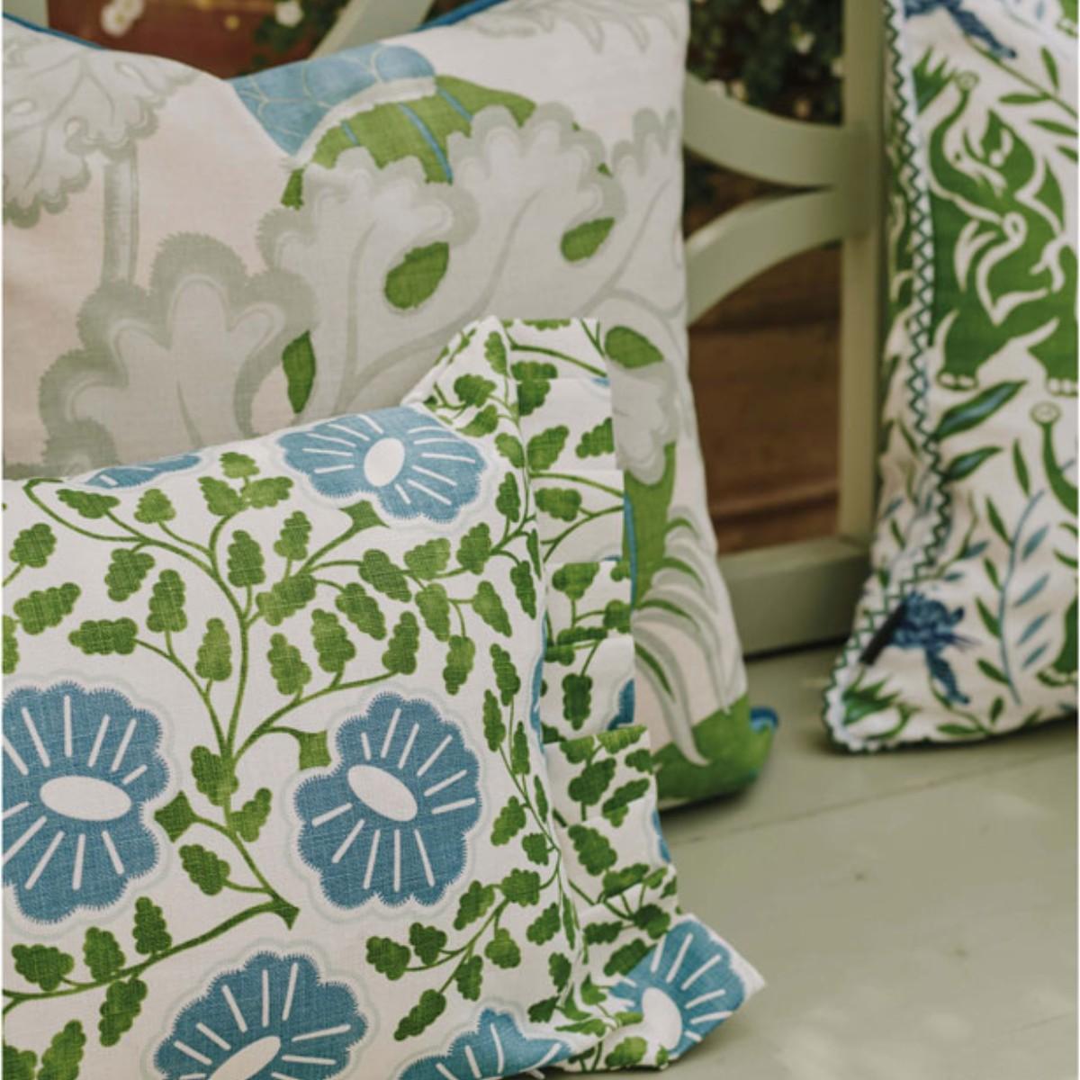 Christopher Farr Cloth's best-selling 'Carnival' botanical print from the archives of Michael Szell, combined with the 'Peace & Love' colourful stripe by Kit Kemp, and finished with a smart blue trim. Cushion panels are cut at random from the fabric. If you have a specific cushion placement in mind, we offer a bespoke service to ensure the desired section of the pattern is highlighted. Please note that this may impact pricing and delivery lead times. We recommend contacting us before placing your order to discuss your request.