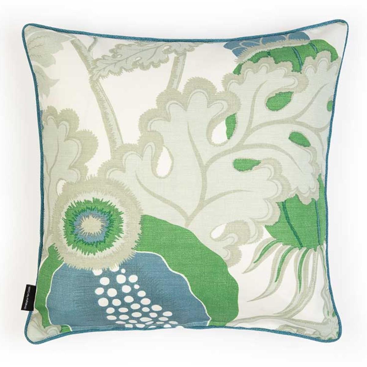 Christopher Farr Cloth's best-selling 'Carnival' botanical print from the archives of Michael Szell, finished with an outdoor Veretelli Turchese trim.