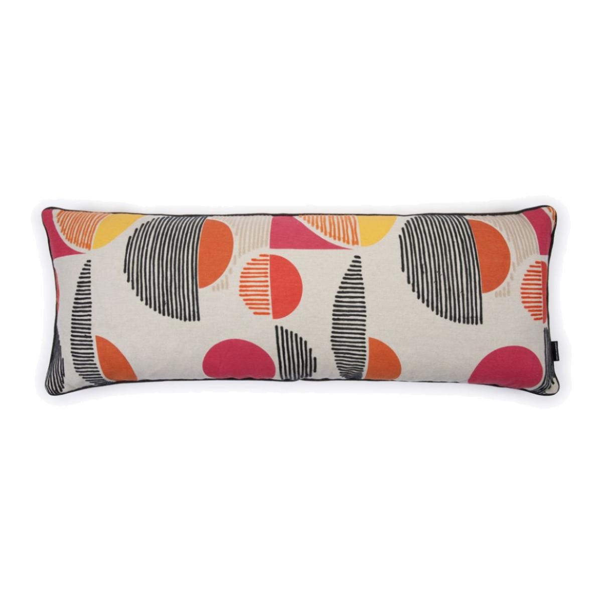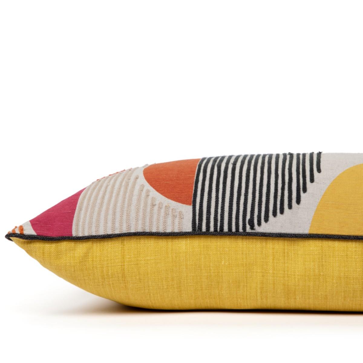 The Galaxie bolster cushion by Véronique de Soultrait features a celestial-inspired design with overlapping circular forms on a cotton base, blending printed and embroidered elements for a visually dynamic and unique accent. 'Galaxie' is part of Christopher Farr Cloth's new collection, Atelier Véronique, which is a unique collaboration with French artist Véronique de Soultrait. Véronique is known for her intricate embroidered art, which features small geometric and organic patterns crafted from rope and rustic elements. Her designs, typically seen on room dividers and curtains, have been reimagined in this collection. Her signature embroidered patterns have been seamlessly integrated with Christopher Farr Cloth's curated colour palette, resulting in exquisite curtain-weight fabrics. Each piece is meticulously hand-embroidered in India on cotton base cloth and jute, with careful attention to detail, preserving the textured rope elements that define Véronique's works. The collaboration with Véronique de Soultrait really brings out a celestial elegance in the design. The interplay of circular forms and overlapping shapes evokes the mesmerising patterns of the night sky, combining both printed and embroidered elements to create a rich, dynamic texture. It’s like having a piece of the cosmos right in your living space. The cotton base cloth ensures comfort, while the intricate design adds a sophisticated touch. It must make a beautiful statement as both a decorative and functional piece!. Cushion panels are cut at random from the fabric. If you have a specific cushion placement in mind, we offer a bespoke service to ensure the desired section of the pattern is highlighted. Please note that this may impact pricing and delivery lead times. We recommend contacting us before placing your order to discuss your request.