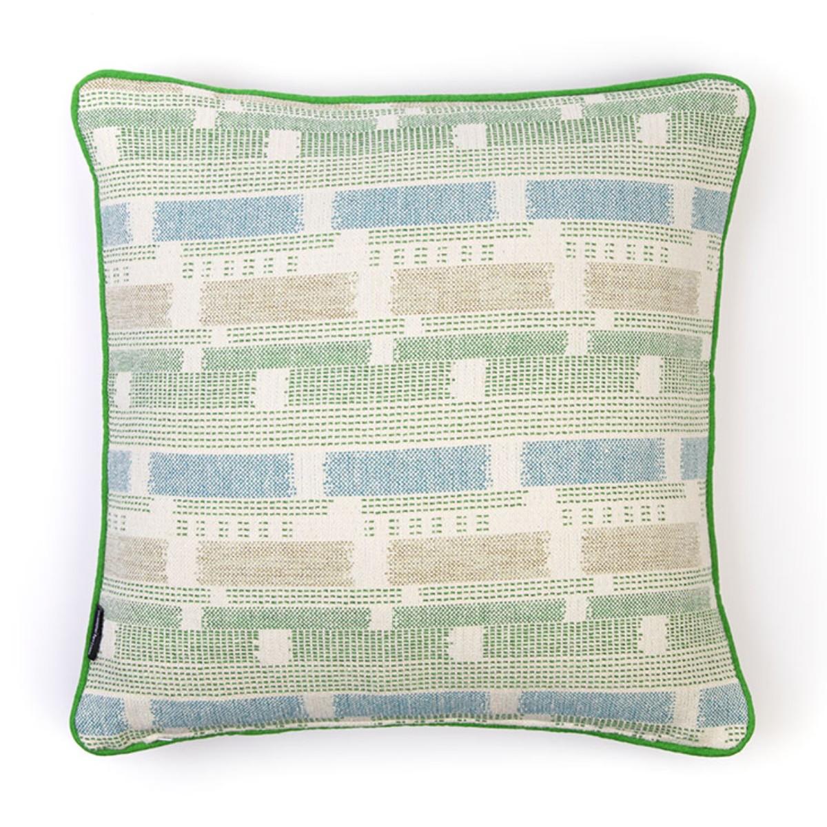 Combining two of Kit Kemp's best loved designs with the ‘Small Way’ geometric print and ‘Loom Weave’ woven design on the reverse, and finished with a vivid green trim. Cushion panels are cut at random from the fabric. If you have a specific cushion placement in mind, we offer a bespoke service to ensure the desired section of the pattern is highlighted. Please note that this may impact pricing and delivery lead times. We recommend contacting us before placing your order to discuss your request.