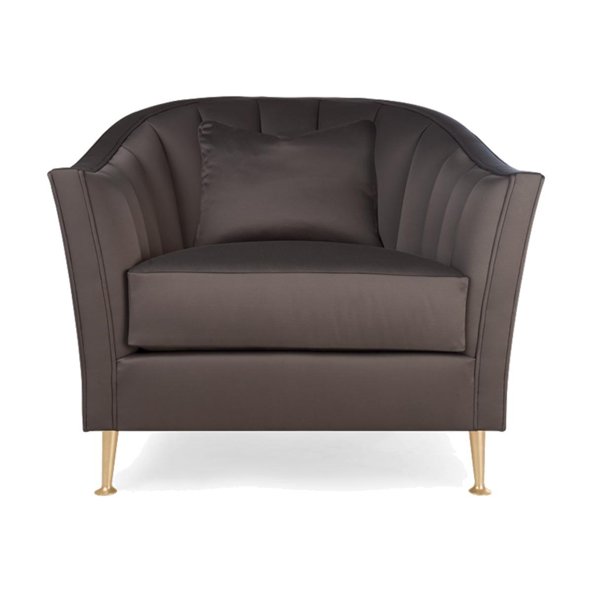 The distinctively upholstered back in a scalloped design flows elegantly into the sumptuous seat cushion of this occasional chair. Sweeping arms are complemented by hand-wrought metal legs.