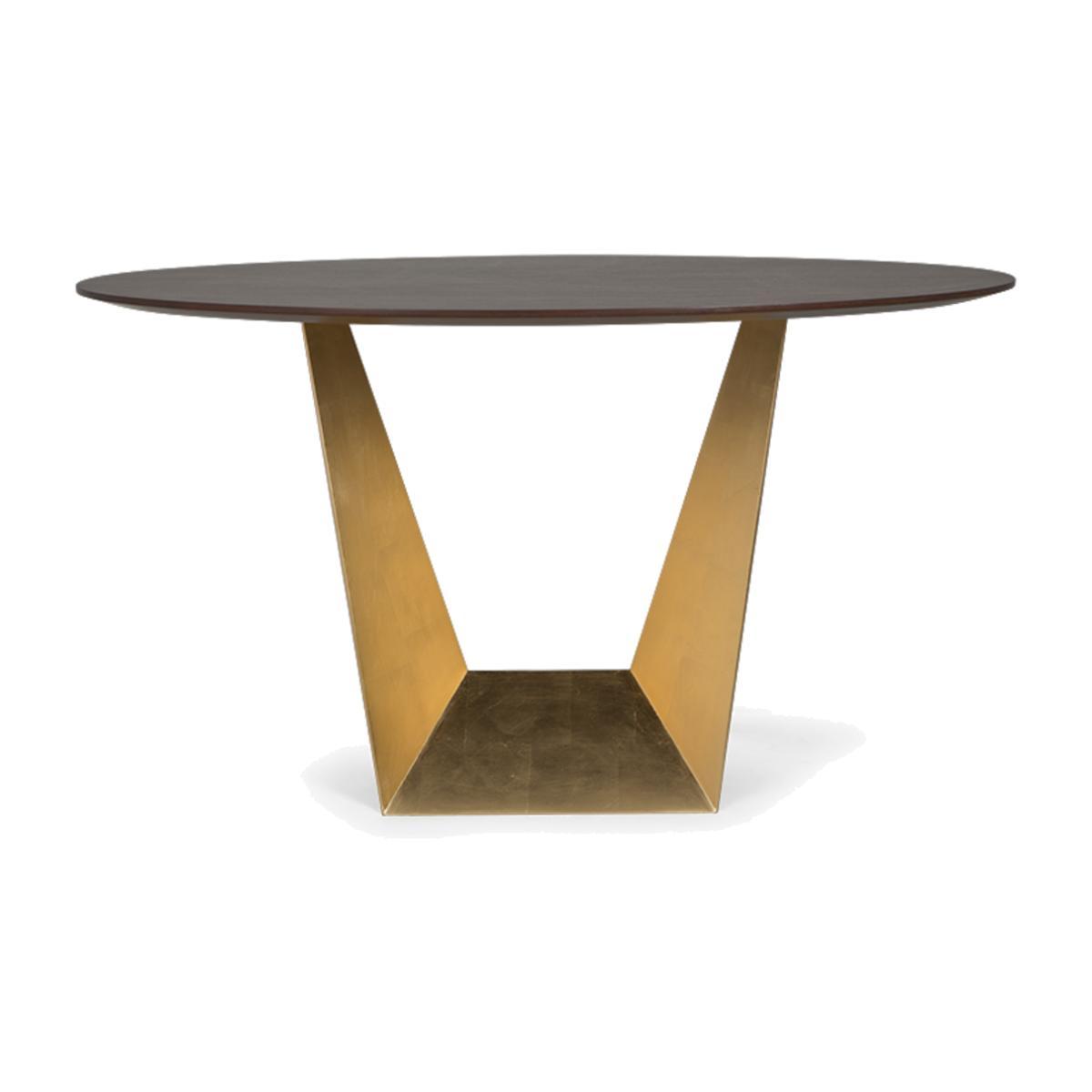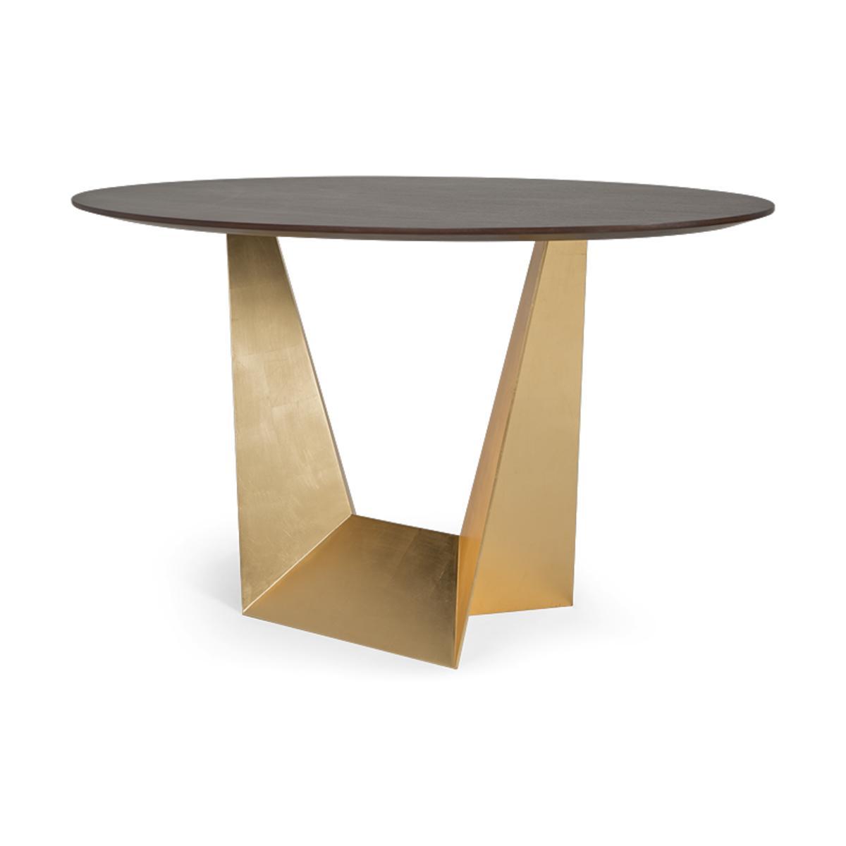 I’m drawn to the Calatrava table’s bold geometric brass base paired with a slender dark-wood top - it makes a strong visual statement without feeling overbearing. It sits beautifully in contemporary or minimalist schemes, where its sculptural form can act as a focal point, but it also adds a touch of glamour in more eclectic or Art Deco-inspired rooms. For styling, keep the surroundings uncluttered: choose low-profile dining chairs in neutral upholstery or slim metal frames to let the base shine through. A simple ceramic bowl or a single sculptural vase works better than a crowded tablescape, and a subtle, neutral-toned rug will help define the area without competing for attention.